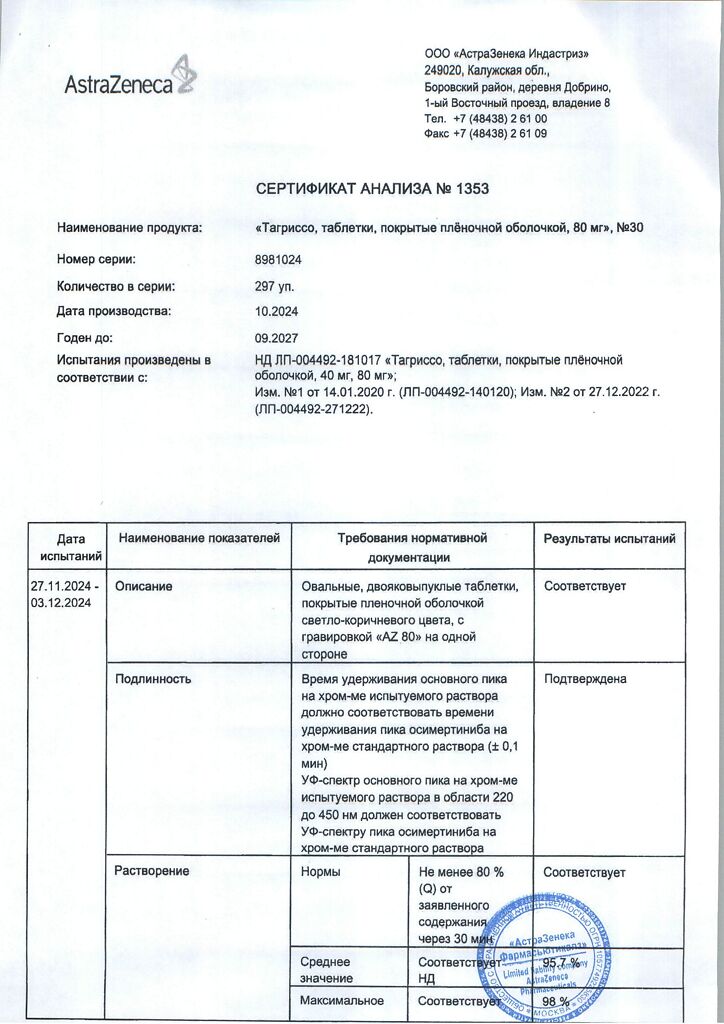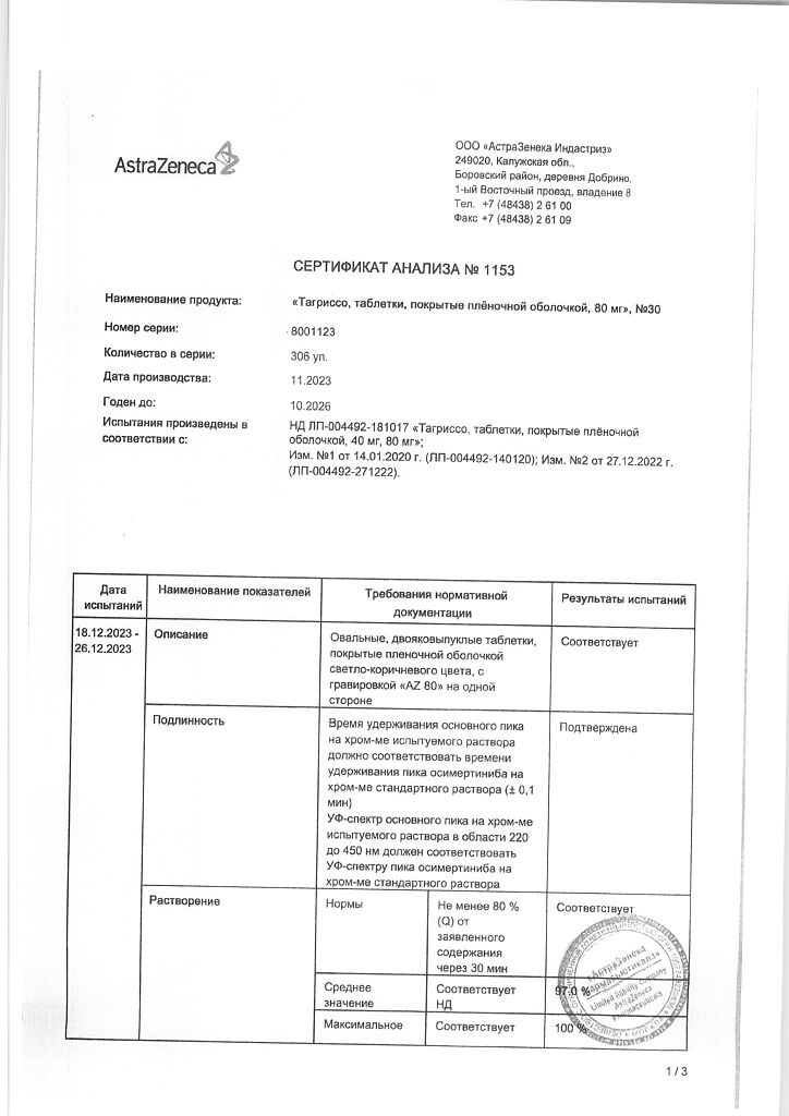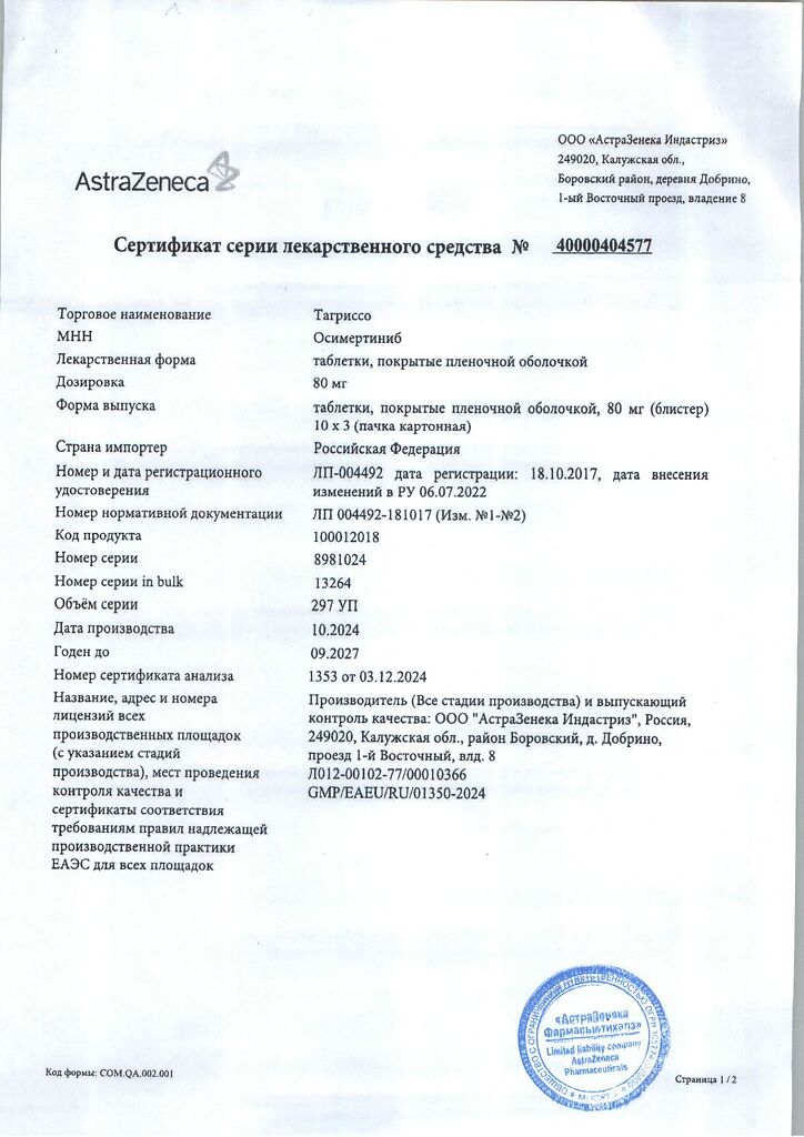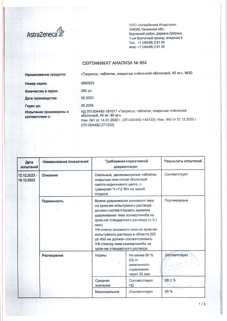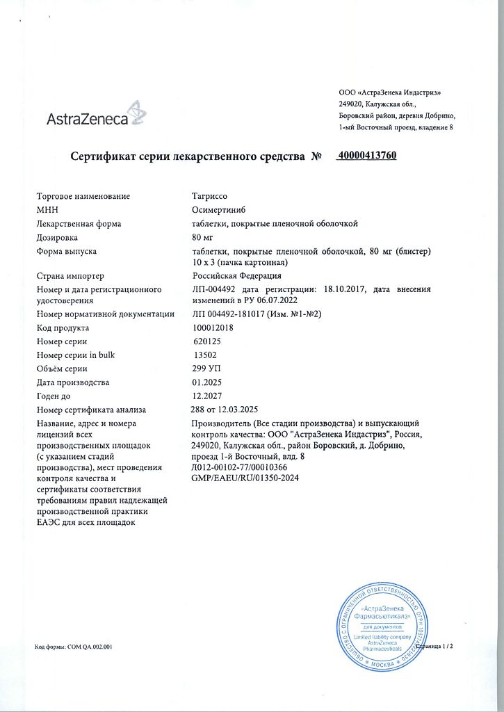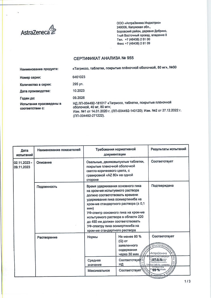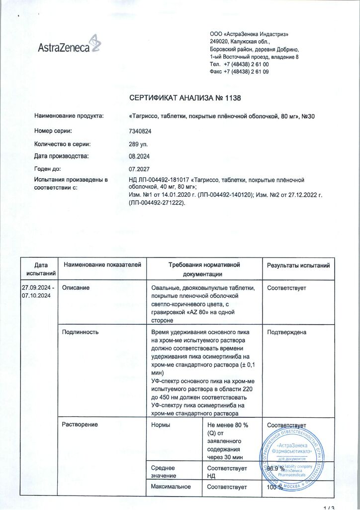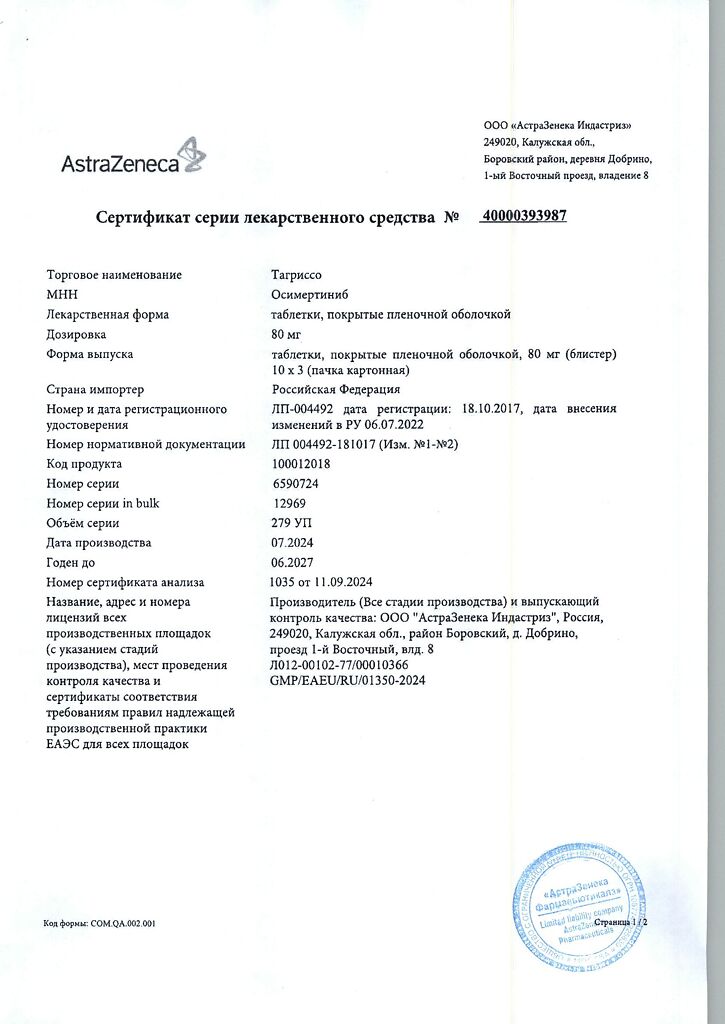 Для назначения препарата Тагриссо в качестве адъювантной терапии НМРЛ после полной резекции опухоли, необходимо подтвердить наличие мутации в гене EGFR (делеции в экзоне 19 или замены L858R в экзоне 21). Статус мутации необходимо определять в опухолевой ДНК, полученной из образца ткани опухоли (биоптата или операционного материала), с помощью валидированного теста в клинической лаборатории.