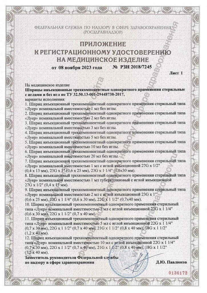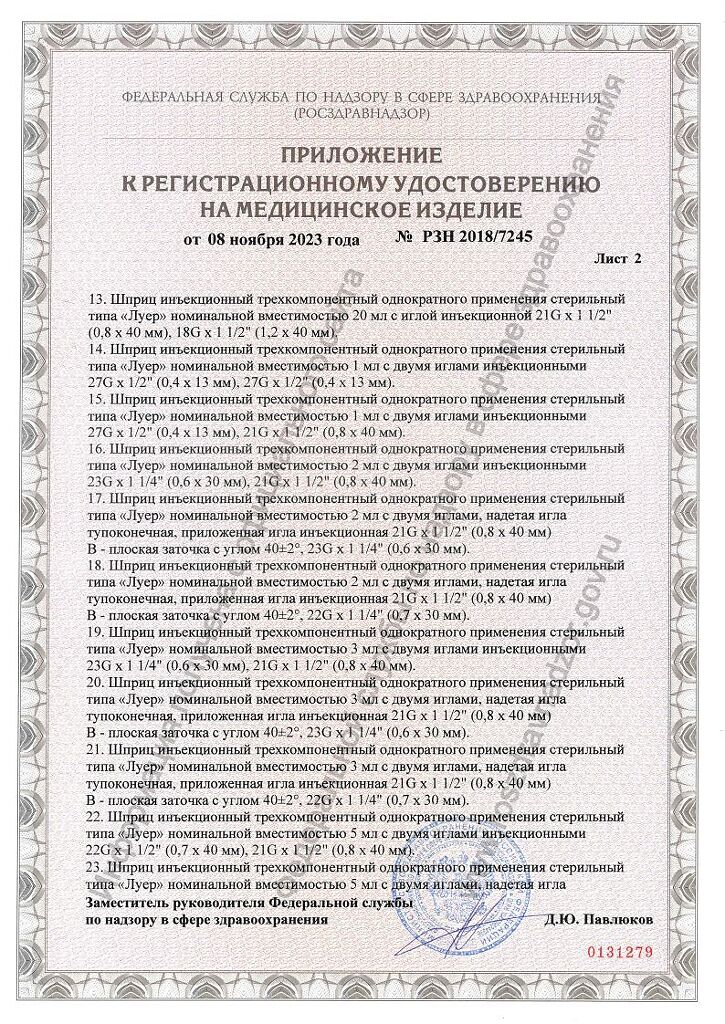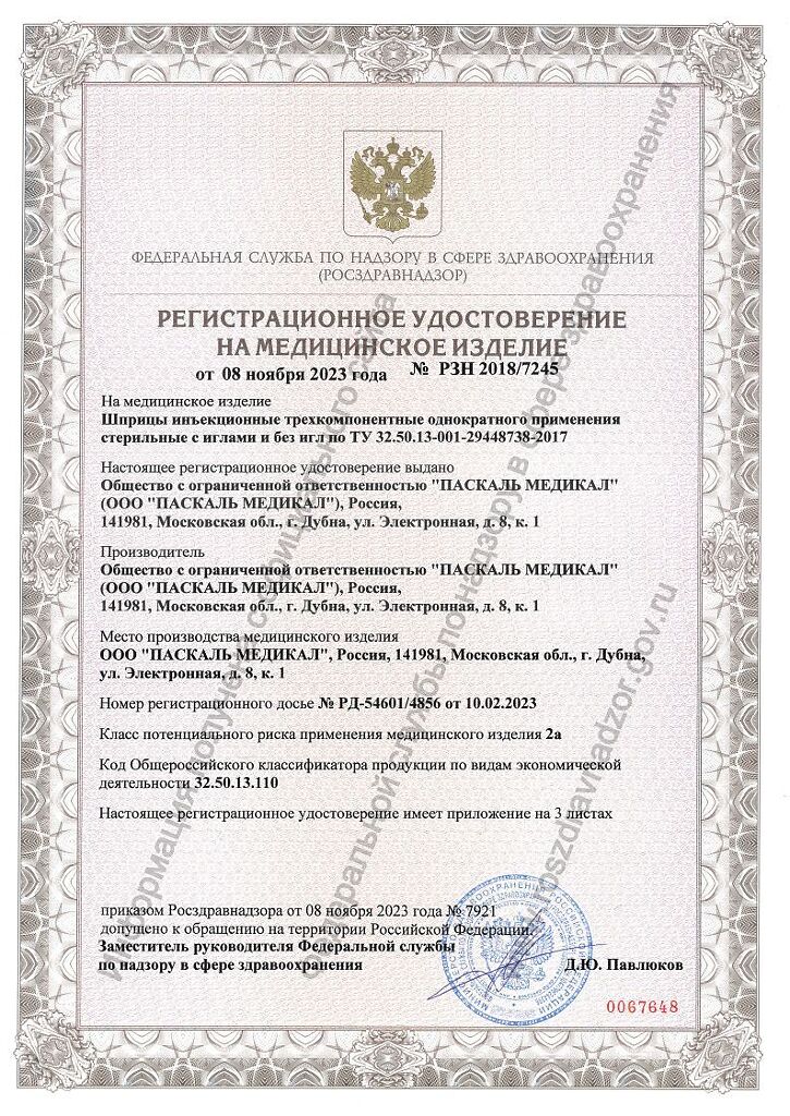 Документы Шприц 3-х компонентный Pascal 2 мл с иглой 23G (0,6х30 мм) 1 шт