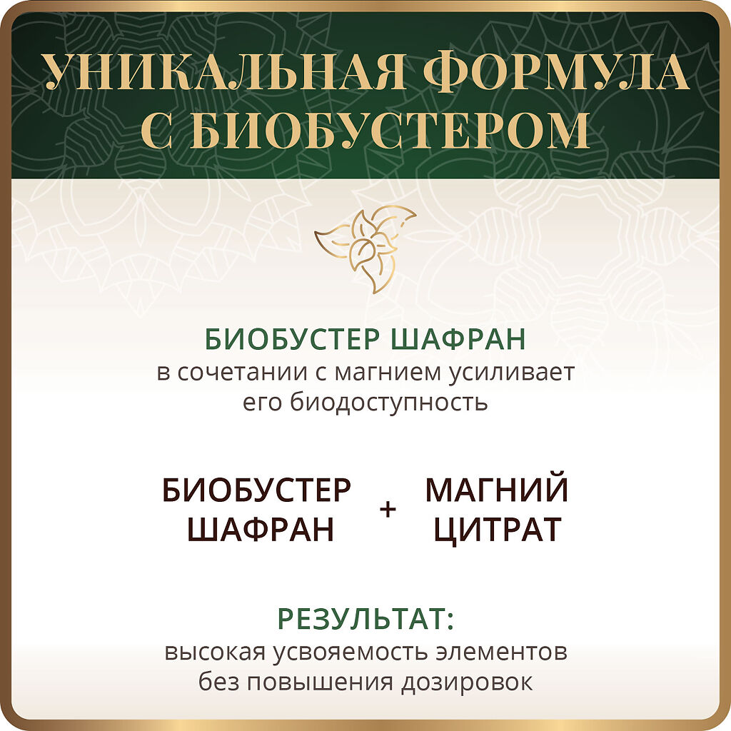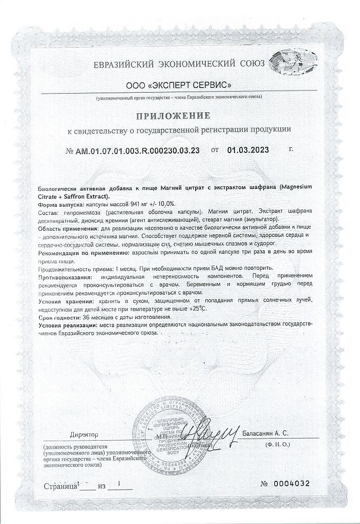 Гипромеллоза (растительная оболочка капсулы), магния цитрат, экстракт шафрана десятикратный, диоксид кремния (агент антислеживающий), стеарат магния (эмульгатор).