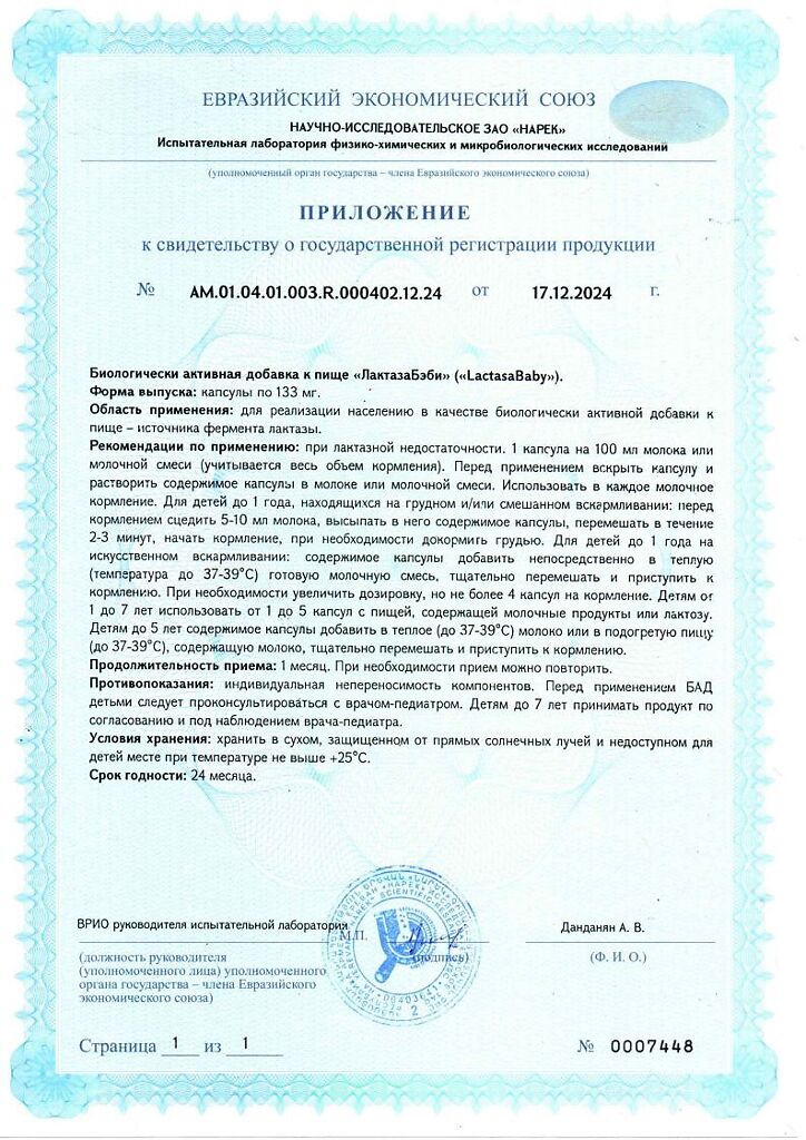 При лактазной недостаточности. 1 капсула на 100 мл молока или молочной смеси (учитывается весь объем кормления). Перед применением вскрыть капсулу и растворить содержимое капсулы в молоке или молочной смеси. Использовать в каждое молочное кормление.