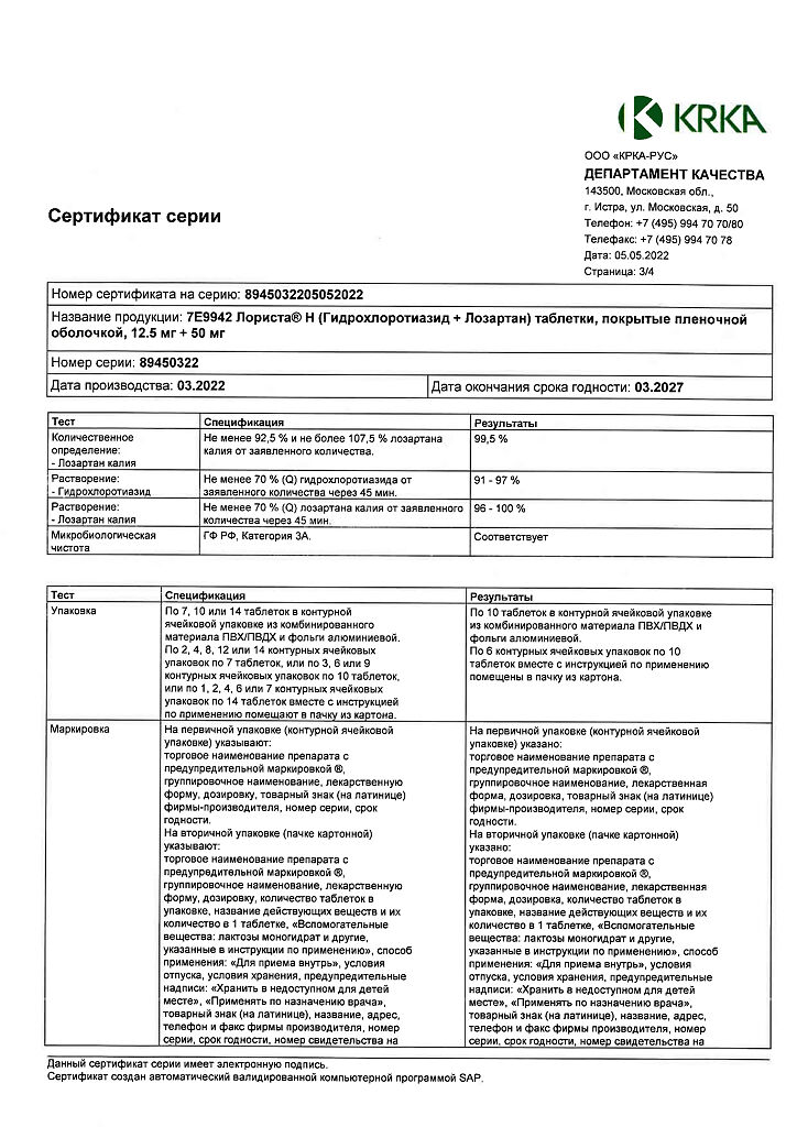 Препарат Лориста® Н содержит лактозу, поэтому препарат противопоказан пациентам с дефицитом лактазы, непереносимостью лактозы, синдромом глюкозо-галактозной мальабсорбции.