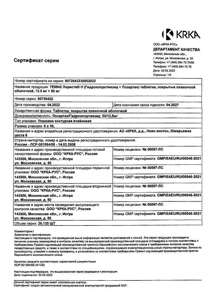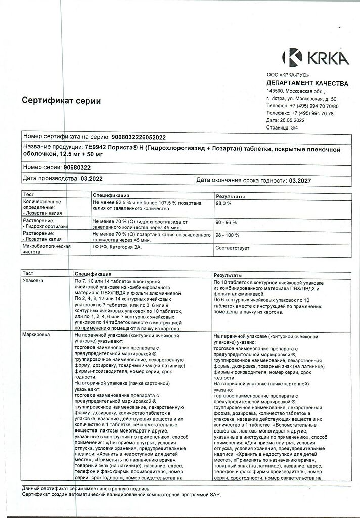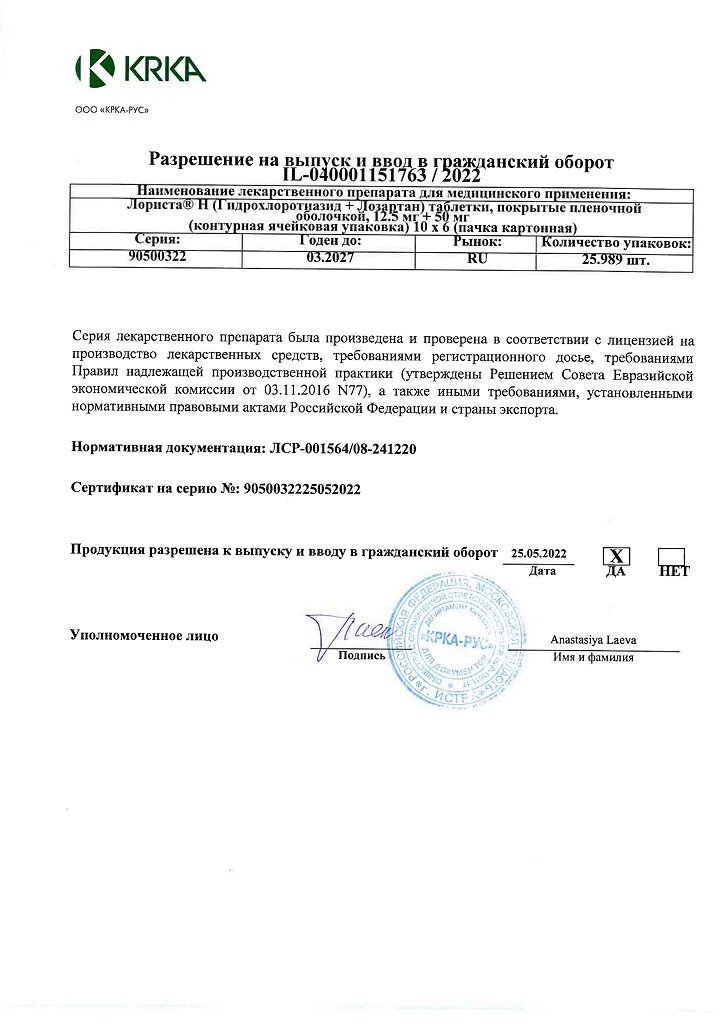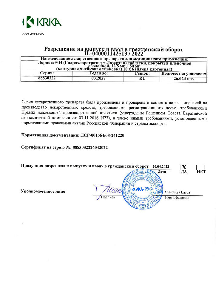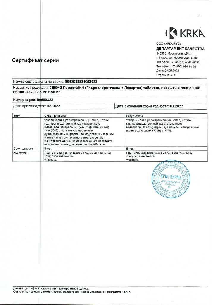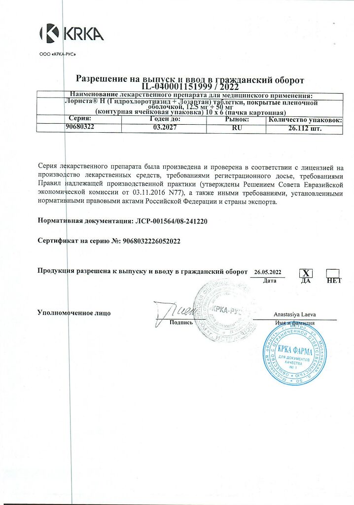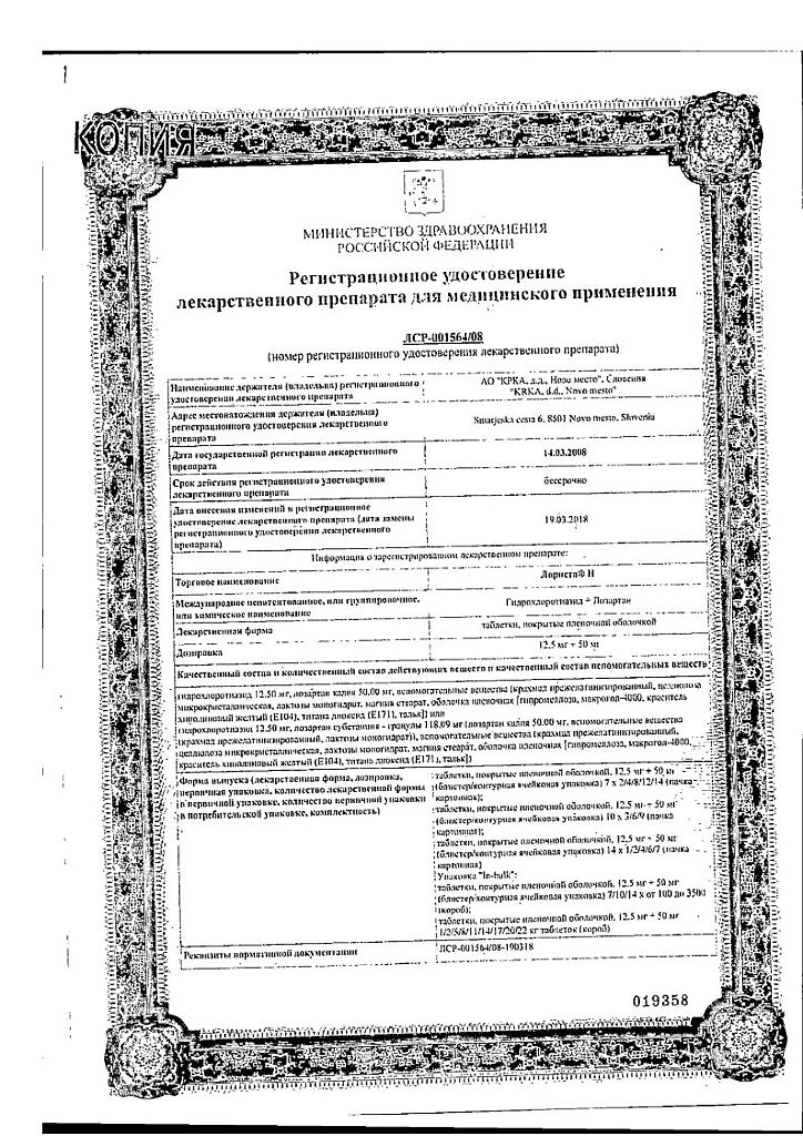 Документы Лориста Н таблетки покрыт.плен.об. 12,5 мг+50 мг 60 шт