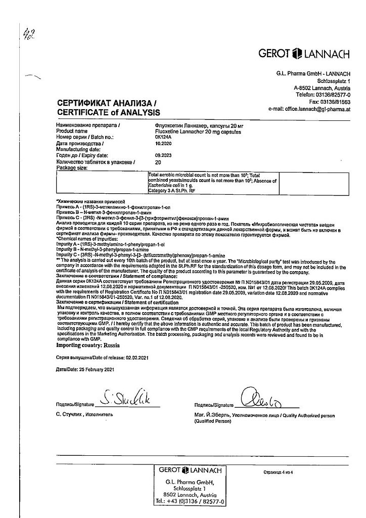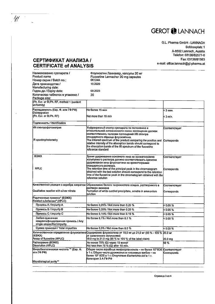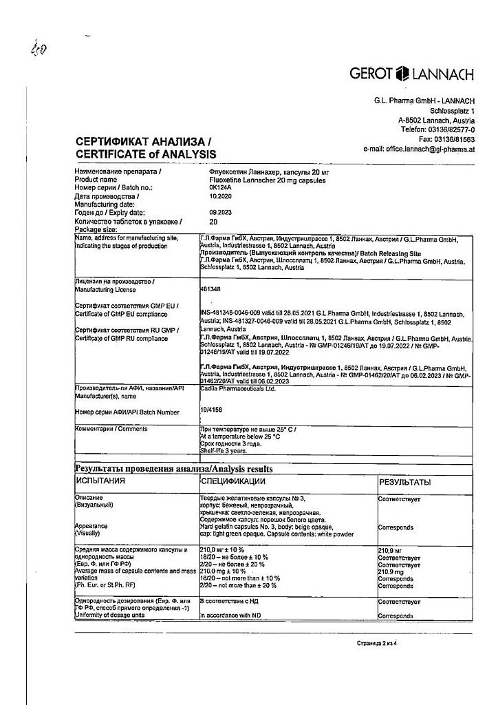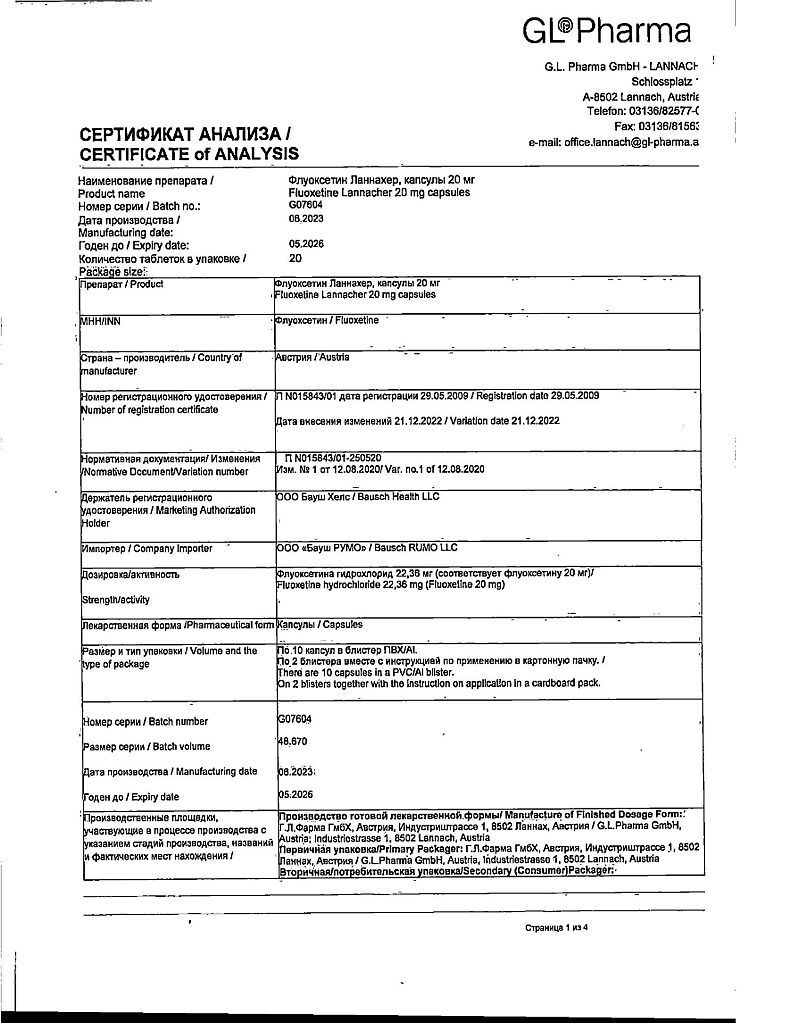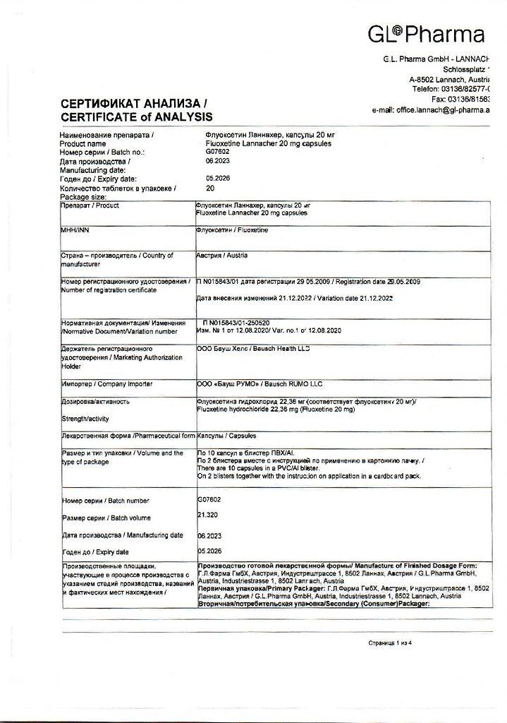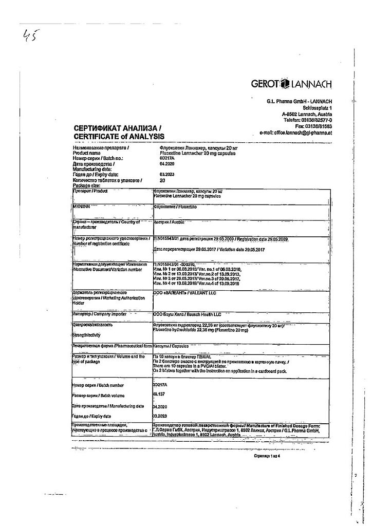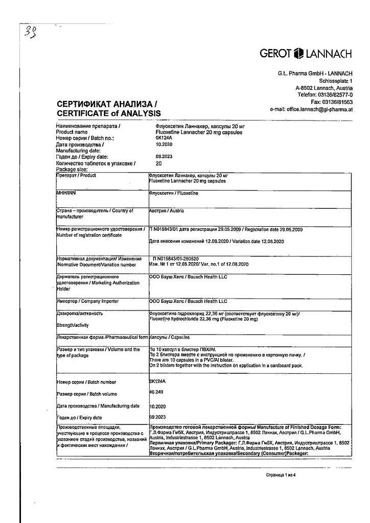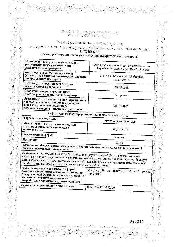 Документы Флуоксетин Ланнахер капсулы 20 мг 20 шт