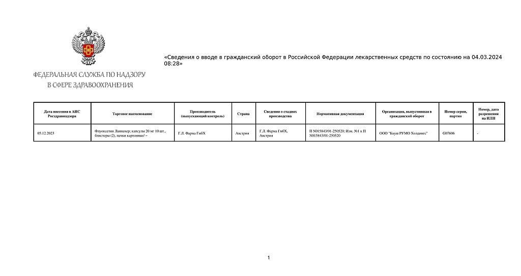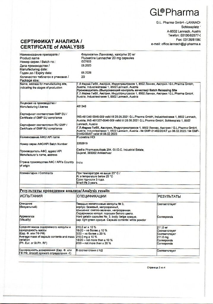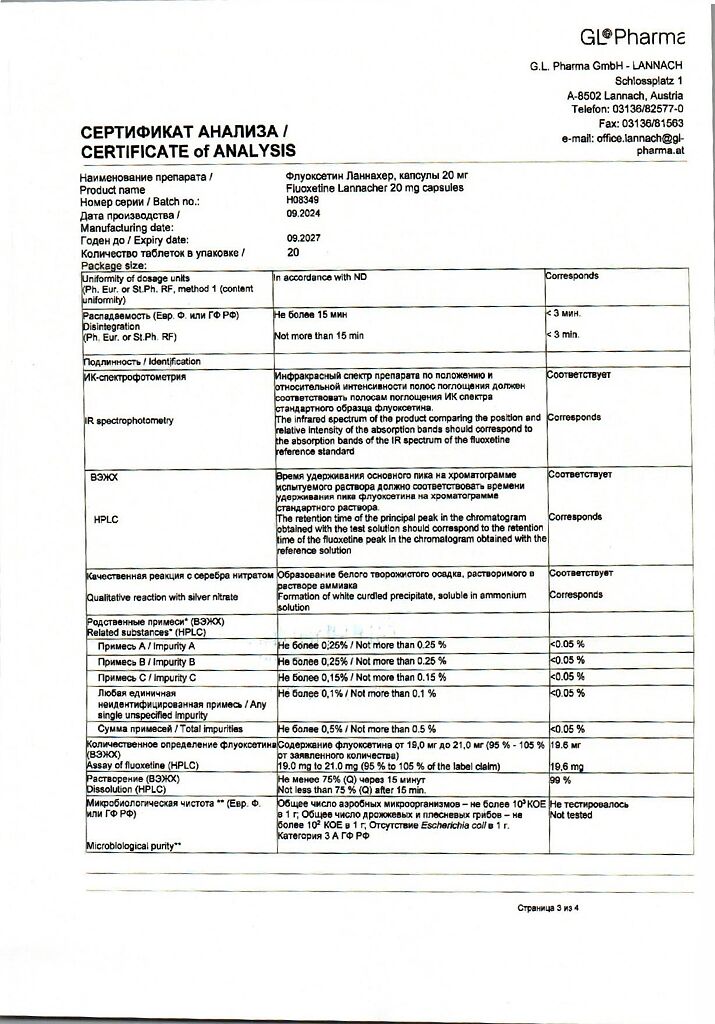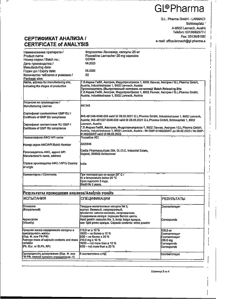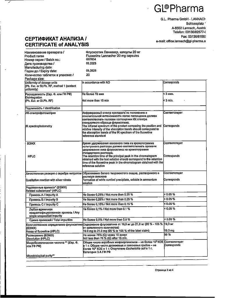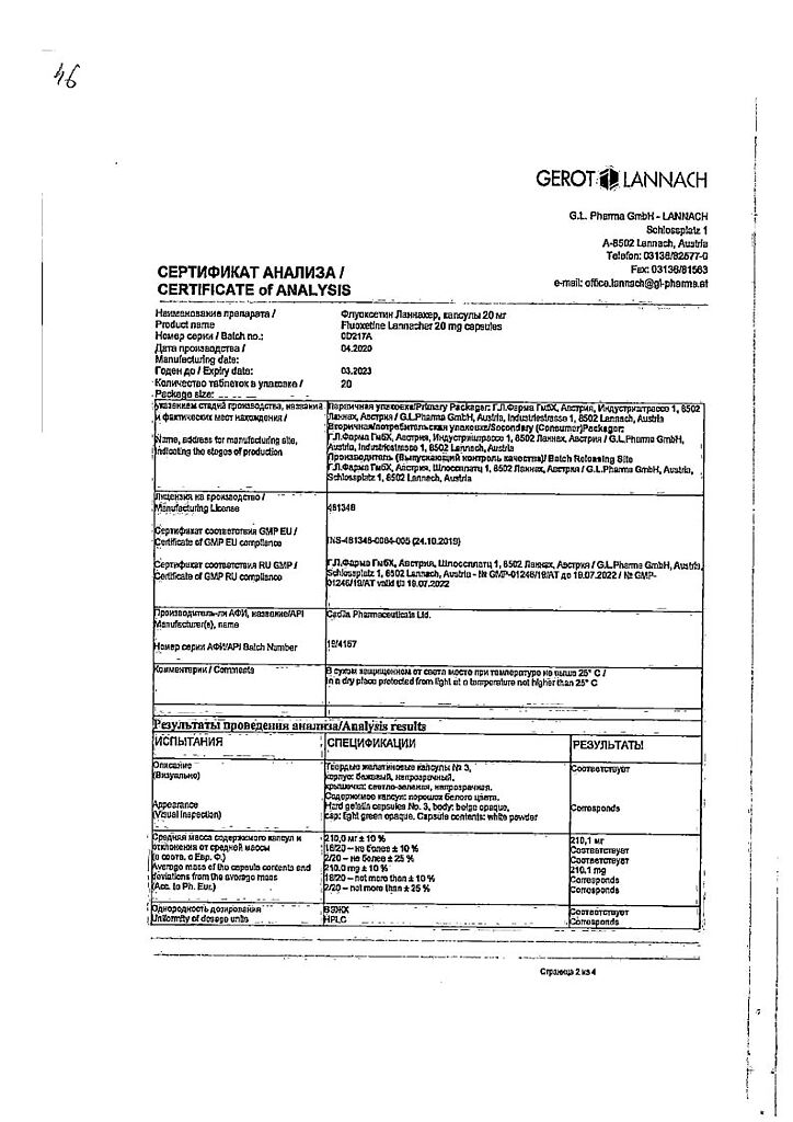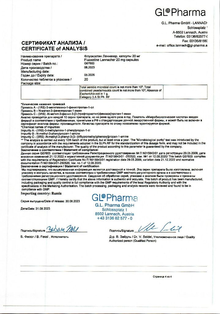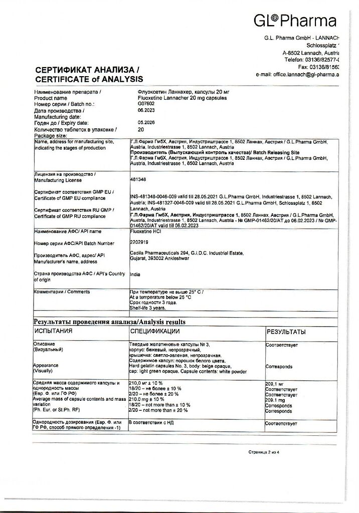 Документы Флуоксетин Ланнахер капсулы 20 мг 20 шт