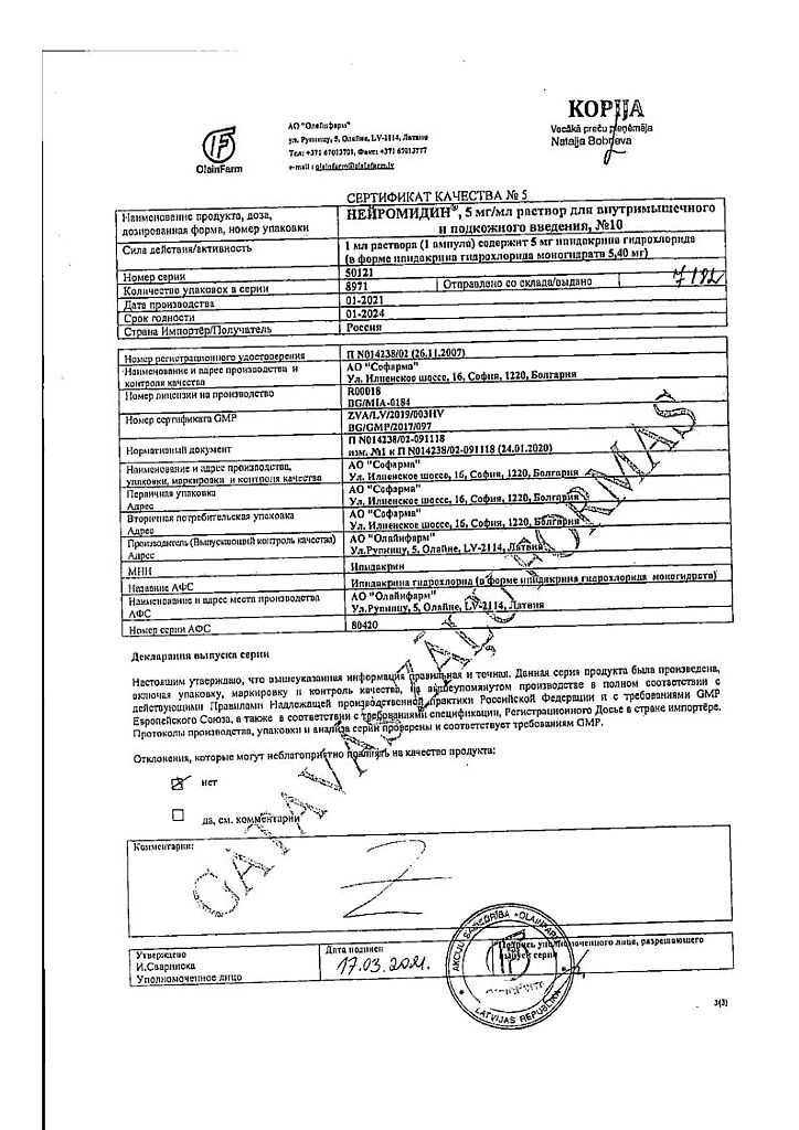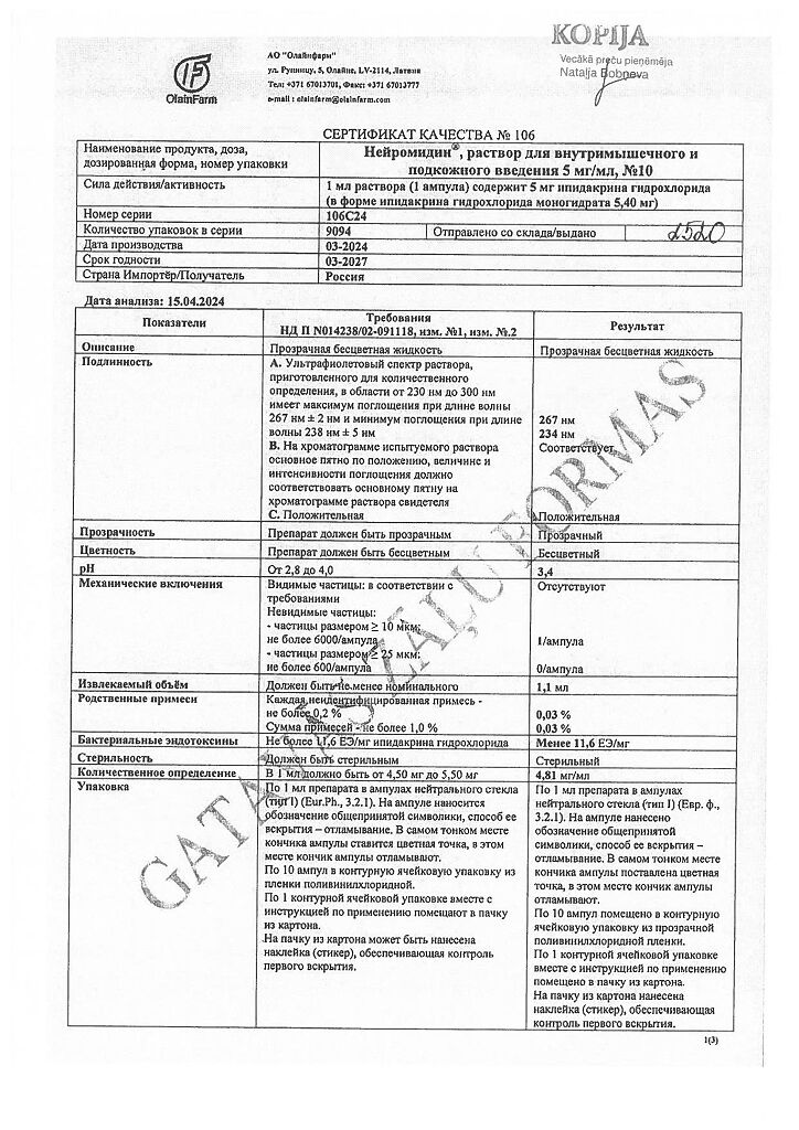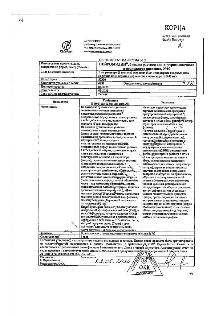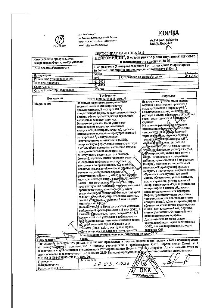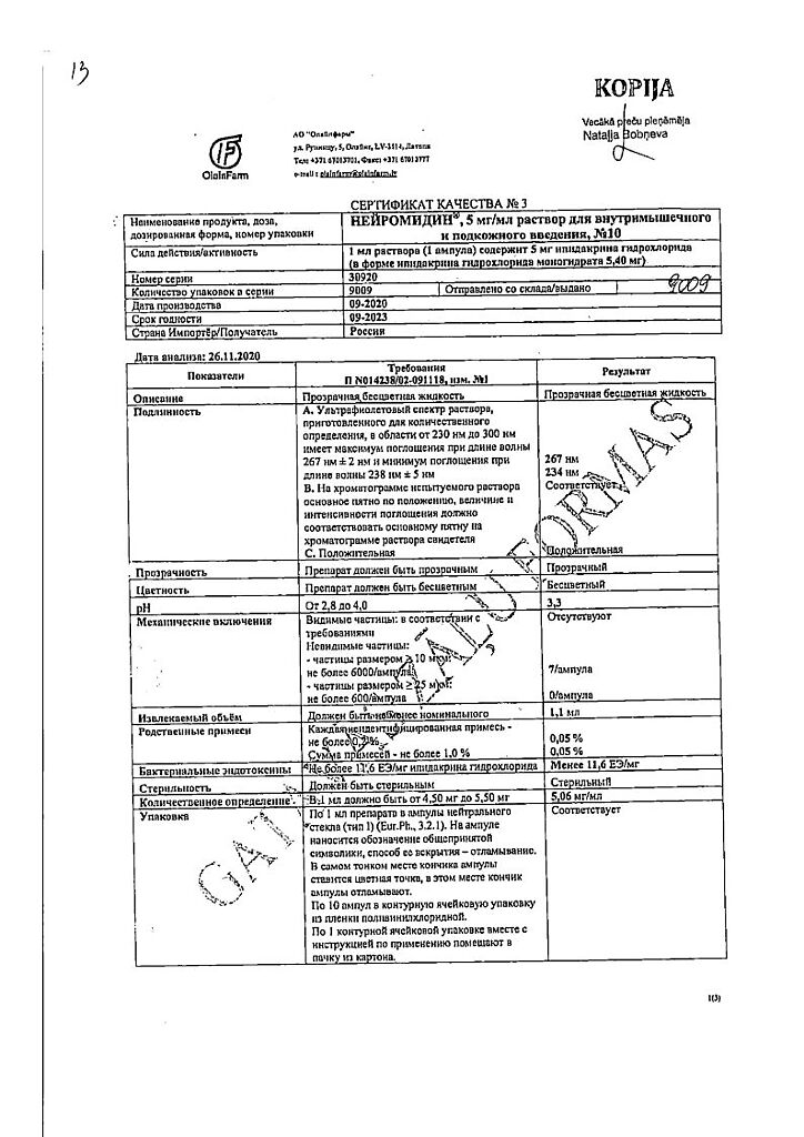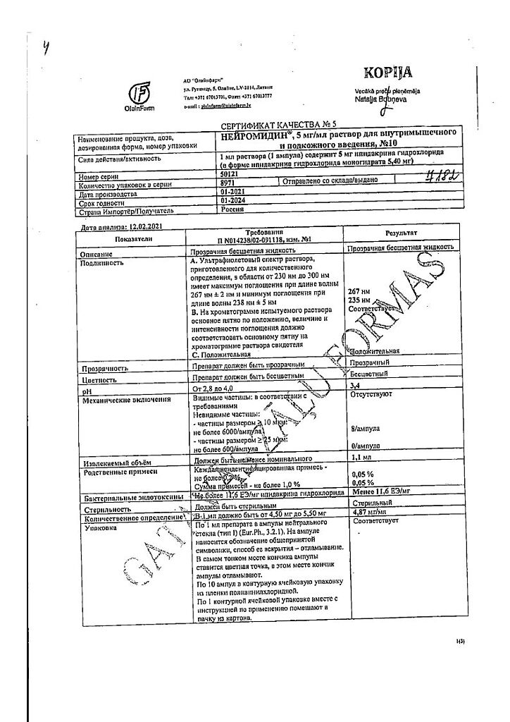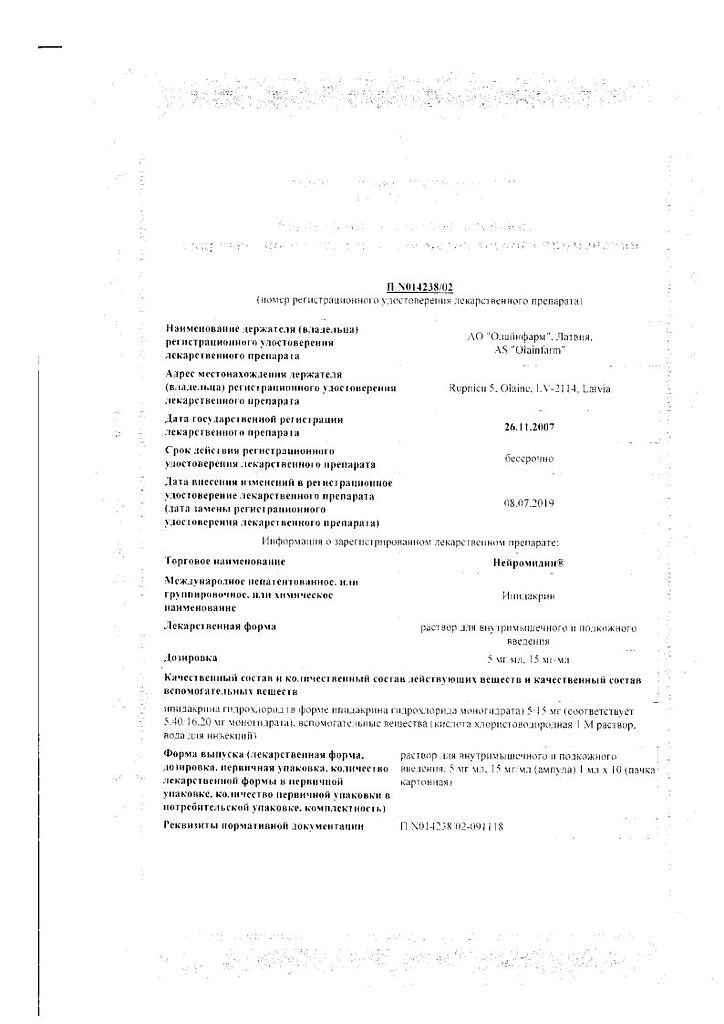 Документы Нейромидин раствор для в/м и п/к введ. 5 мг/мл 1 мл 10 шт