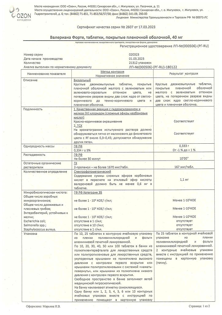 Документы Валериана форте таблетки покрыт.плен.об. 40 мг 50 шт
