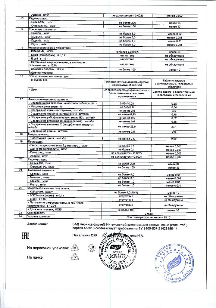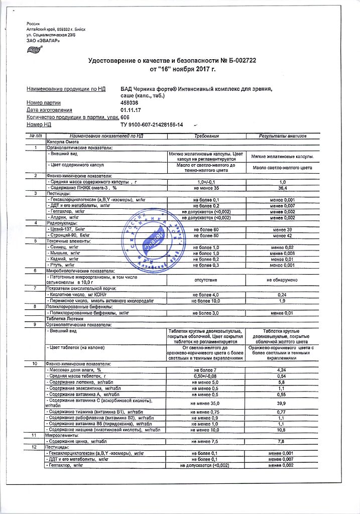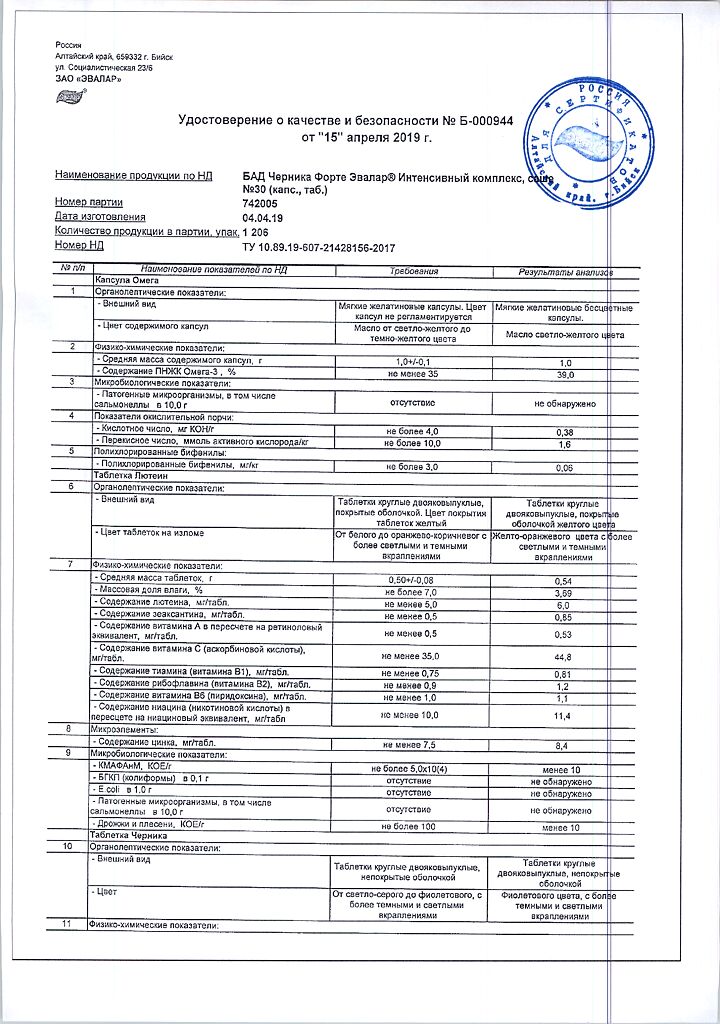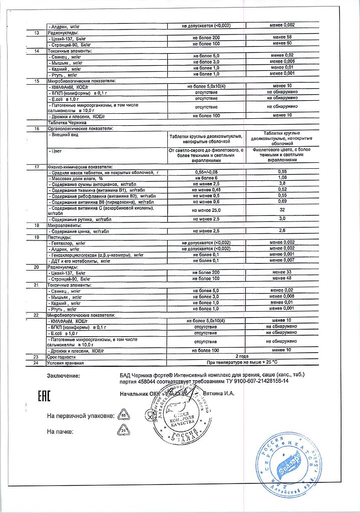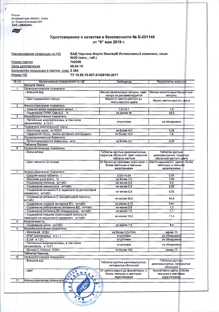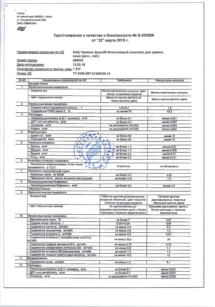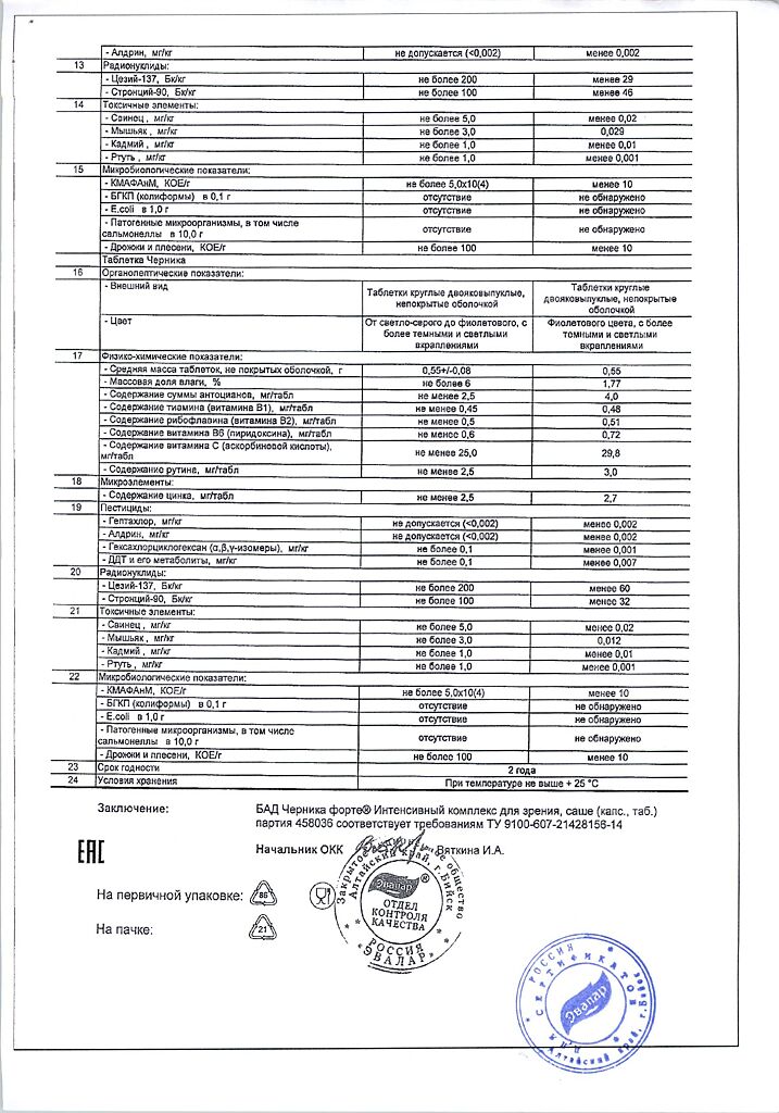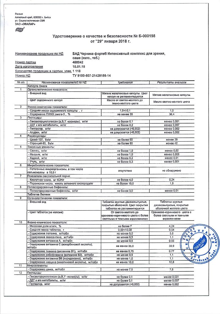 Документы Черника Форте Эвалар Интенсивный комплекс саше по 1,0 г 30 шт