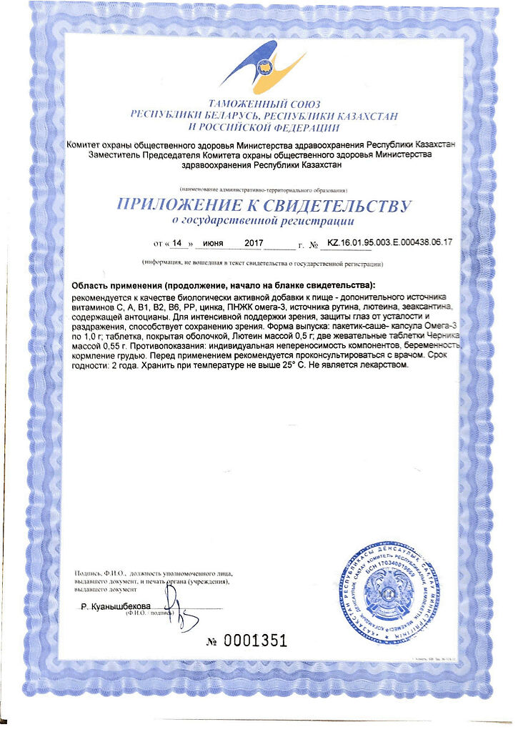 Взрослым принимать содержимое пакетика-саше 1 раз в день во время еды: желтую таблетку «Лютеин» и капсулу «Омега» выпить, запивая достаточным количеством воды, затем разжевать две фиолетовые жевательные таблетки «Черника». Продолжительность приема – не менее 1 месяца. Рекомендуется повторять приема 3-4 раза в год.