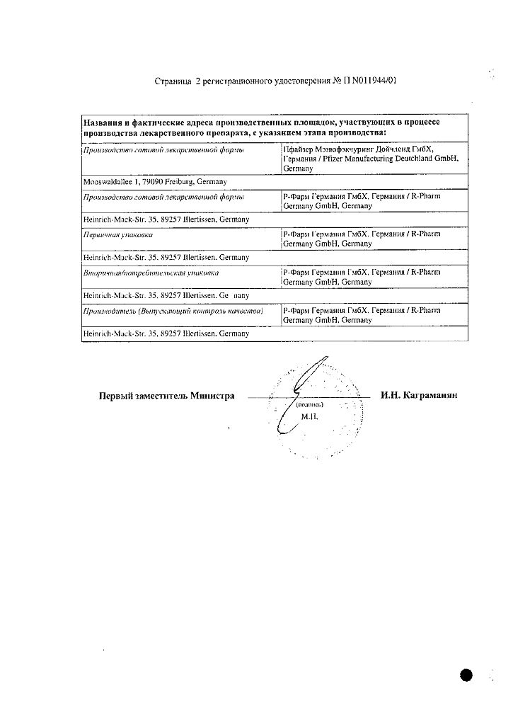 Дозировка 1 мг: белые, круглые, двояковыпуклые таблетки, на одной стороне гравировка «CN 1», на другой стороне - гравировка «Pfizer».