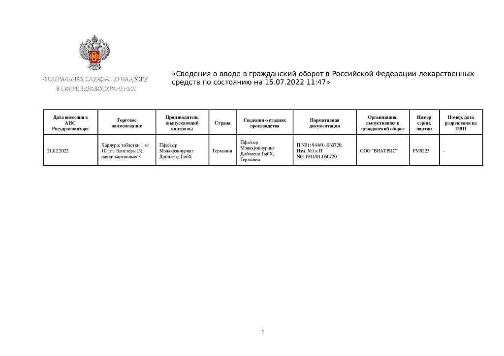 • 📲 Цена на Кардура таблетки 1 мг 30 шт ниже в нашем приложении