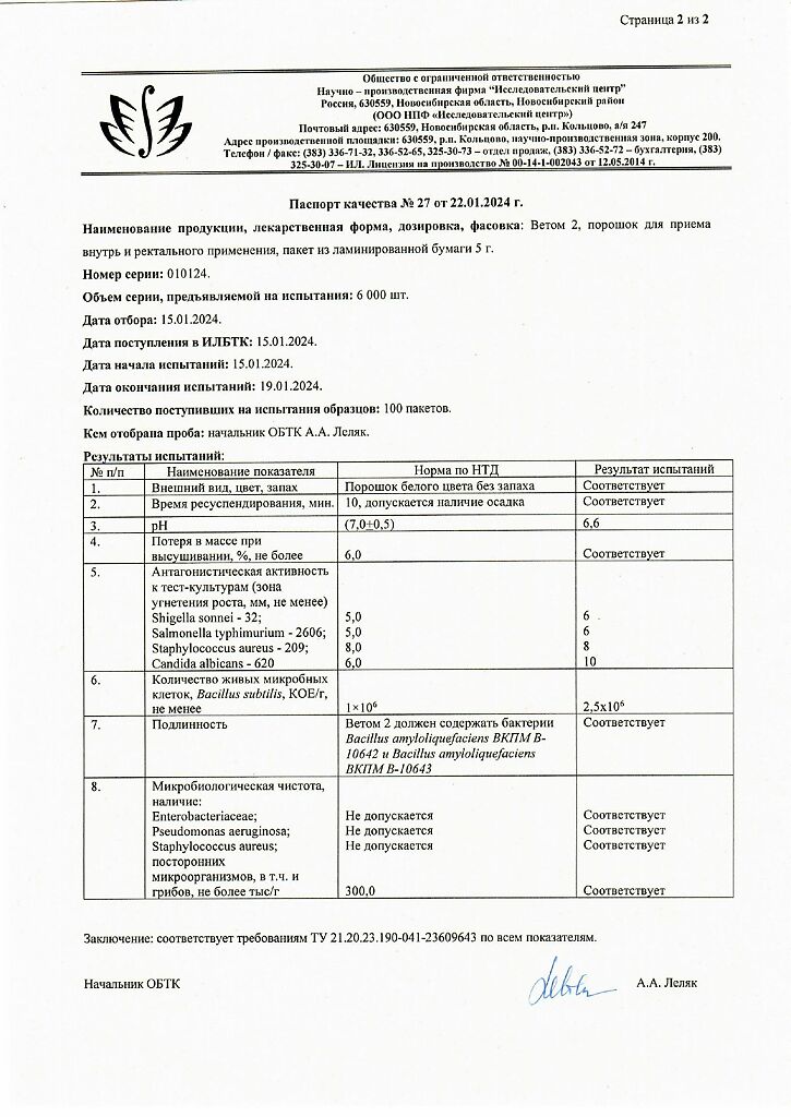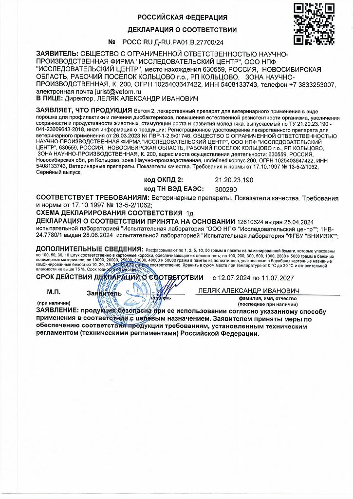 Бактерии Bacillus subtilis штамм ВКПМ В-7048 и Bacillus licheniformis штамм ВКПМ В-7038, используемые для изготовления препарата, отличаются высокой устойчивостью к пищеварительным сокам и ферментам желудочно-кишечного тракта млекопитающих. Размножаясь, бактерии выделяют в окружающую среду ферменты и другие биологически активные вещества. Следствием этого процесса в толстой кишке ЖКТ нормализуется микробный состав, снижается степень воспаления слизистой оболочки кишечника, что способствует активному выводу токсинов из организма и беспрепятственной доставке через базальную мембрану биологически активных и питательных веществ (железа, кальция, фолатов, жиров, белков, углеводов, электролитов, воды). Под воздействием биологически активных веществ нормализуются: пищеварение, всасывание и метаболизм железа, кальция, жиров, белков, углеводов, триглицеридов, аминокислот, дипептидов, сахаров, солей желчных кислот, кислотность среды в ЖКТ. Восстановление функциональной активности толстой кишки ЖКТ приводит к увеличению фагоцитарной активности крови, способствует нормализации работы иммунной системы, улучшению обмена веществ в организме, что благоприятно сказывается на иммунологическом и физиологическом статусе организма.