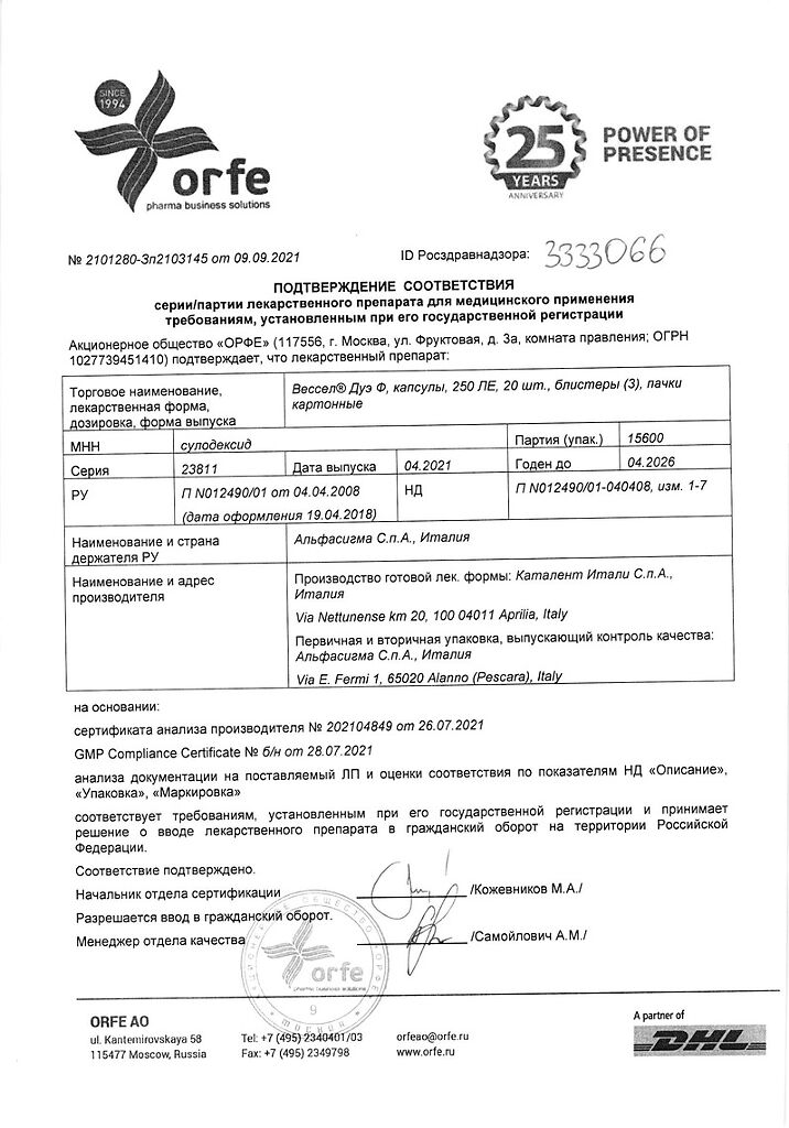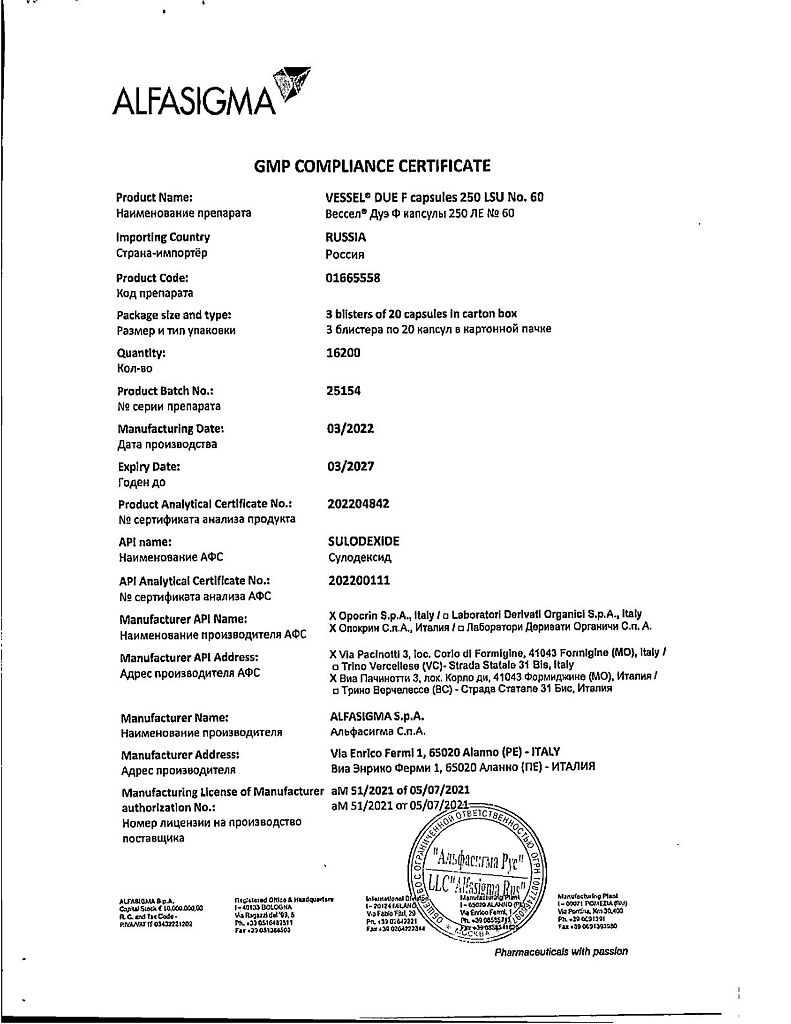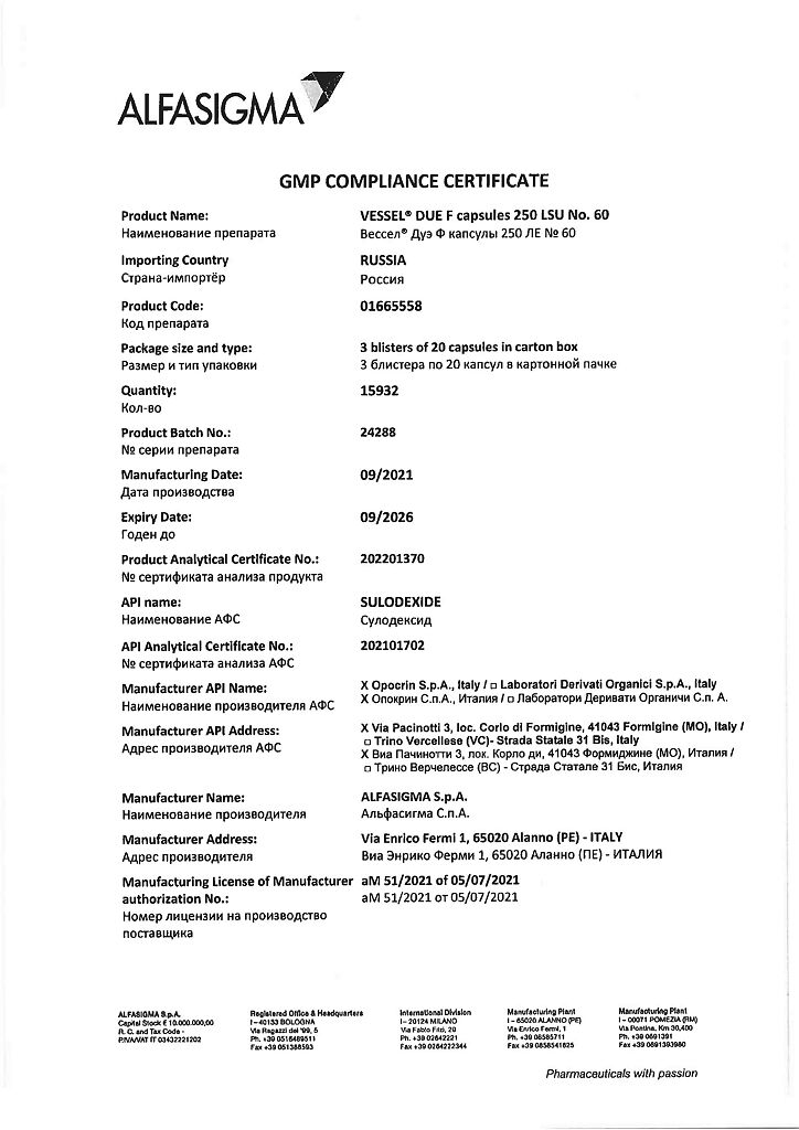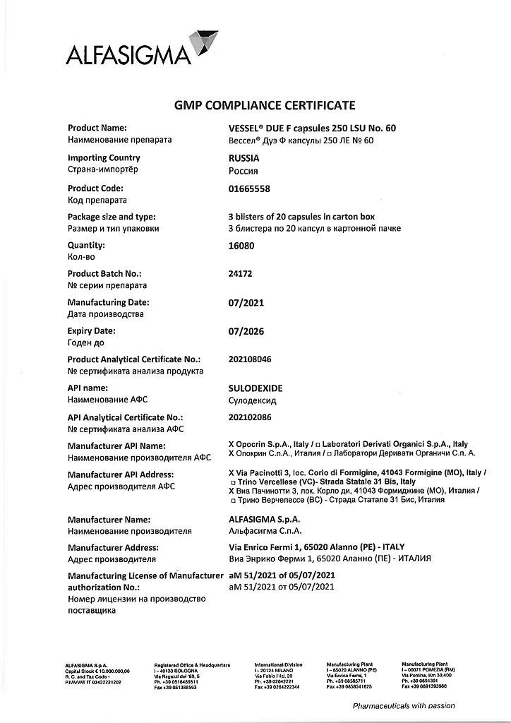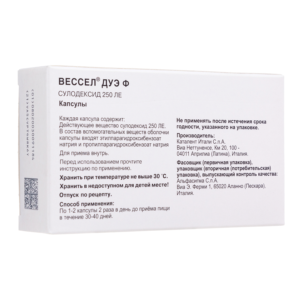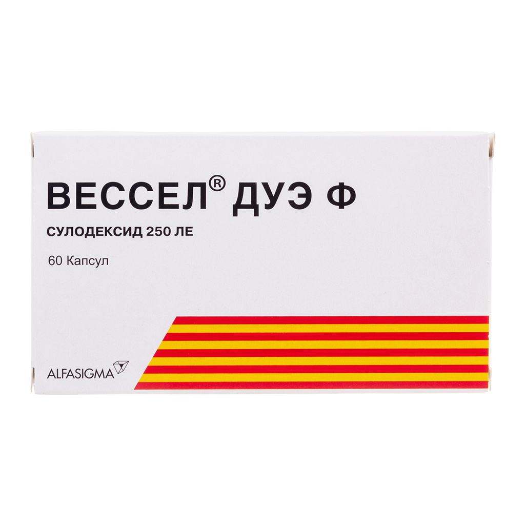 Вессел® Дуэ Ф (сулодексид) является биологическим лекарственным препаратом, представляющим собой естественную смесь гликозаминогликанов (ГАГ): гепариноподобной фракции с молекулярной массой 8000 дальтон (80 %) и дерматансульфата (20 %).