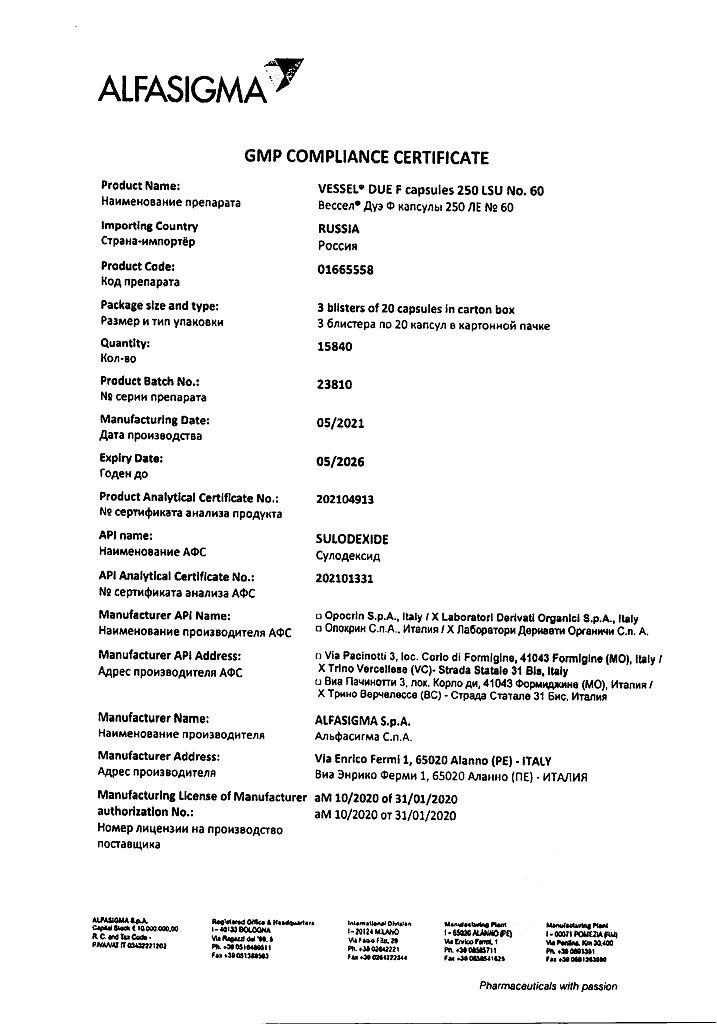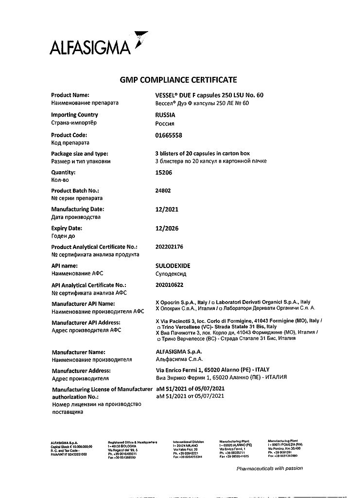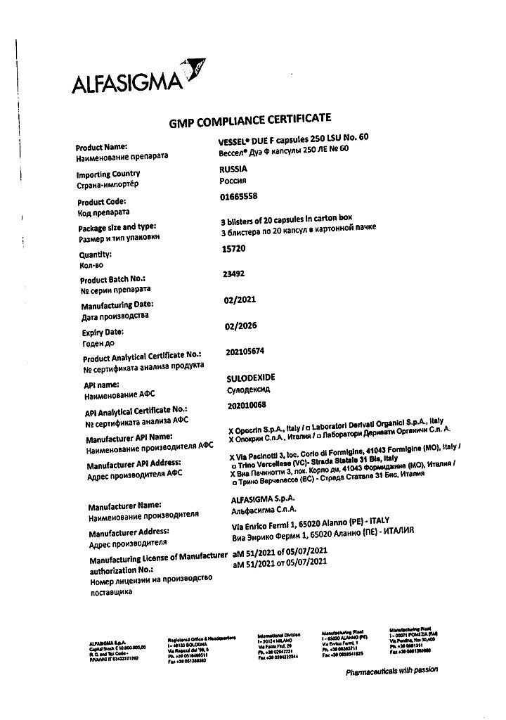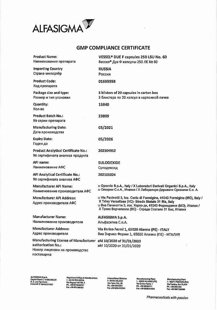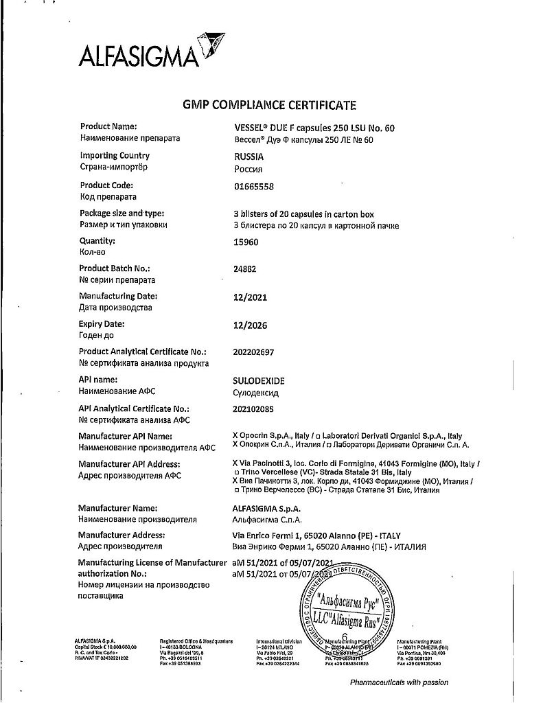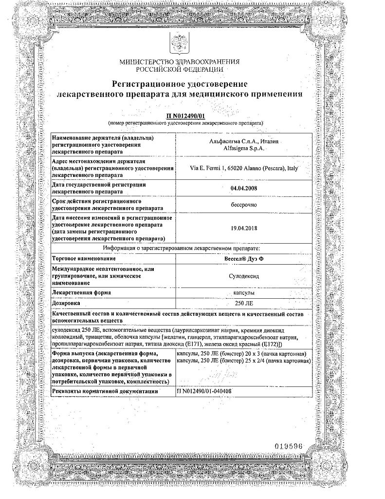 Вессел® Дуэ Ф (сулодексид) является биологическим лекарственным препаратом, представляющим собой естественную смесь гликозаминогликанов (ГАГ): гепариноподобной фракции с молекулярной массой 8000 дальтон (80 %) и дерматансульфата (20 %).