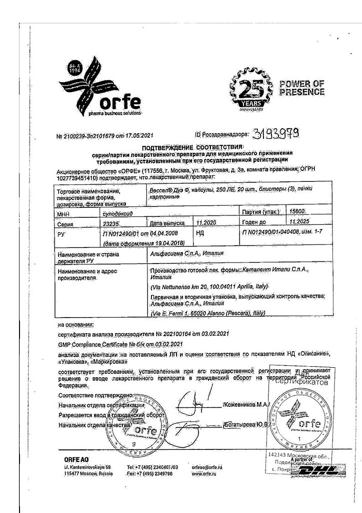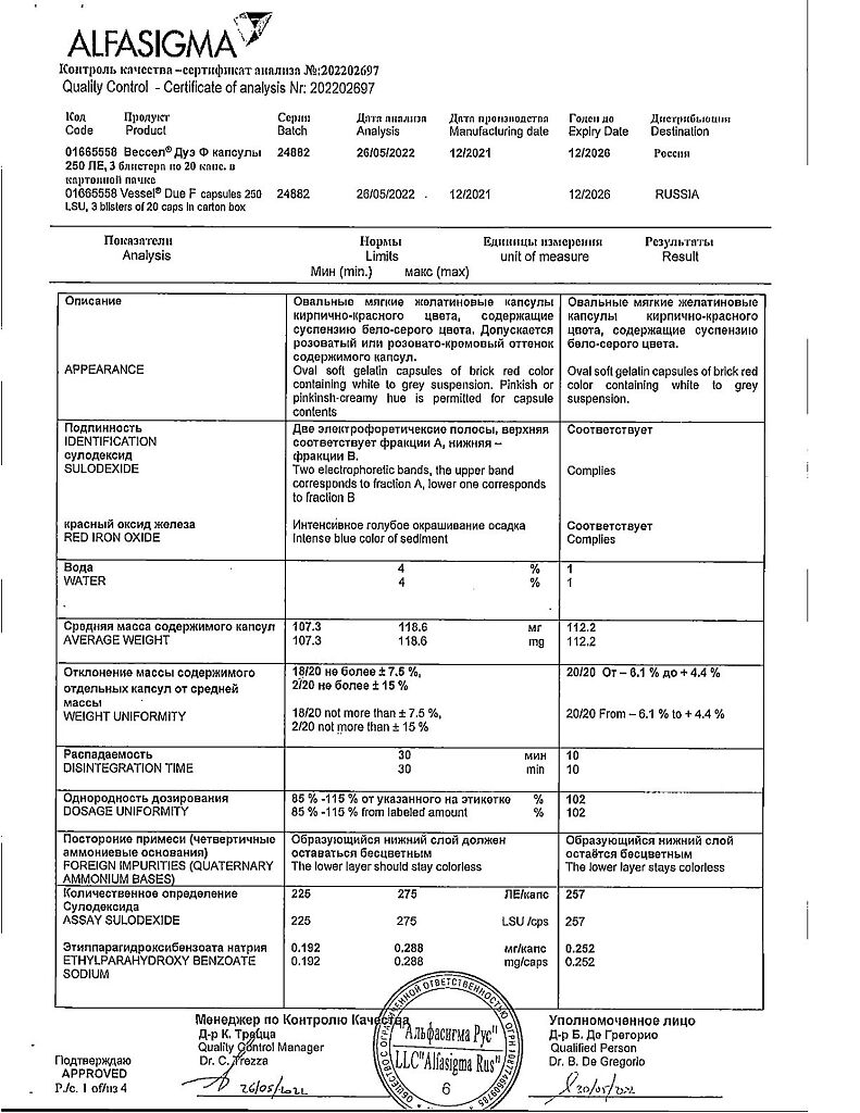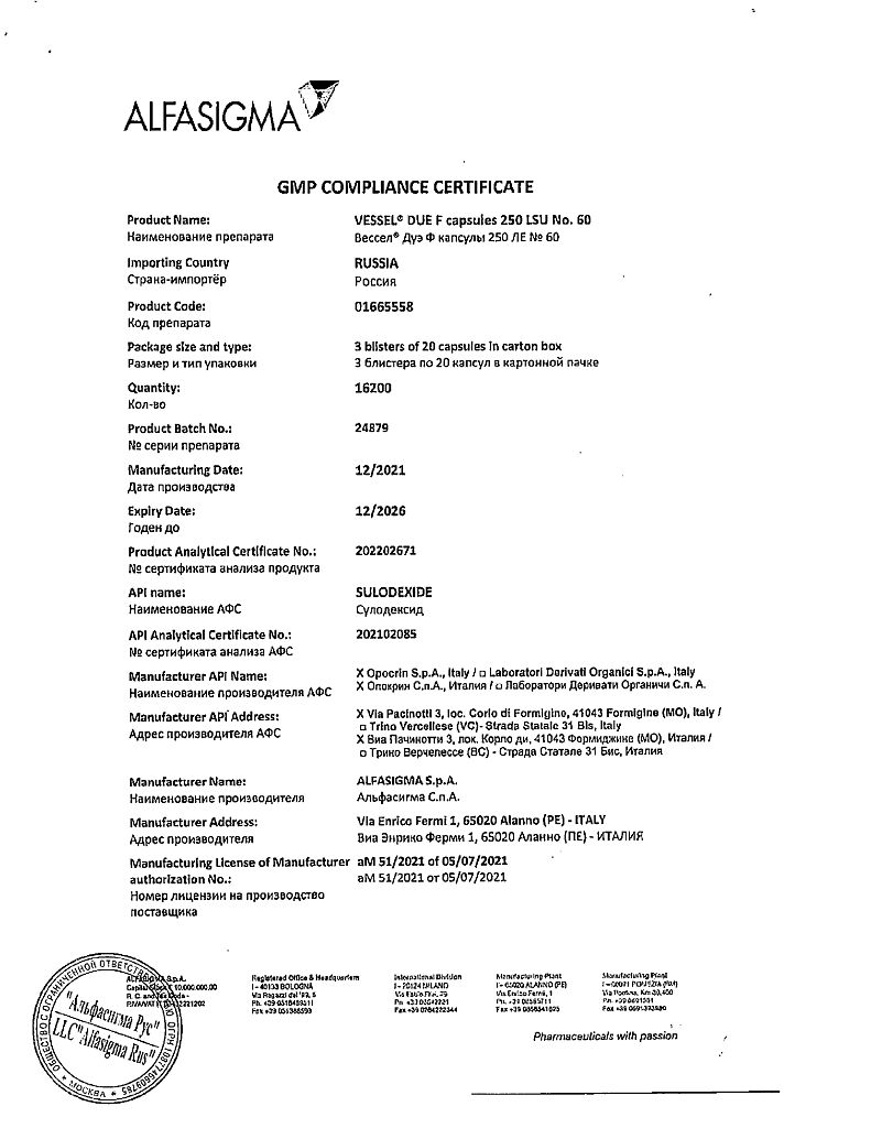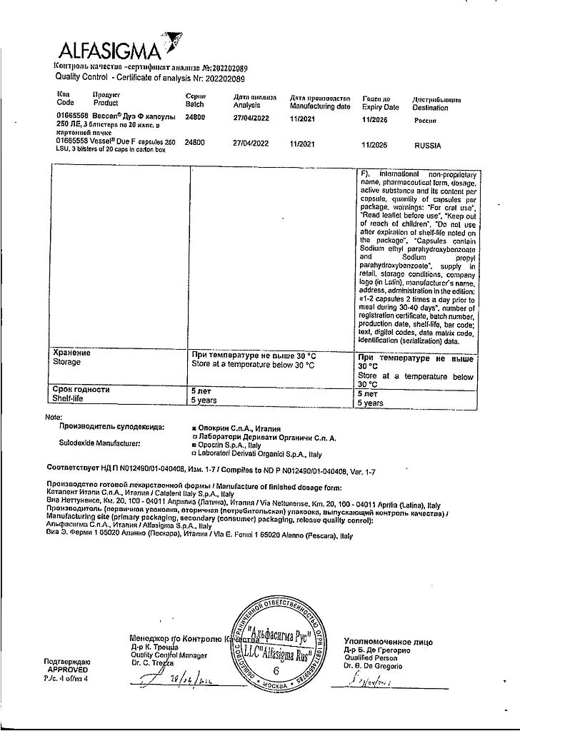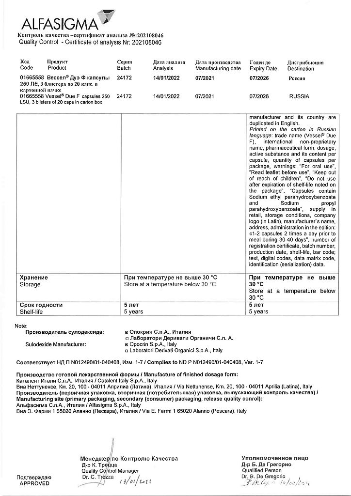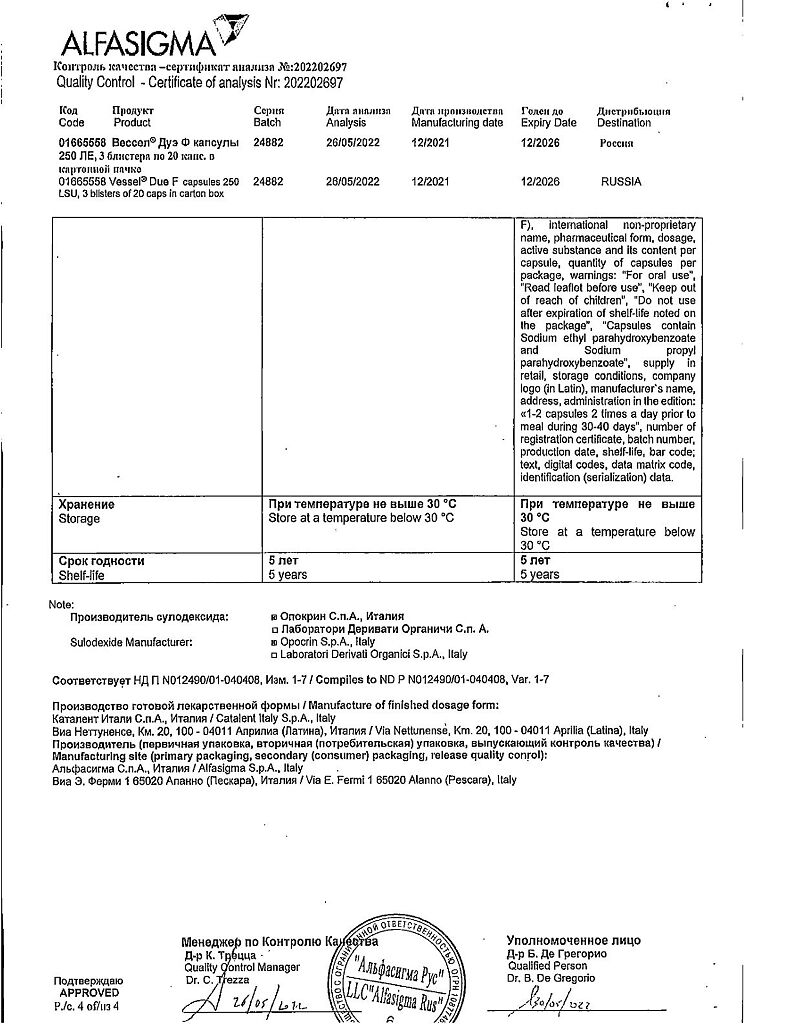 Вессел® Дуэ Ф (сулодексид) является биологическим лекарственным препаратом, представляющим собой естественную смесь гликозаминогликанов (ГАГ): гепариноподобной фракции с молекулярной массой 8000 дальтон (80 %) и дерматансульфата (20 %).