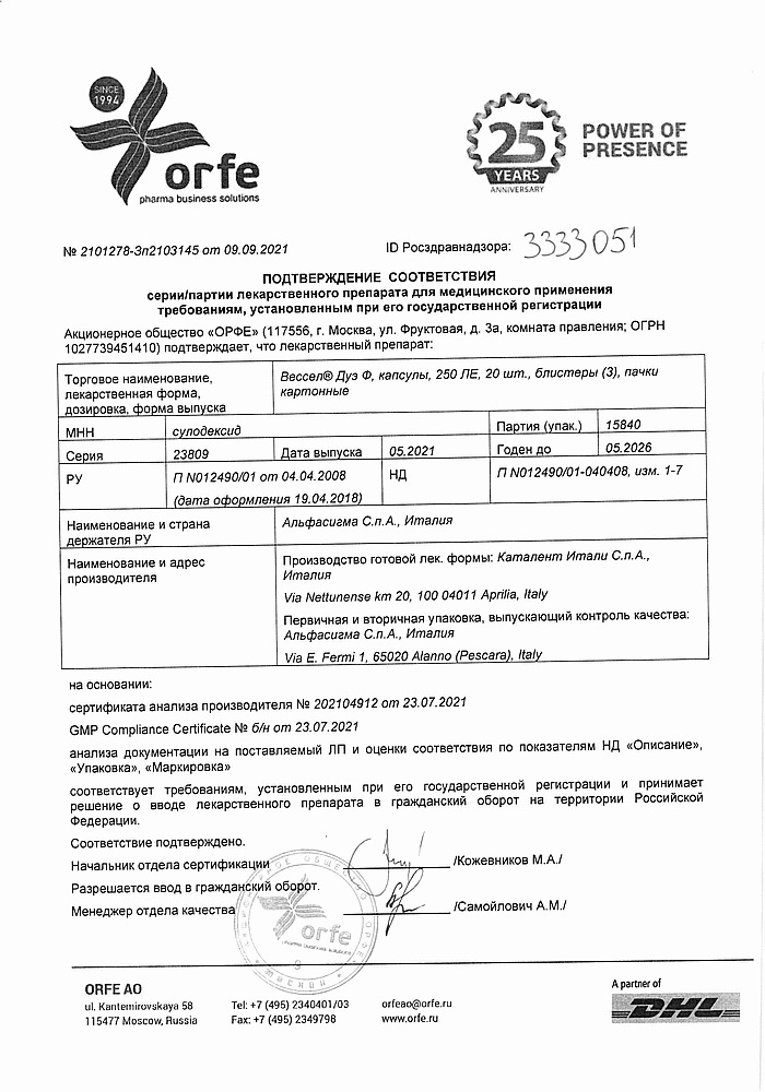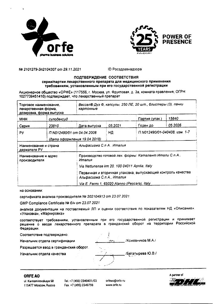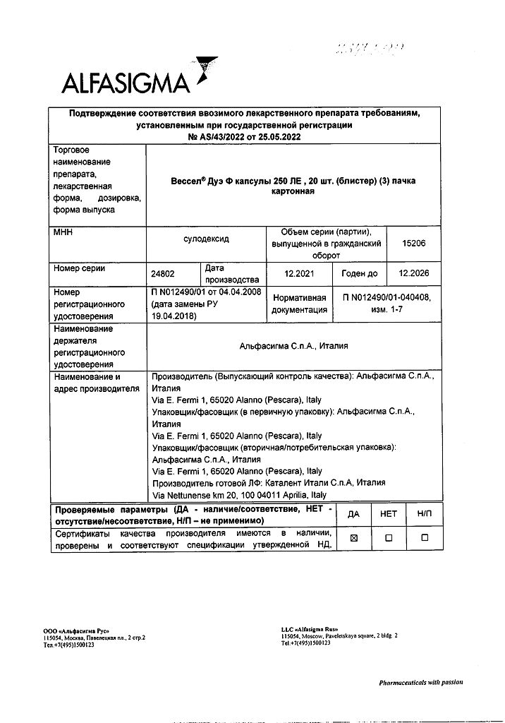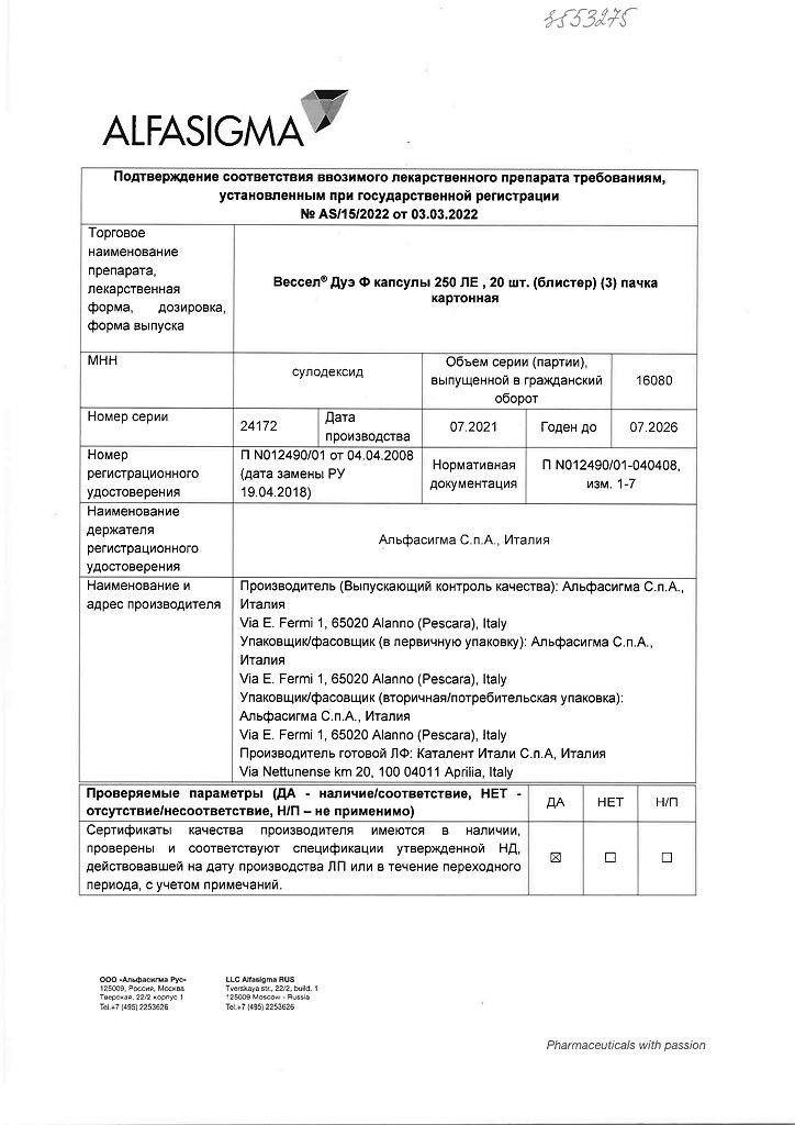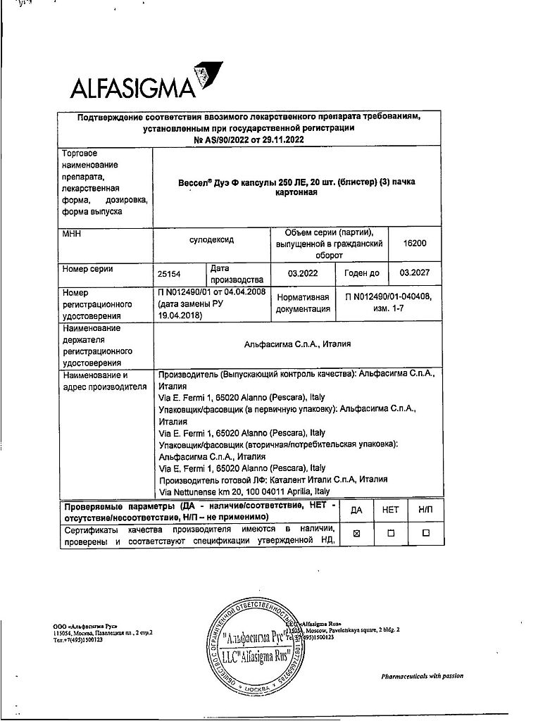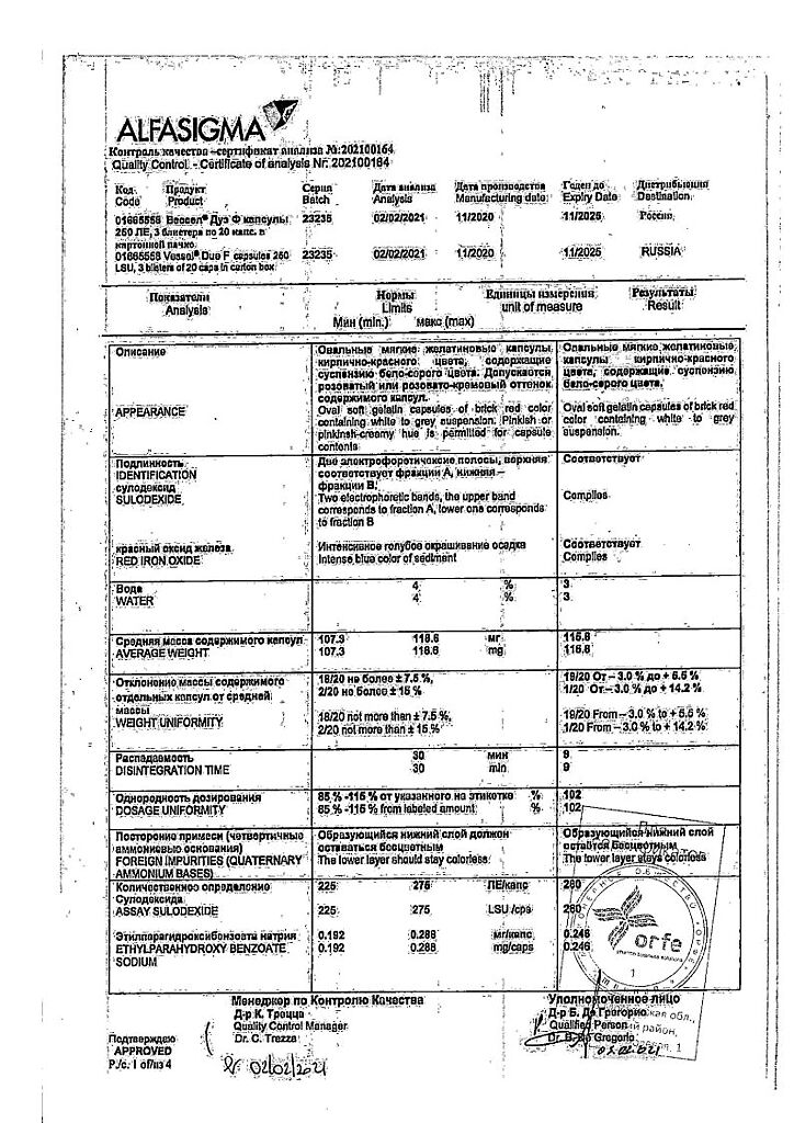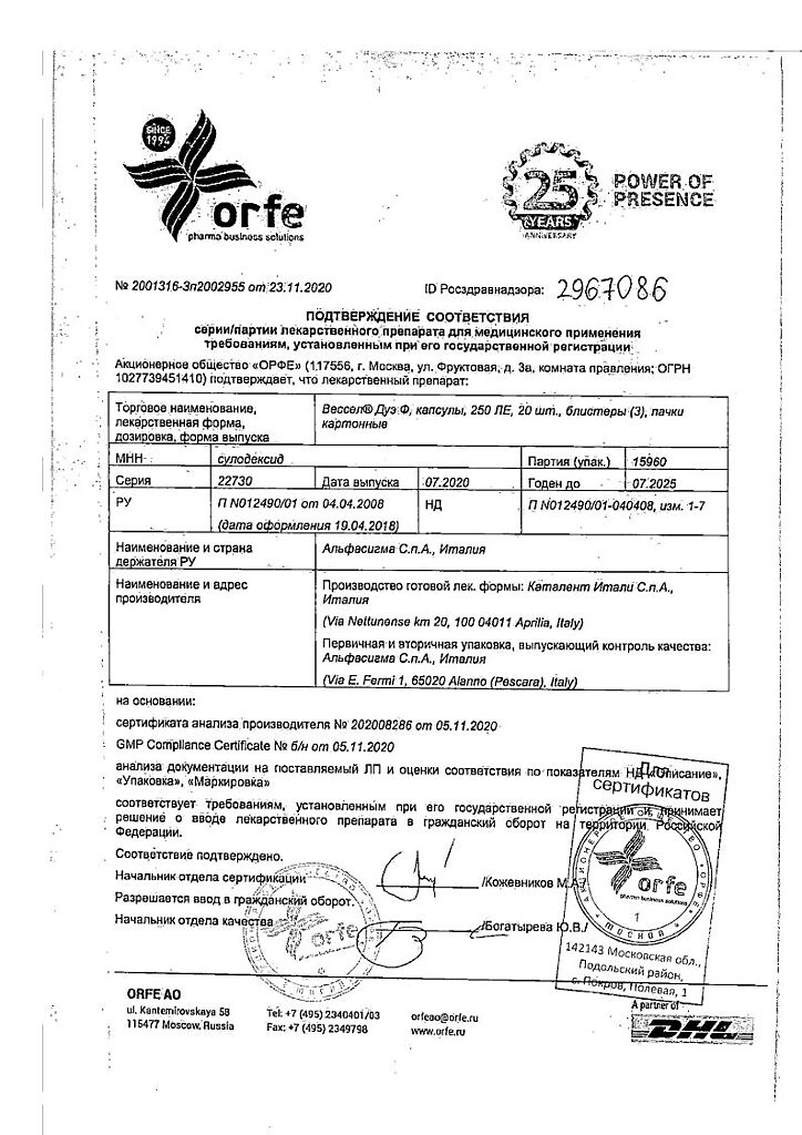 Вессел® Дуэ Ф (сулодексид) является биологическим лекарственным препаратом, представляющим собой естественную смесь гликозаминогликанов (ГАГ): гепариноподобной фракции с молекулярной массой 8000 дальтон (80 %) и дерматансульфата (20 %).