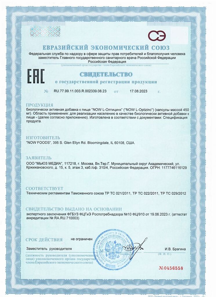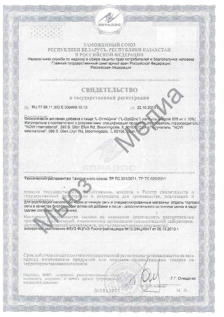 Документы Now L-Оптицинк 30 мг/L-Optizink капсулы массой 450 мг 100 шт