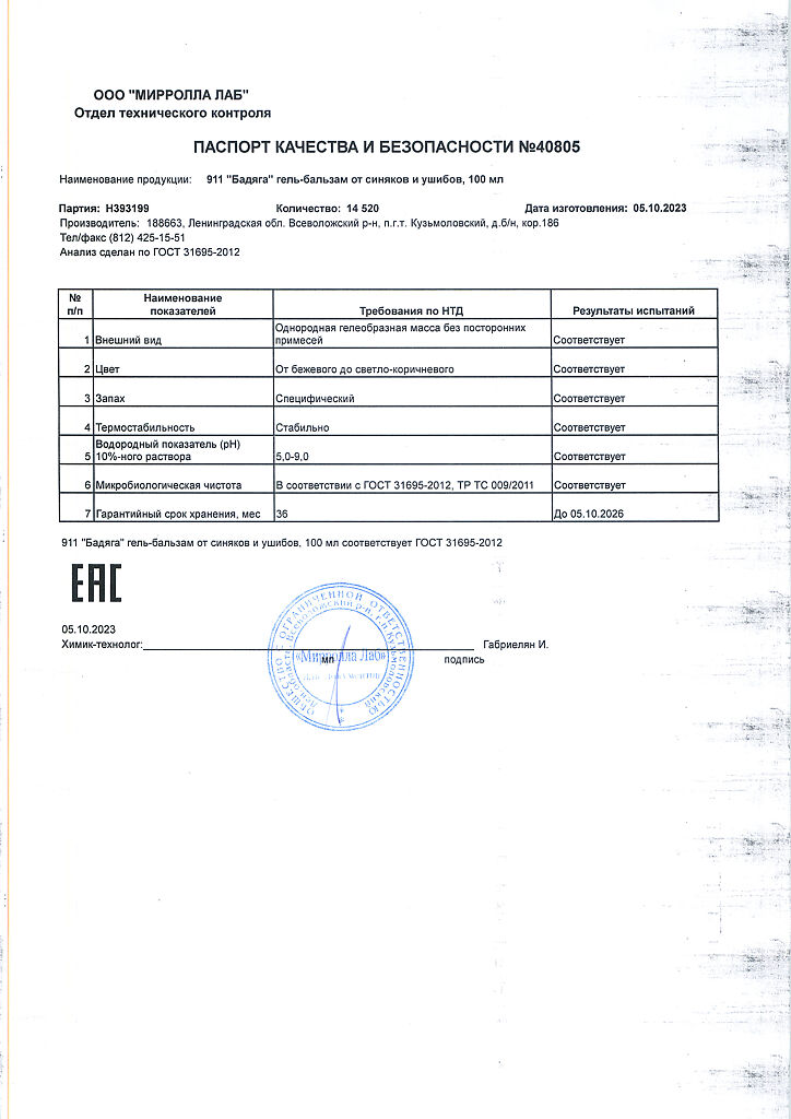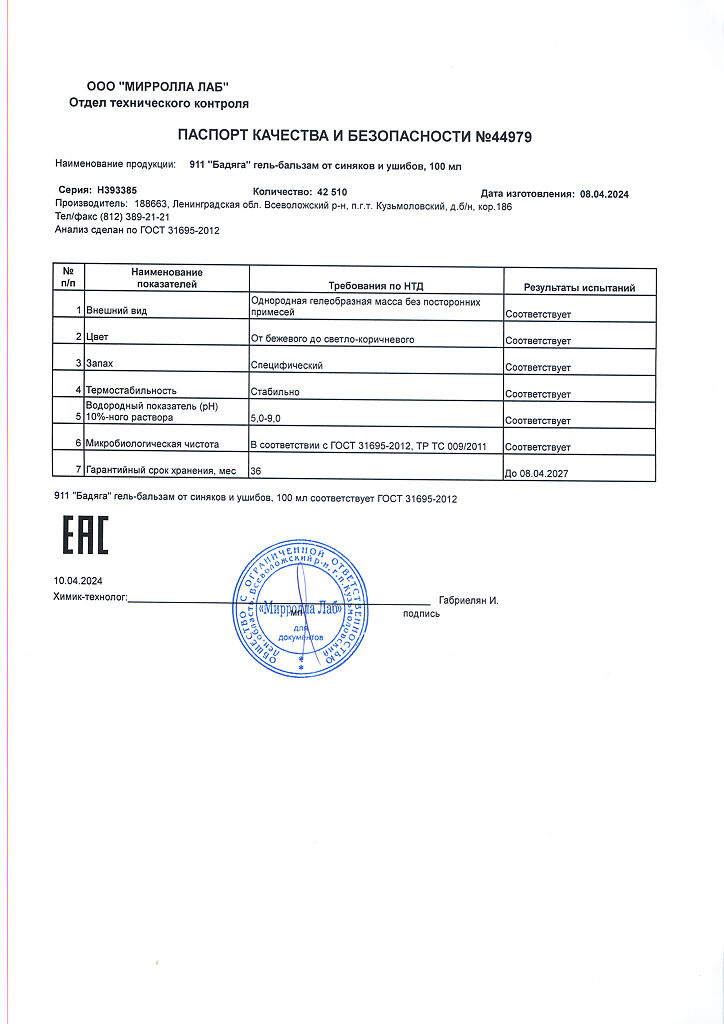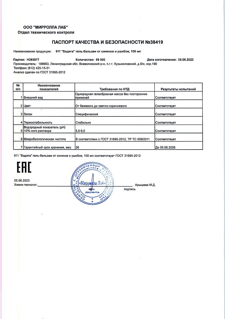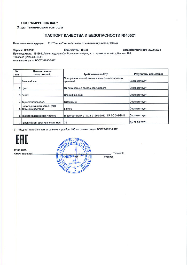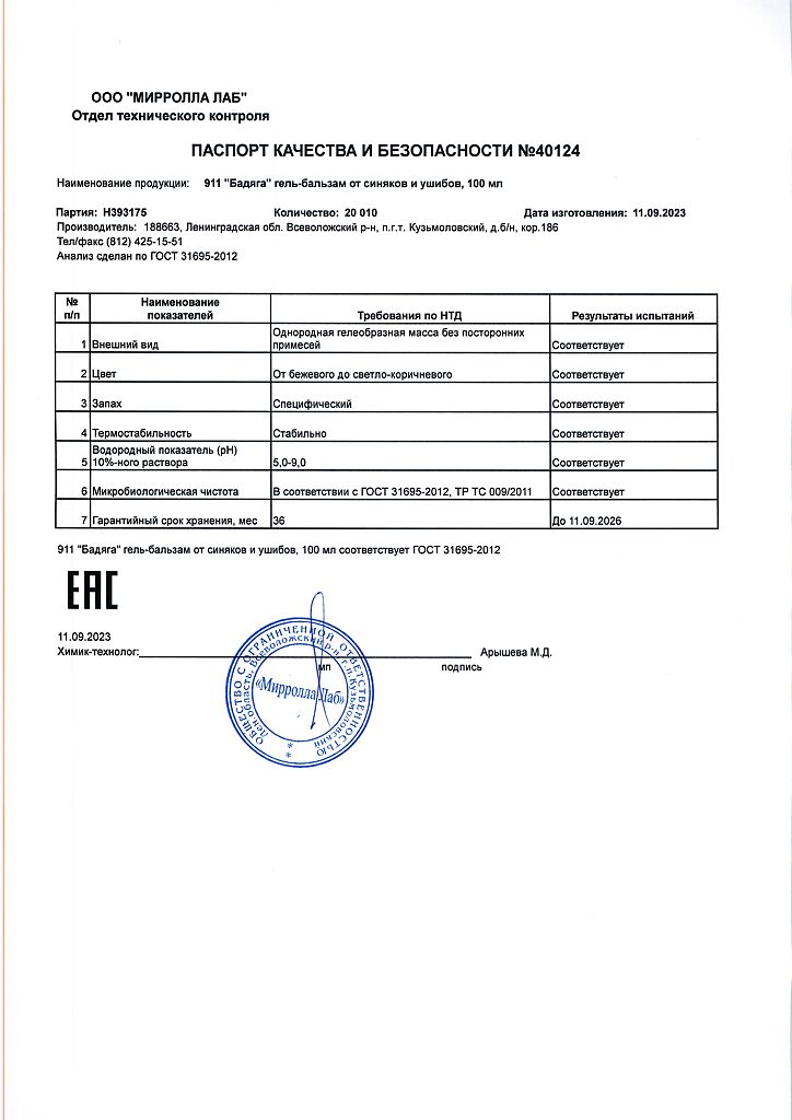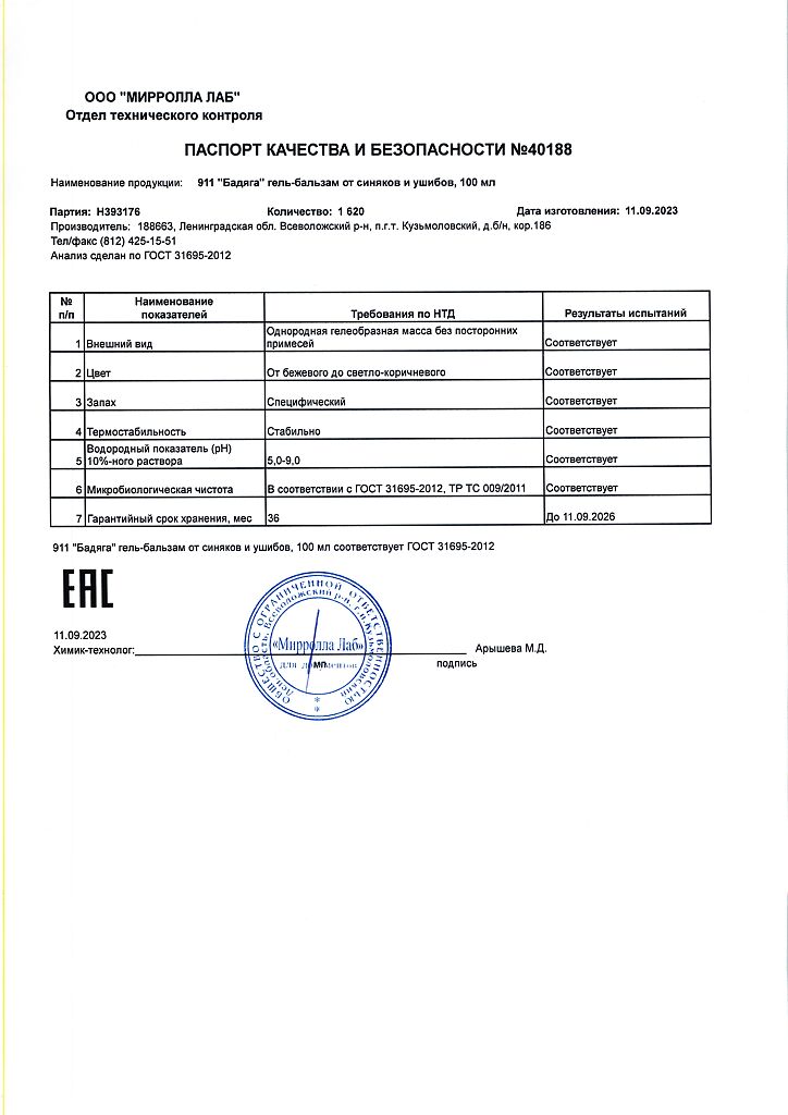 • 📒 Подробная инструкция по применению 911 Экстренная помощь Бадяга Гель для тела 100 мл 1 шт