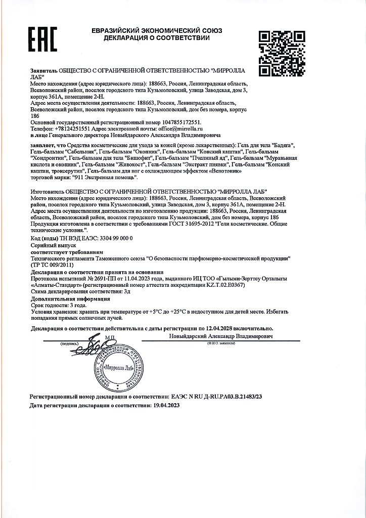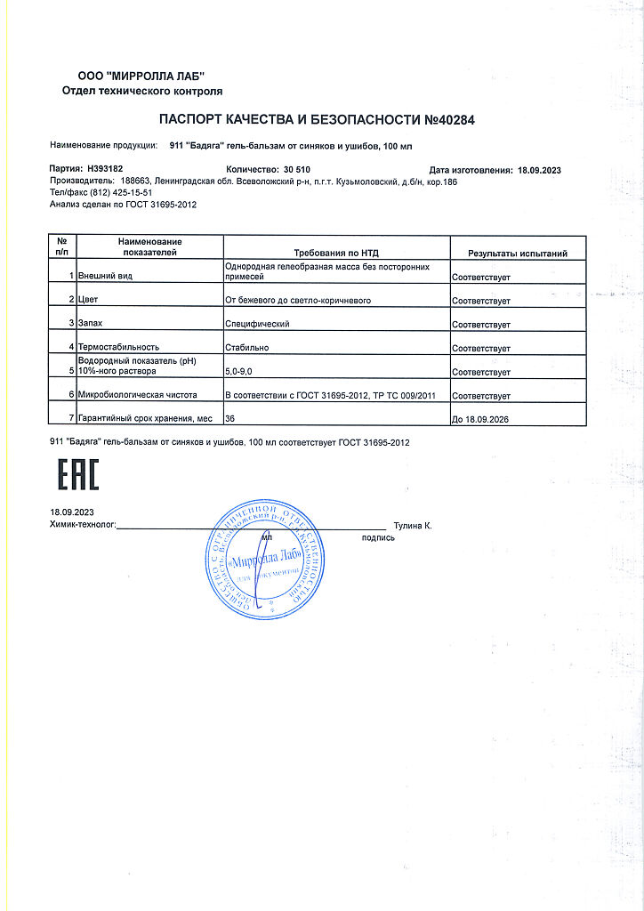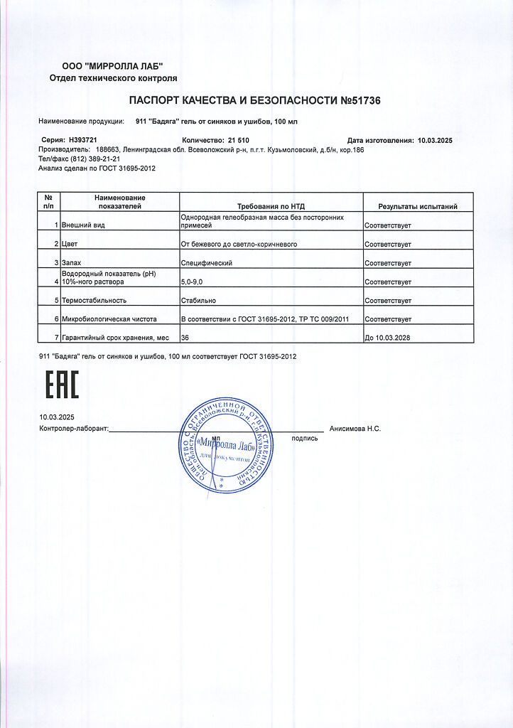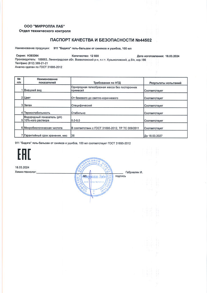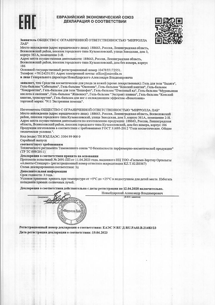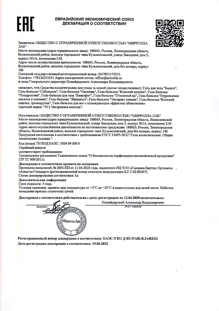 • 📒 Подробная инструкция по применению 911 Экстренная помощь Бадяга Гель для тела 100 мл 1 шт