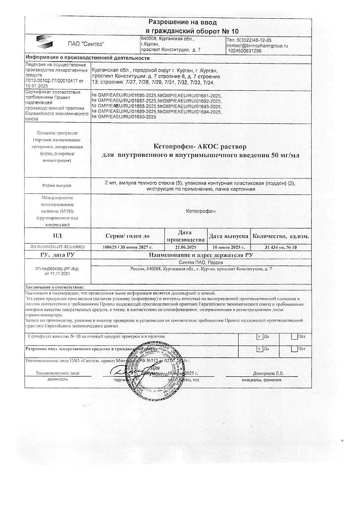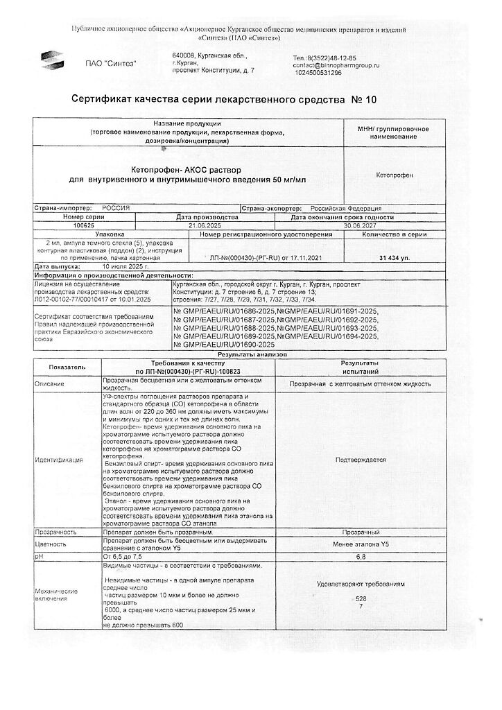 Документы Кетопрофен-АКОС раствор для в/в и в/м введ 50 мг/мл 2 мл амп 10 шт