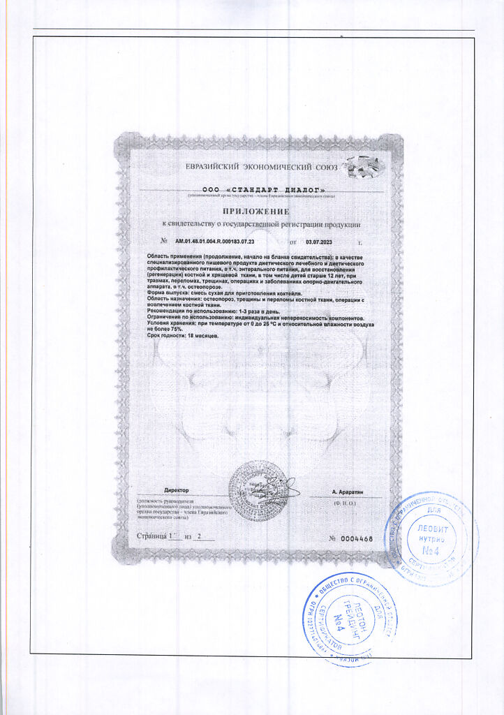 В качестве специализированного пищевого продукта диетического лечебного и диетического профилактического питания, в т.ч. энтеральным, для восстановления (регенерации) костной и хрящевой ткани при травмах, переломах, трещинах, операциях с вовлечением костной ткани и заболеваниях опорно-двигательного аппарата у пациентов от 12 лет и старше, в том числе при остеопорозе.