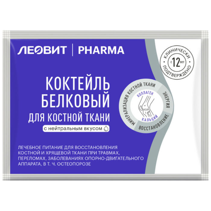 Леовит PHARMA/ФАРМА Коктейль для костной ткани – это специализированный белковый коктейль, содержащий дополнительно витамины, микроэлементы и специальные фитокомпоненты. Коктейль оказывает общеукрепляющее и противовоспалительное действие, стимулирует костеобразование и ускоряет регенерацию (восстановление) костей и хрящей. Эффективен при травмах (в т.ч. переломах) и заболеваниях опорно-двигательного аппарата (остеопорозе и др.).