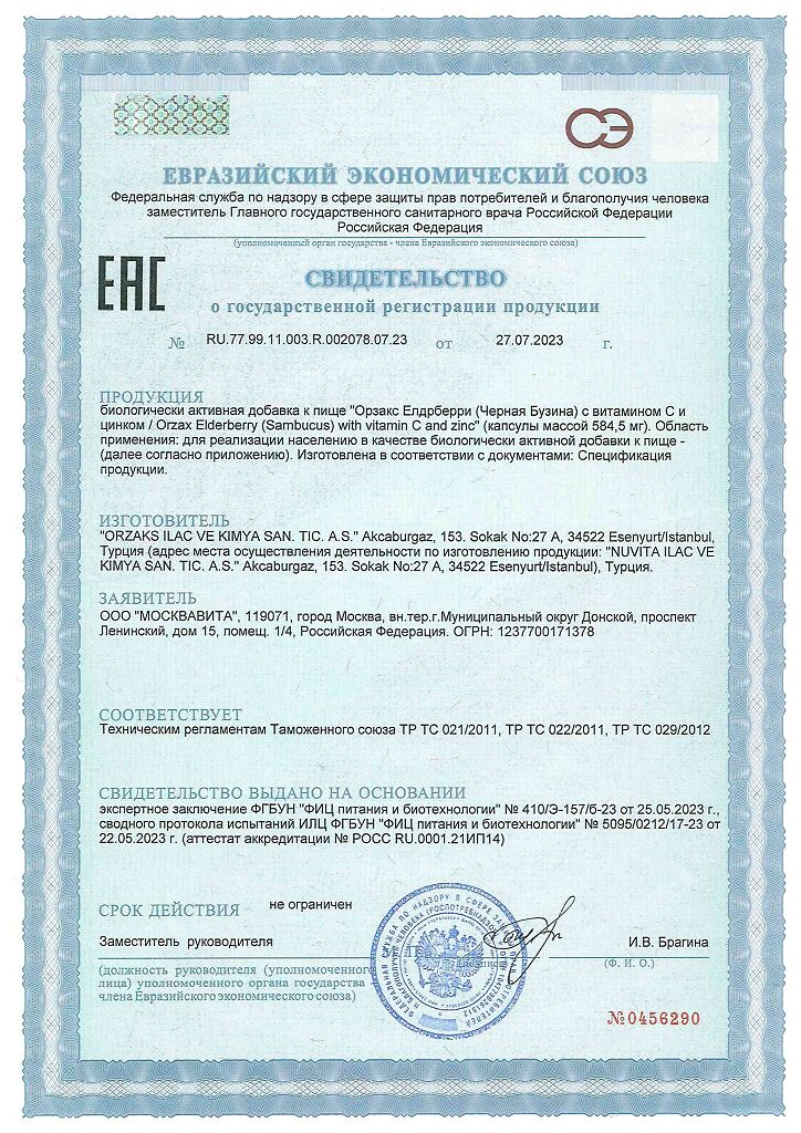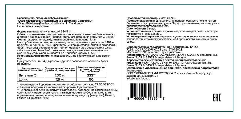 Документы Orzax Черная Бузина комплекс для иммунитета+витамин С и Цинк/Elderberry Sambucus капсулы массой 584,5 мг 60 шт