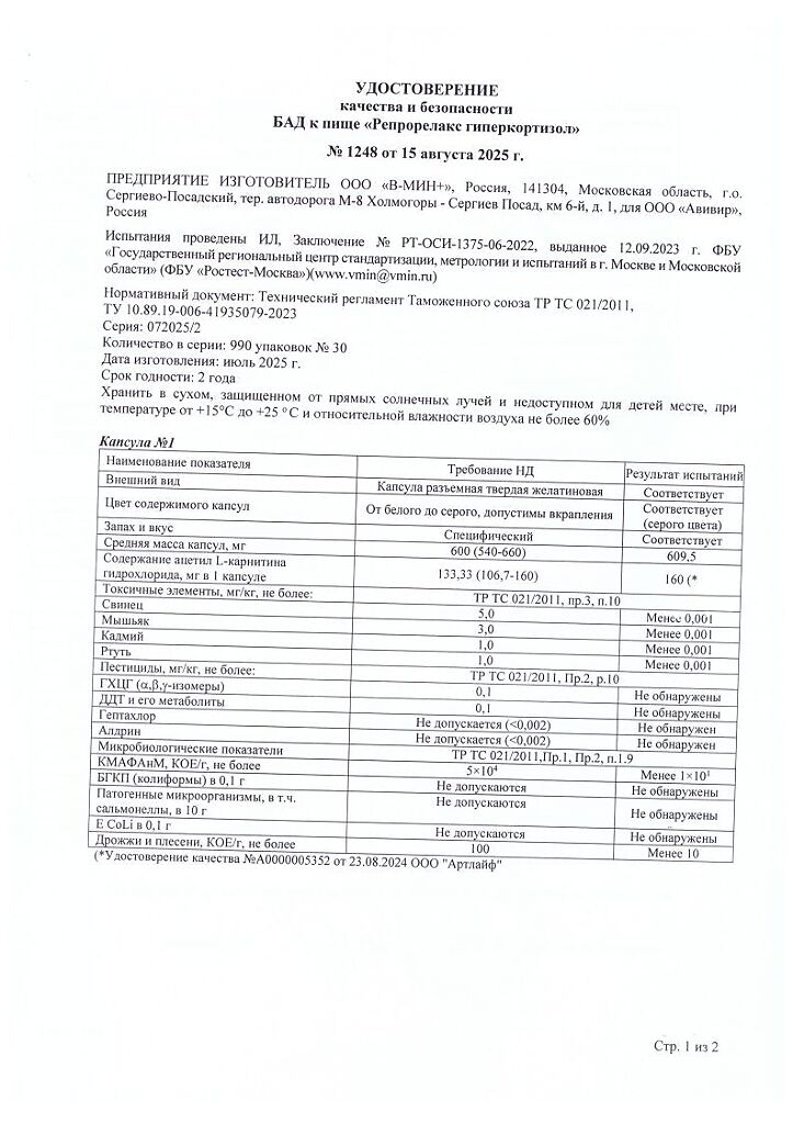 Документы Репрорелакс гиперкортизол комплекс (саше-пакет- капсула №1 массой 600 мг, капсула №2 массой 600 мг, таблетка массой 910 мг) 1 уп