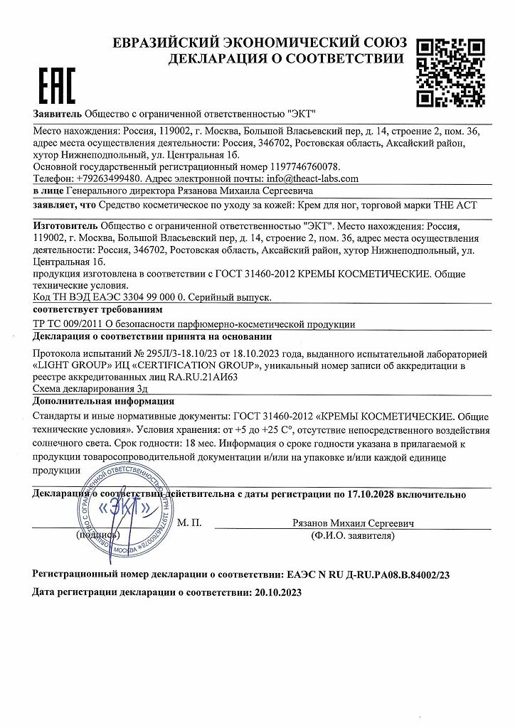 Документы The Act Смягчающий крем для ног с мочевиной лимон 150 мл 1 шт