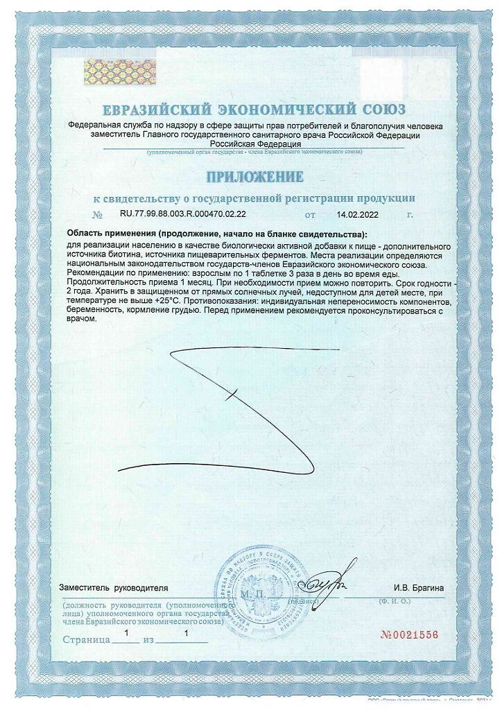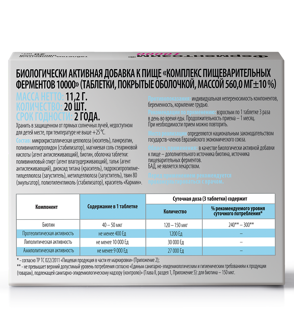 Микрокристаллическая целлюлоза (носитель), панкреатин (из поджелудочной железы крупного рогатого скота), поливинилпирролидон (стабилизатор), магниевая соль стеариновой кислоты (агент антислеживающий), биотин, оболочка таблетки: поливиниловый спирт (агент влагоудерживающий), тальк (агент антислеживающий), диоксид титана (краситель), гидроксипропилметилцеллюлоза (загуститель), метилцеллюлоза (загуститель), твин 80 (эмульгатор), краситель кармин, полиэтиленгликоль (стабилизатор).