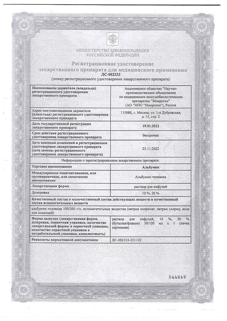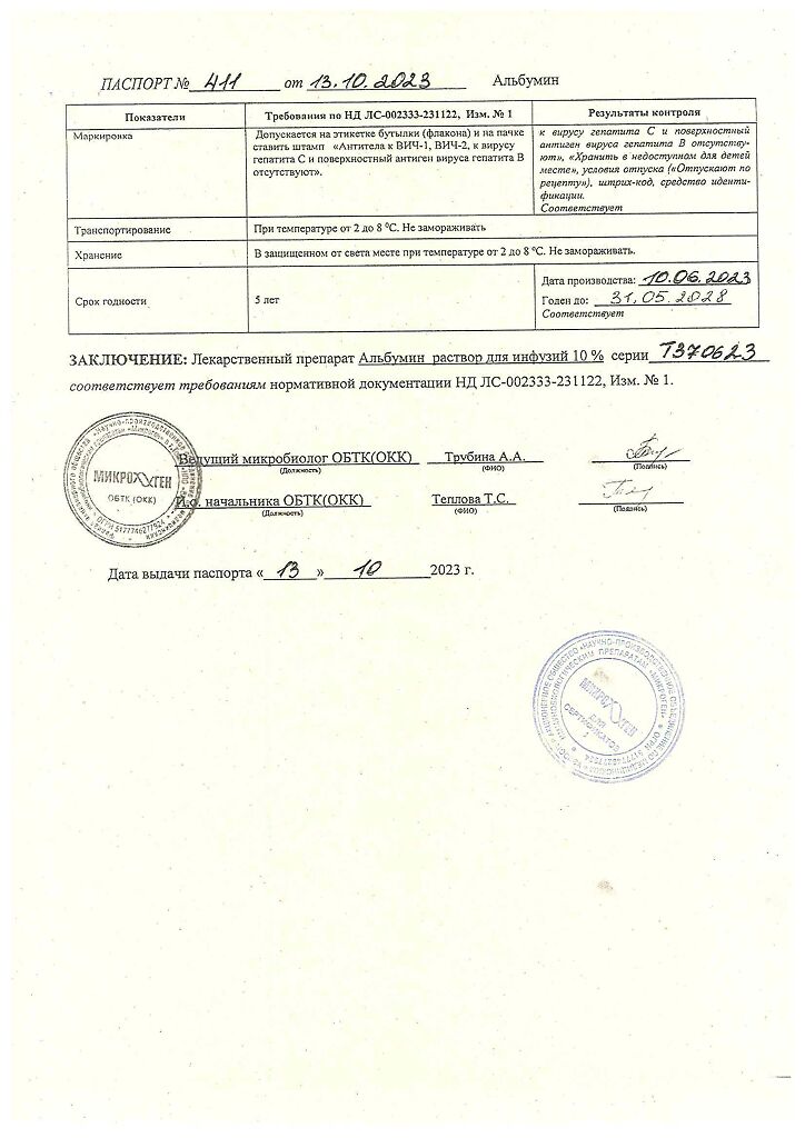 Альбумин раствор для инфузий 10 % 100 мл фл 1 шт