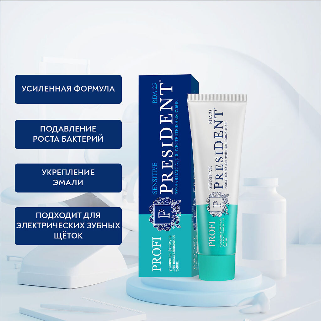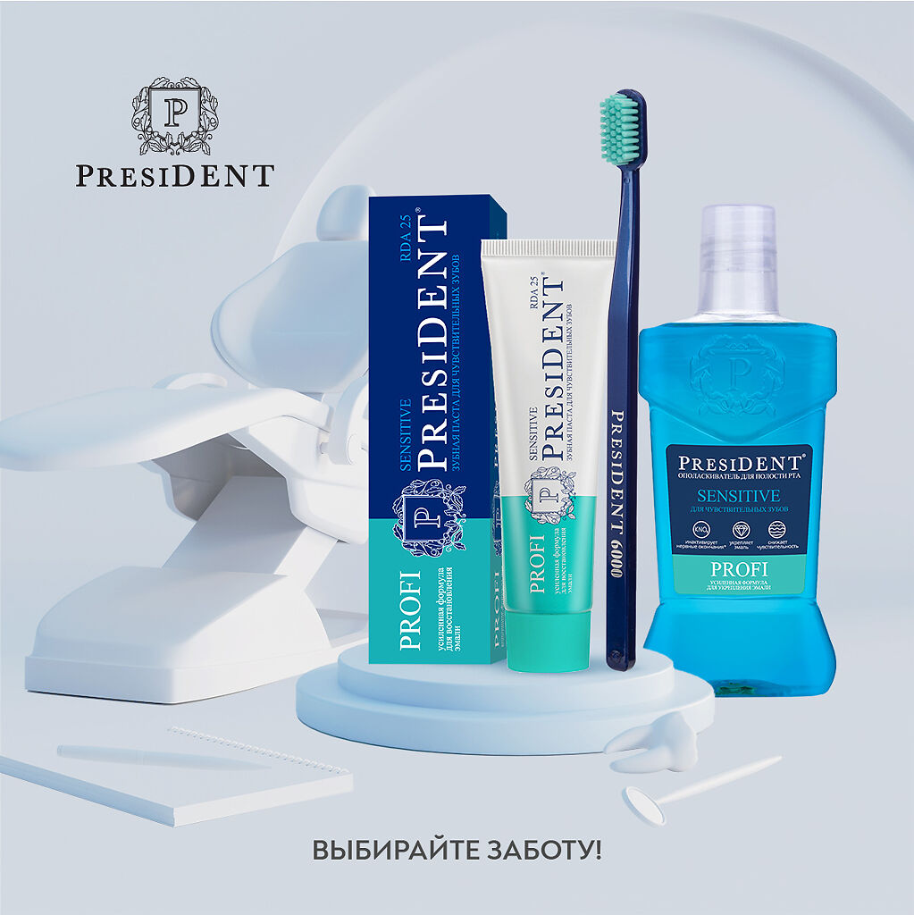 ПрезиДЕНТ Сенситив лечебно-профилактическая зубная паста для чувствительных зубов и десен со вкусом натуральной мяты, обеспечивает защиту от пришеечного кариеса, укрепляет зубную эмаль, имеет контролируемую абразивность RDA 25, придает свежесть дыханию.