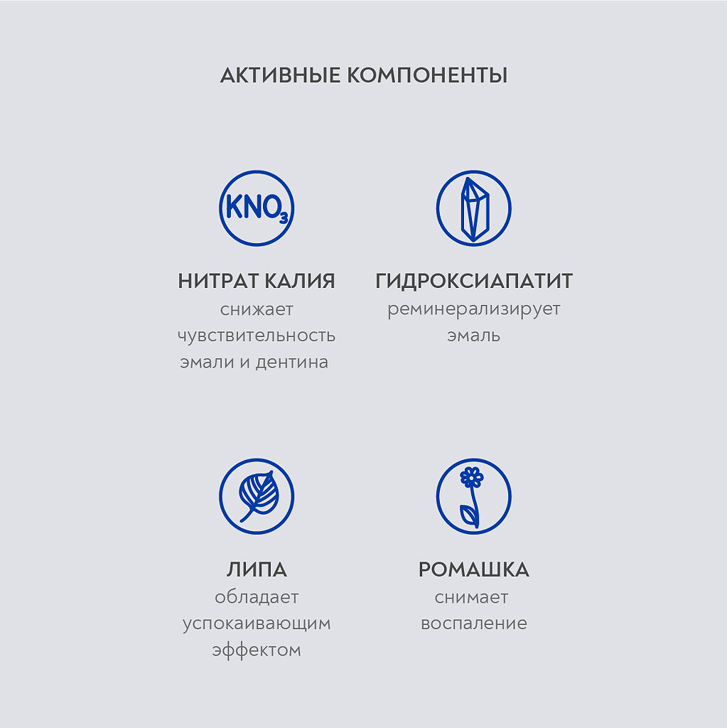 Восстанавливает защиту нервных волокон, заполняет микротрещины. Уменьшает реакцию на раздражители: «горячее-холодное», «кислое-сладкое».