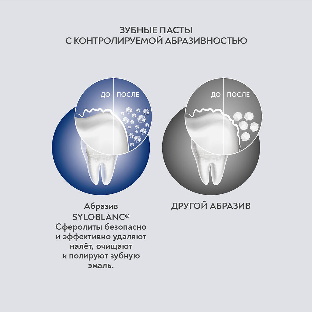 Обладает противовоспалительным и болеутоляющим действиями. Предупреждает развитие пришеечного кариеса и укрепляет зубную эмаль. Чистящий компонент - Syloblanc - гарантирует длительную активность ионов фтора и обеспечивает контролируемую абразивность с показателем RDA25.