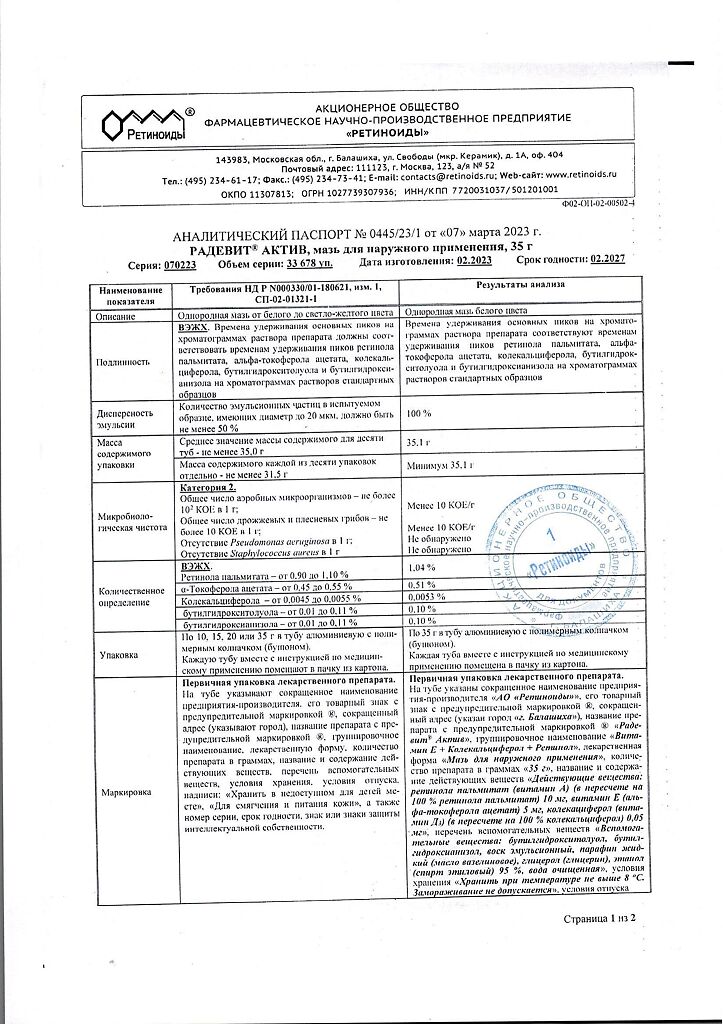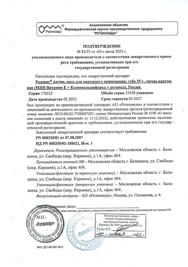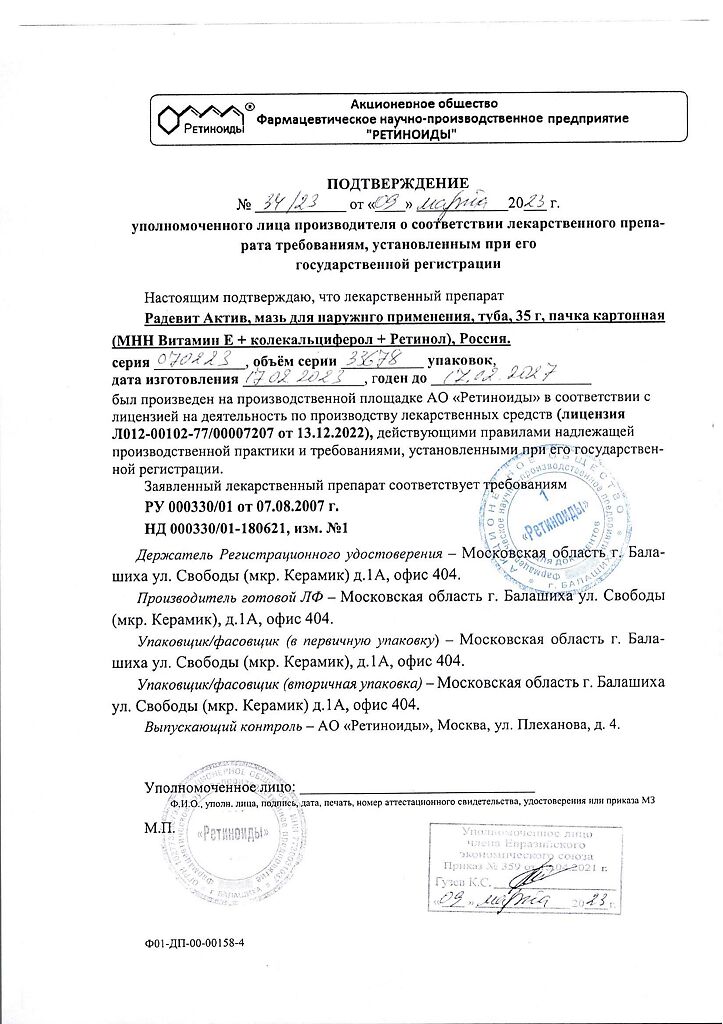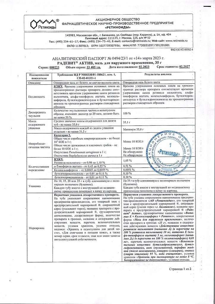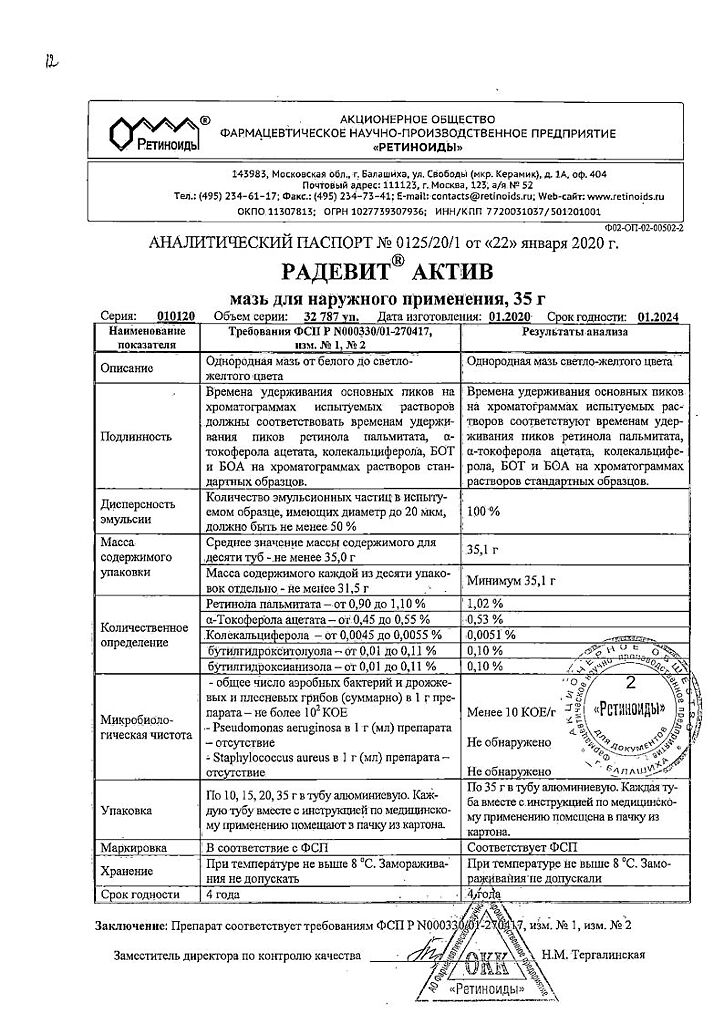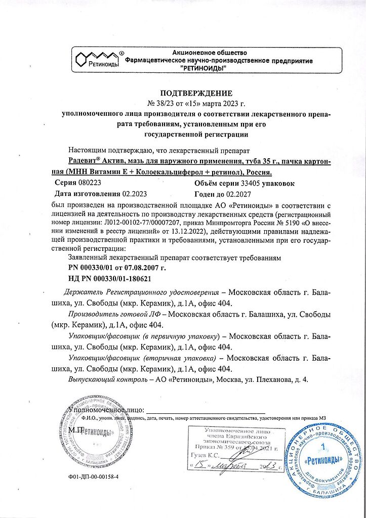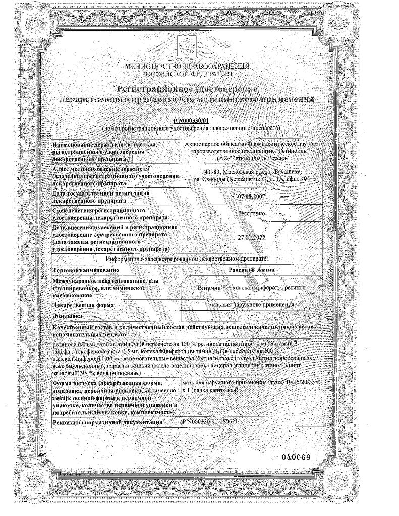 Документы Радевит Актив мазь для наружного применения 35 г 1 шт