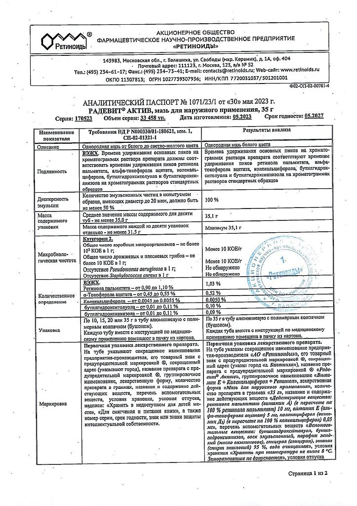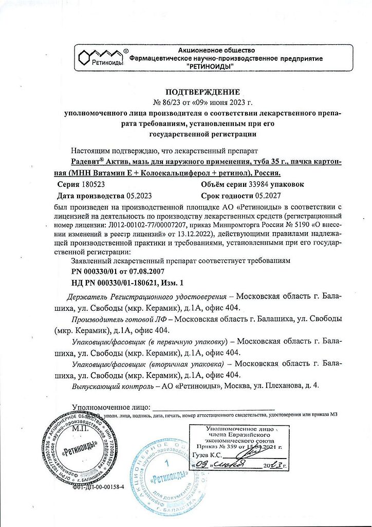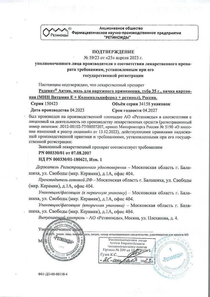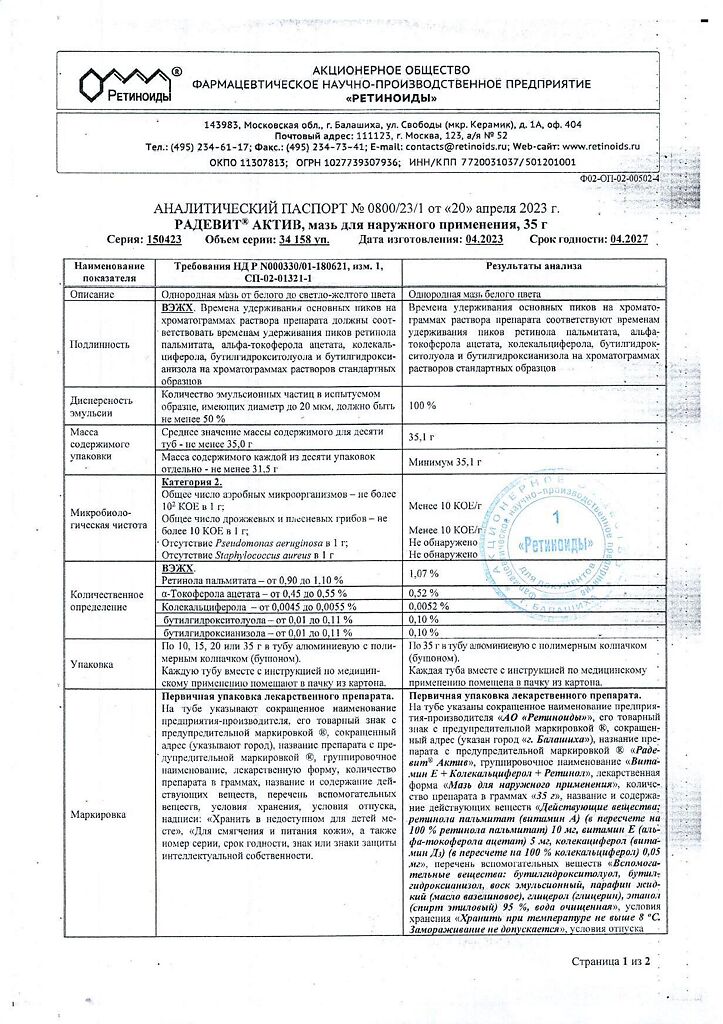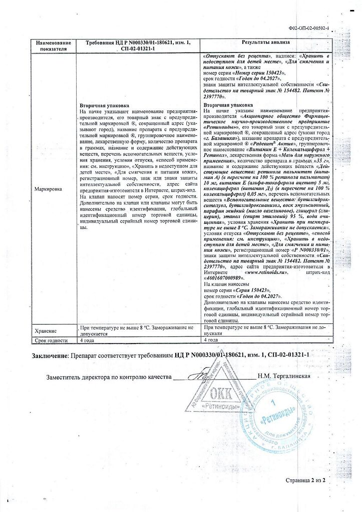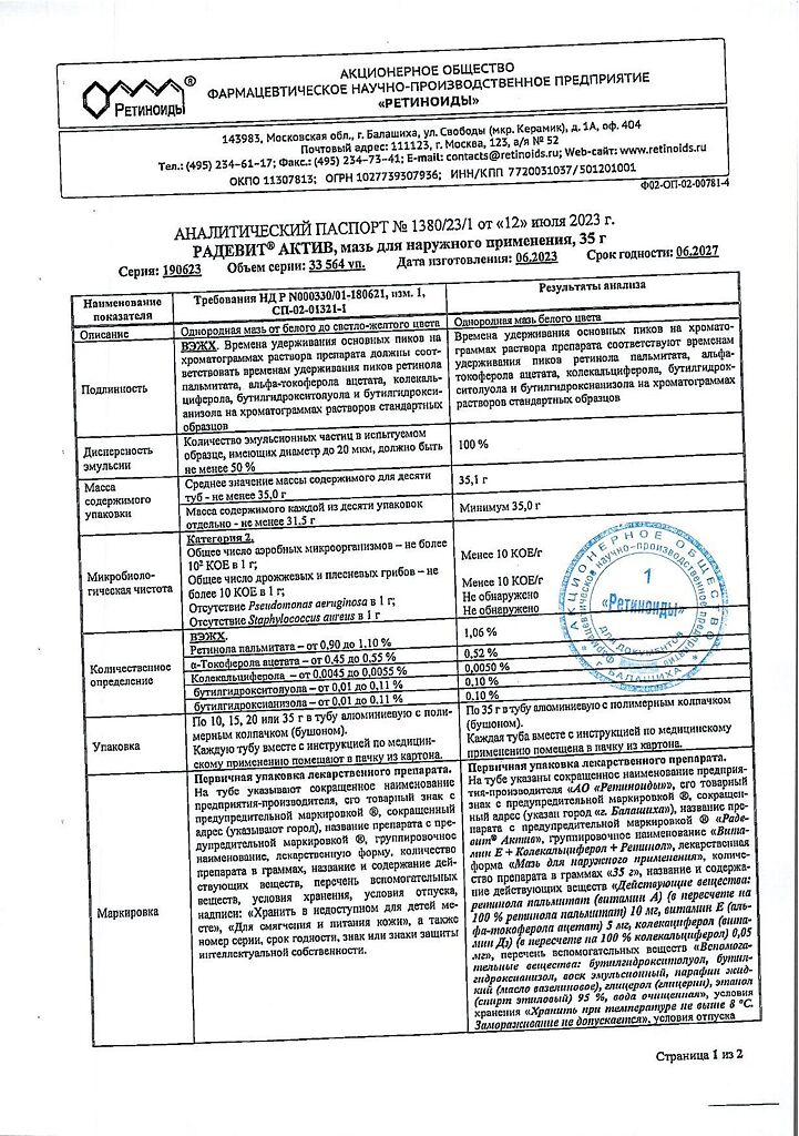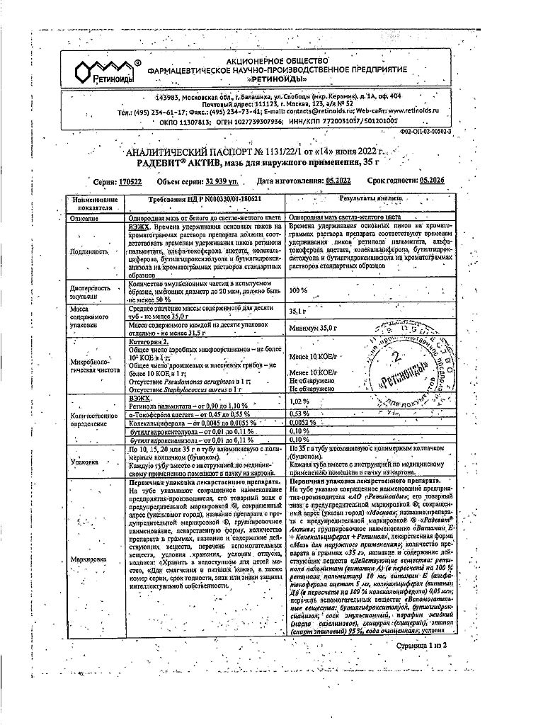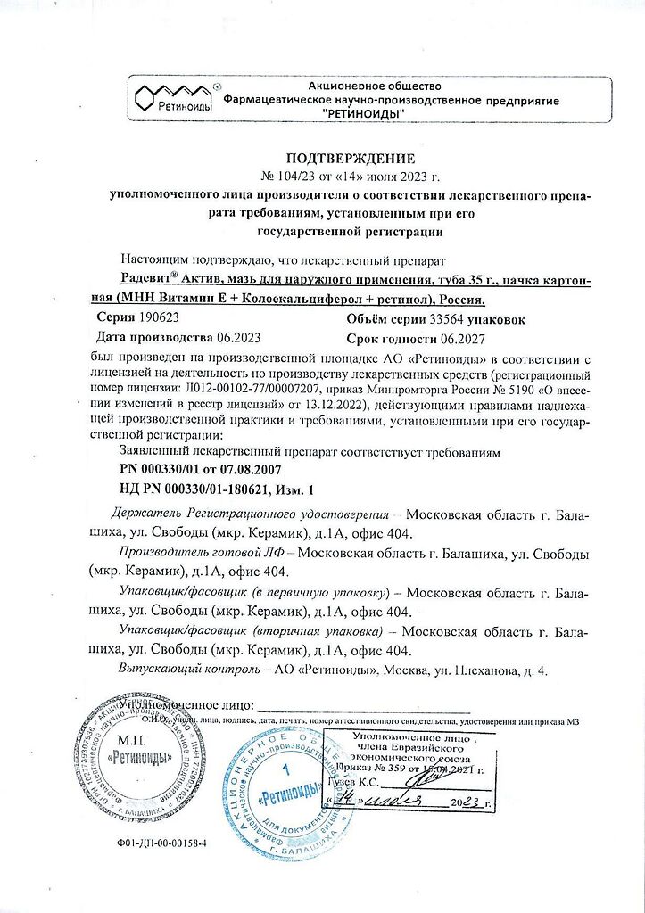 Документы Радевит Актив мазь для наружного применения 35 г 1 шт