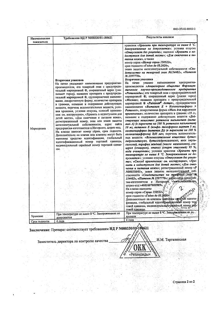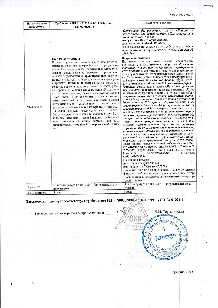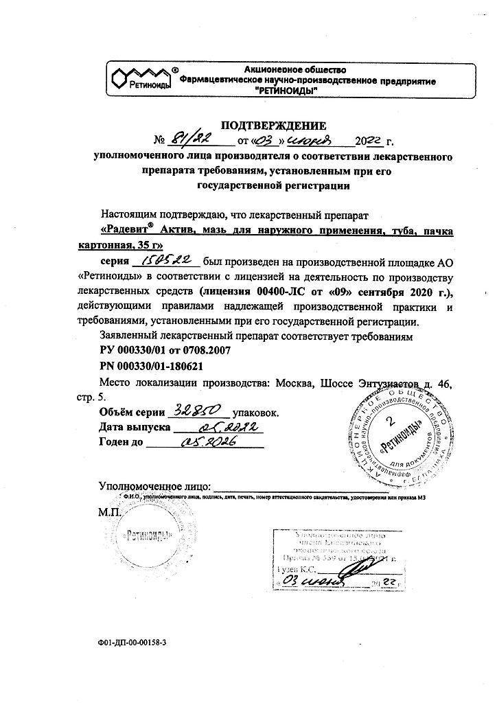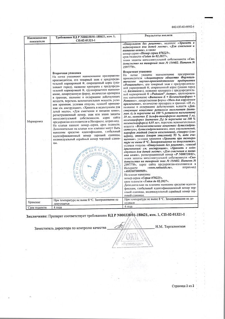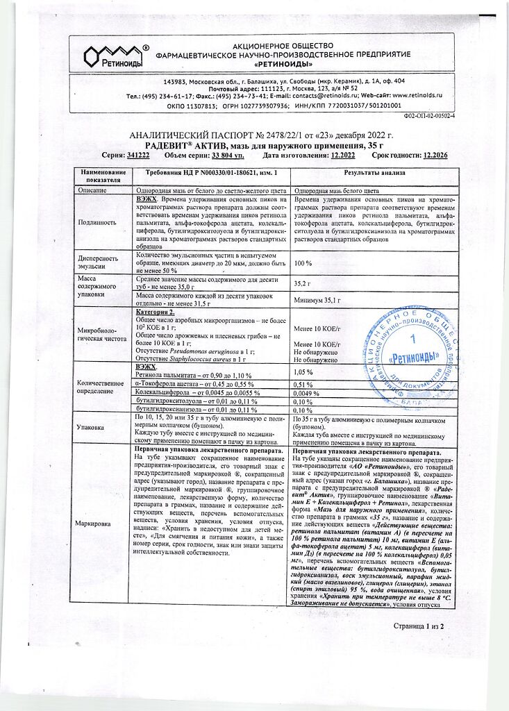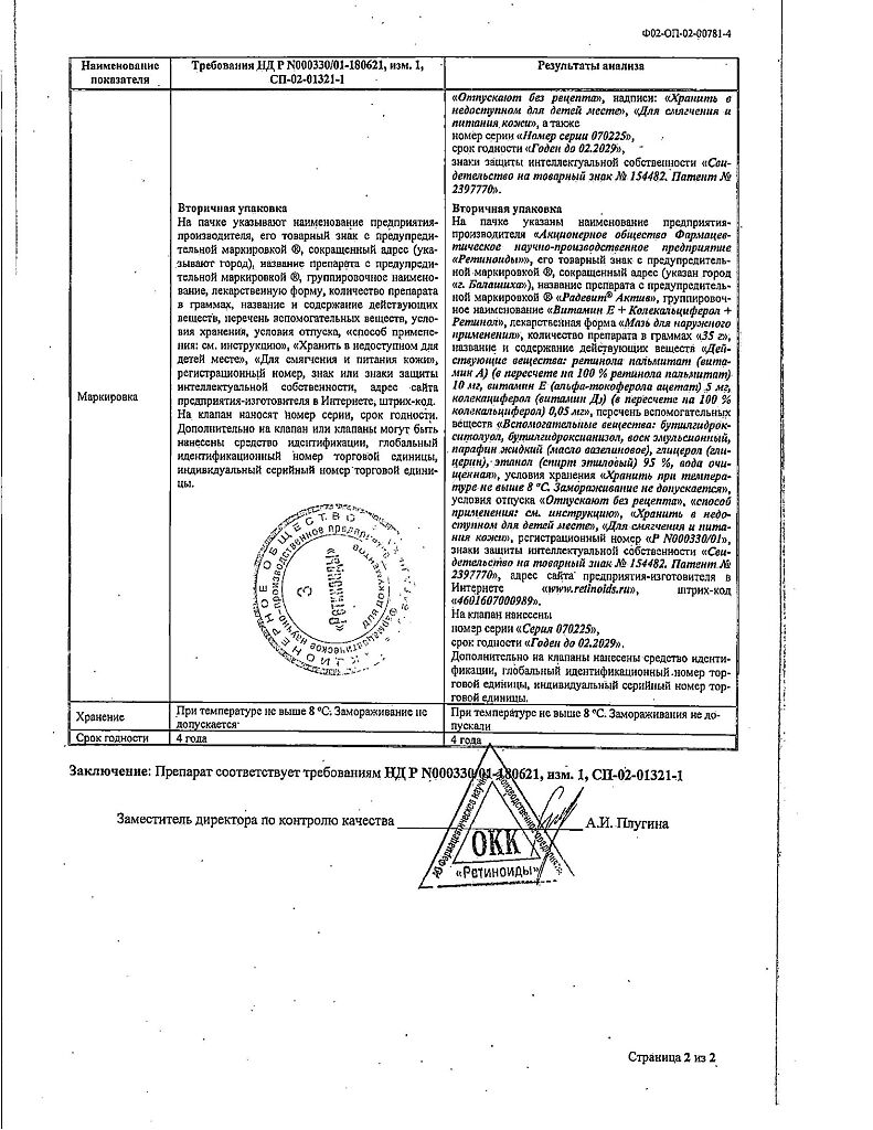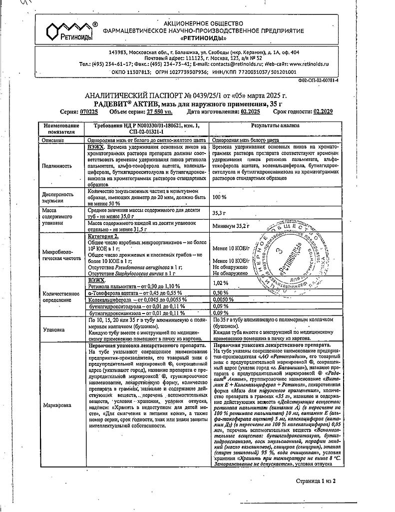 Документы Радевит Актив мазь для наружного применения 35 г 1 шт