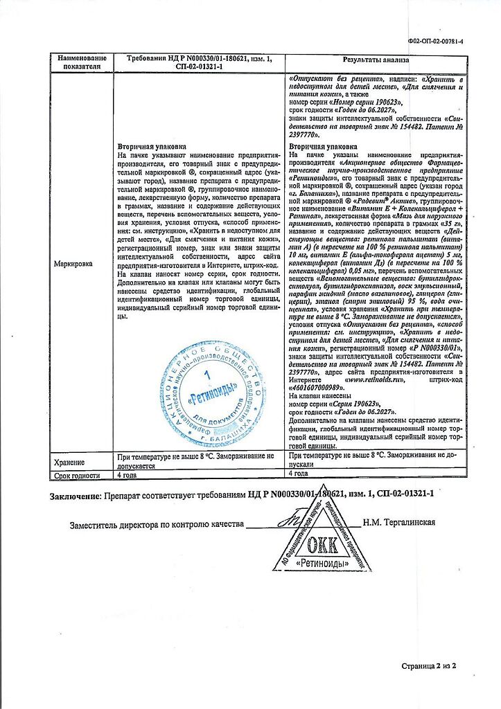 Действующее вещество: Ретинол, Витамин Е, Эргокальциферол