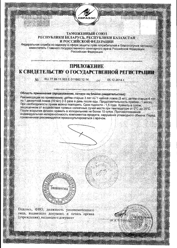 Детям старше 3 лет по 1 чайной ложке (5 мл), детям старше 6 лет по 1 десертной ложке (10 мл) 2-3 раза в день после еды. Продолжительность приёма - 1 месяц. При необходимости прием можно повторить.