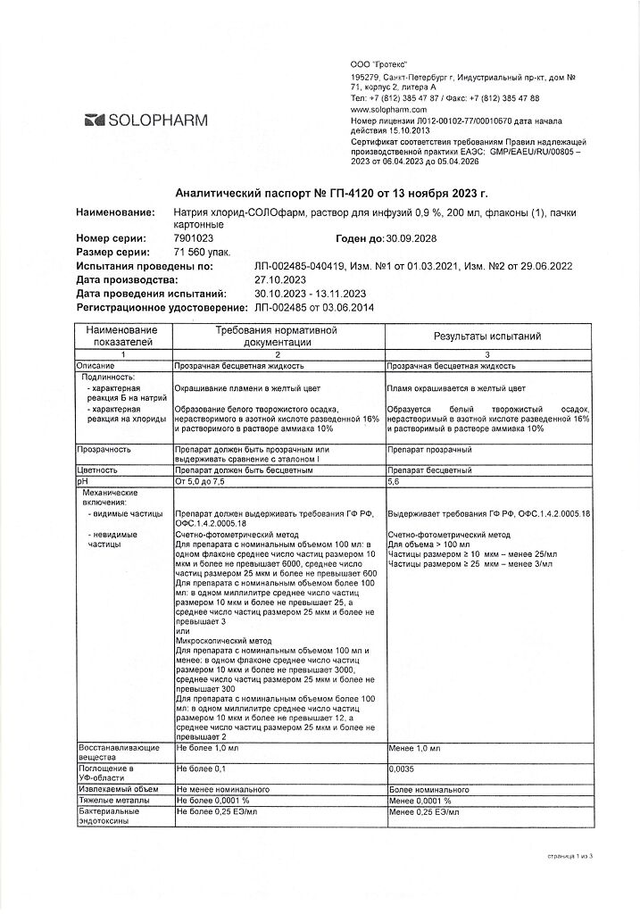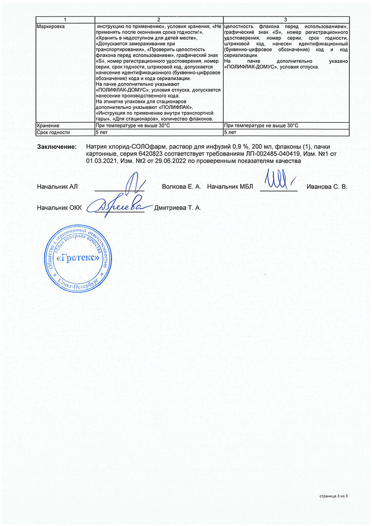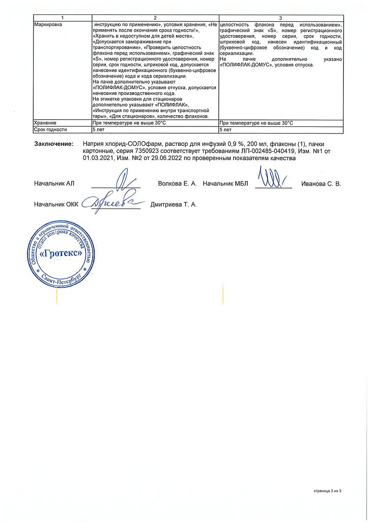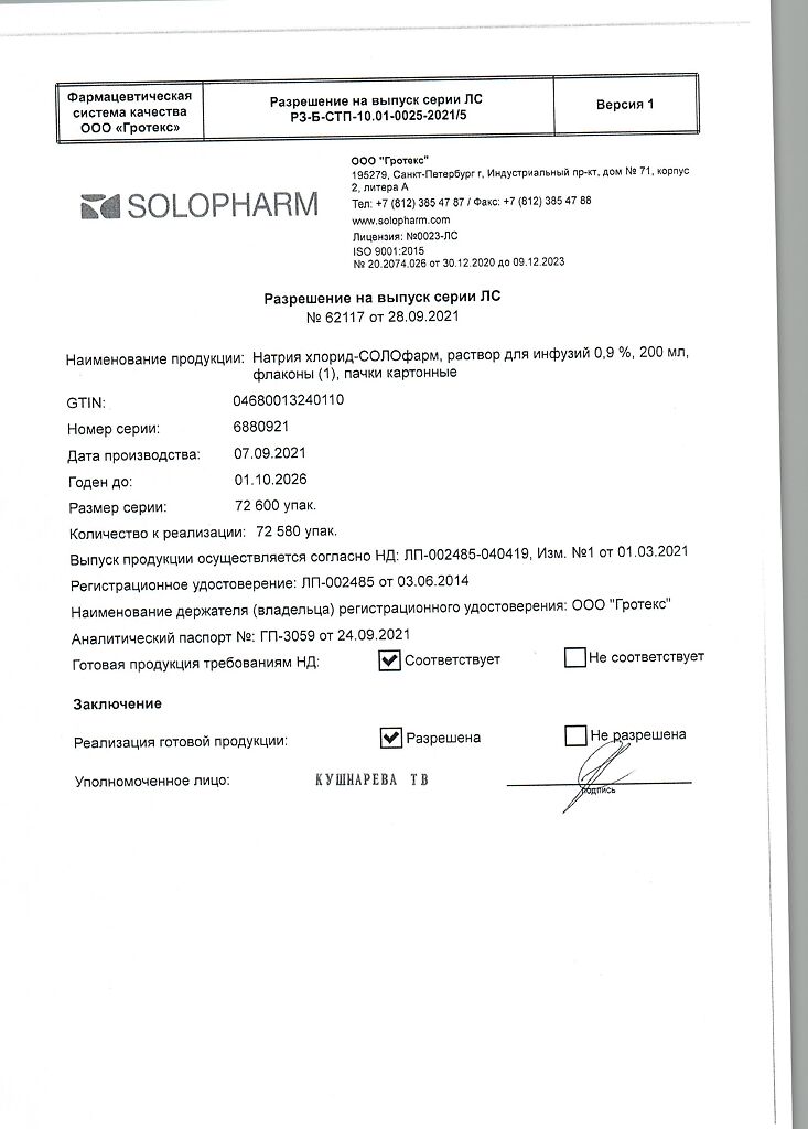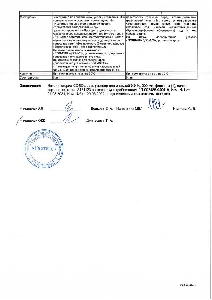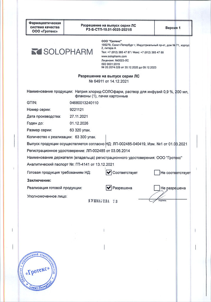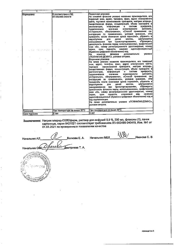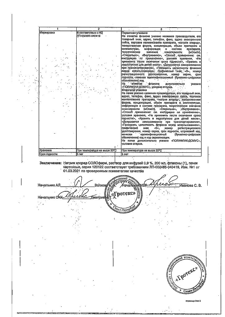 Натрия хлорид-СОЛОфарм Домус раствор для инфузий 0,9 % 200 мл фл 1 шт