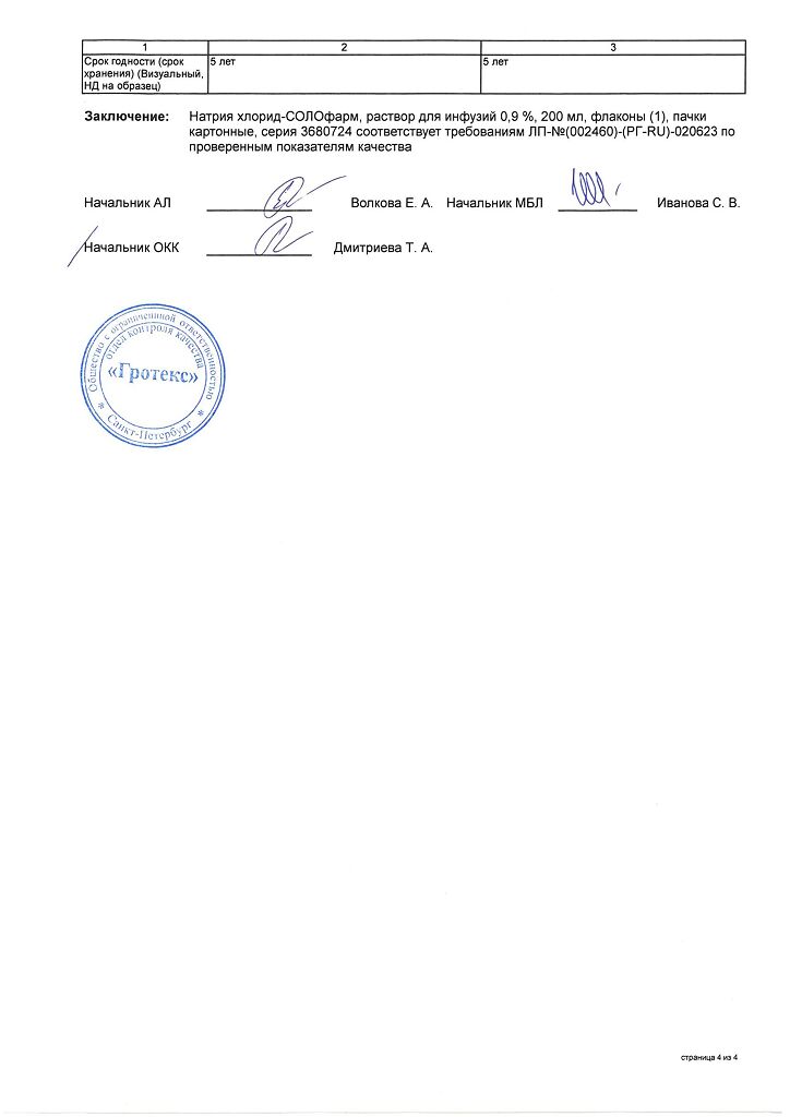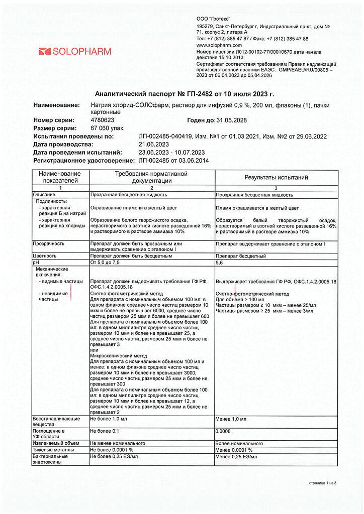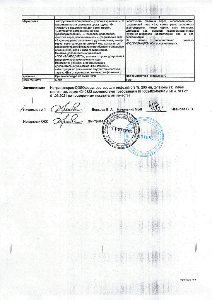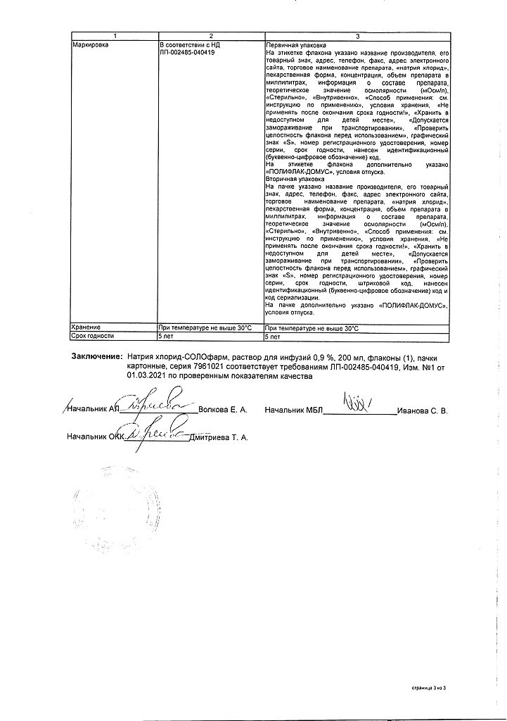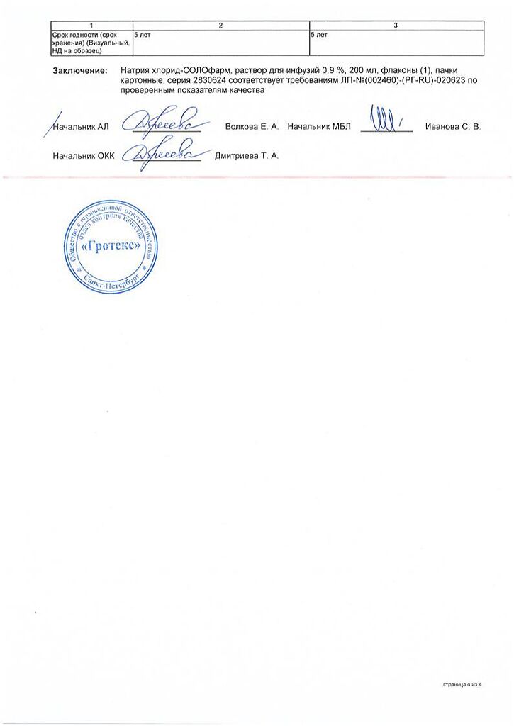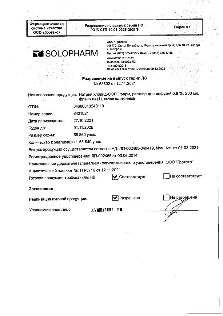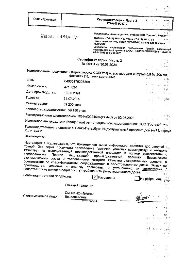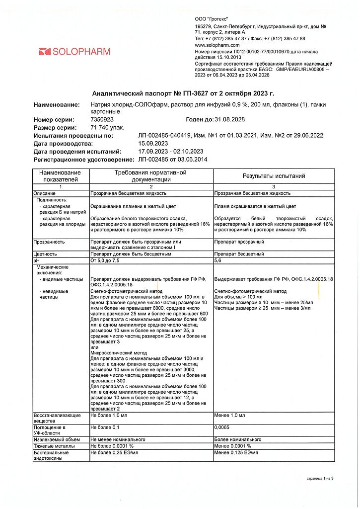 Натрия хлорид-СОЛОфарм Домус раствор для инфузий 0,9 % 200 мл фл 1 шт