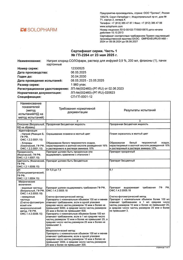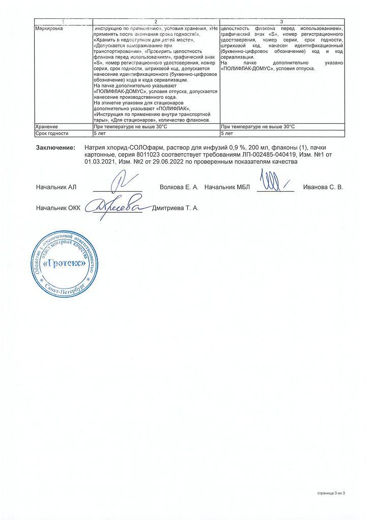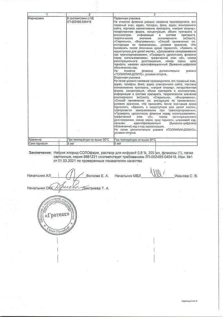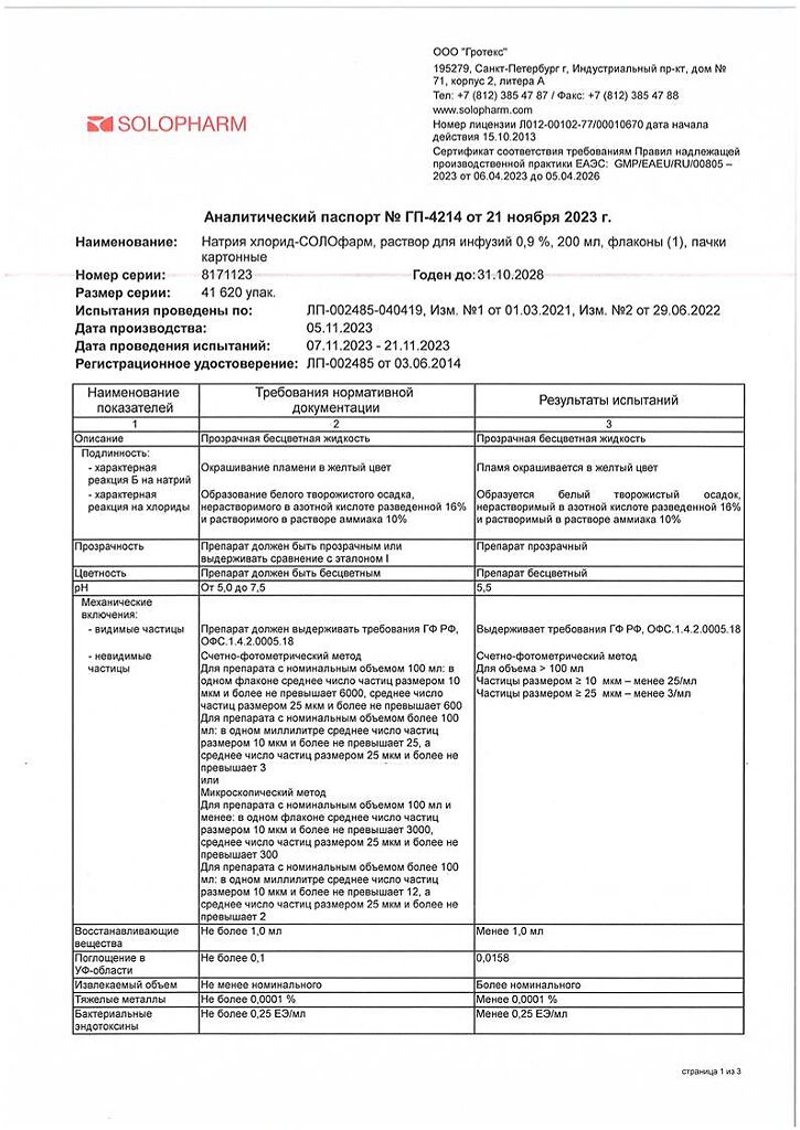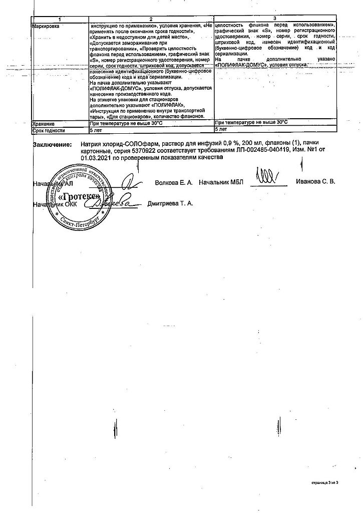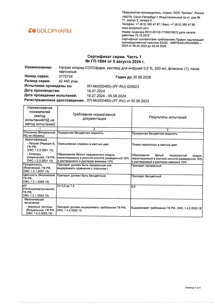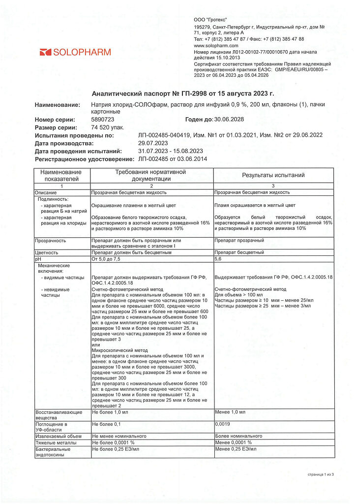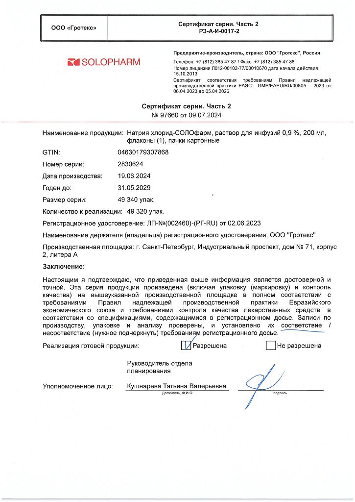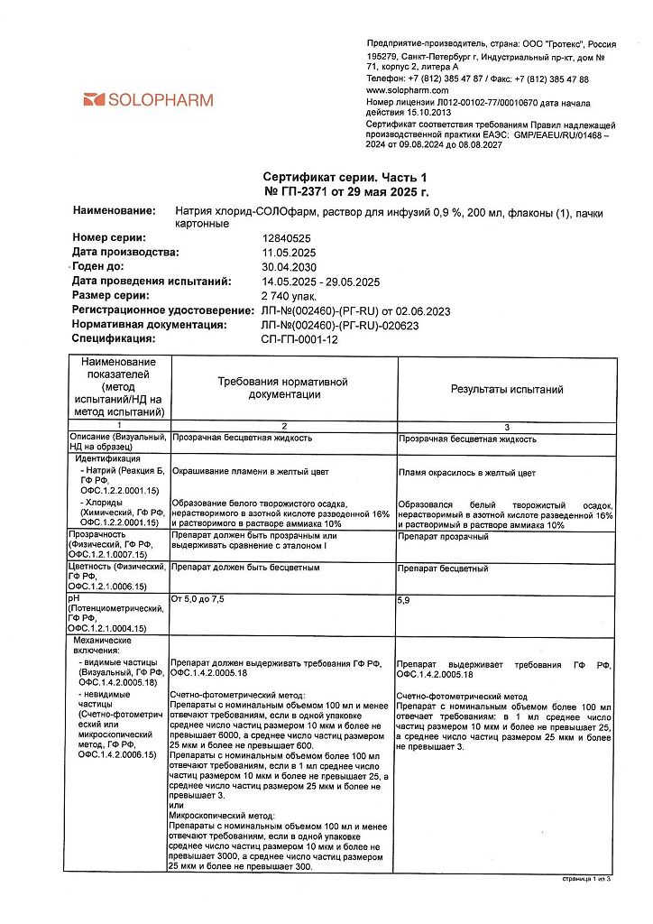 Натрия хлорид-СОЛОфарм Домус раствор для инфузий 0,9 % 200 мл фл 1 шт