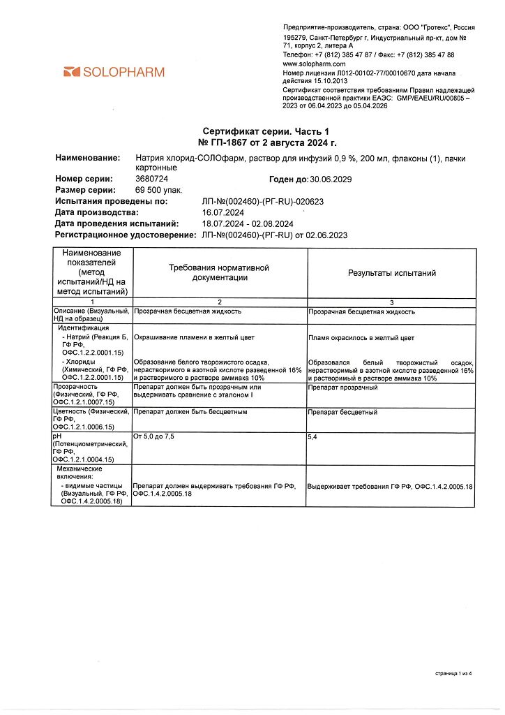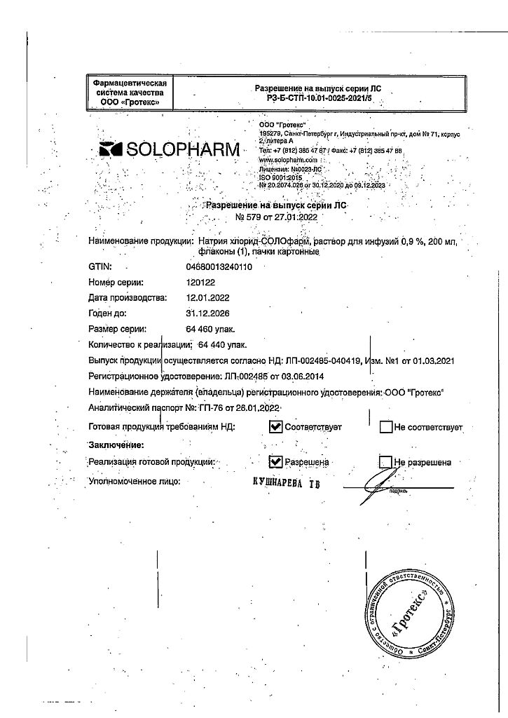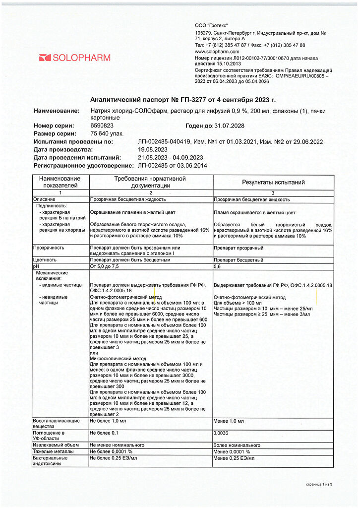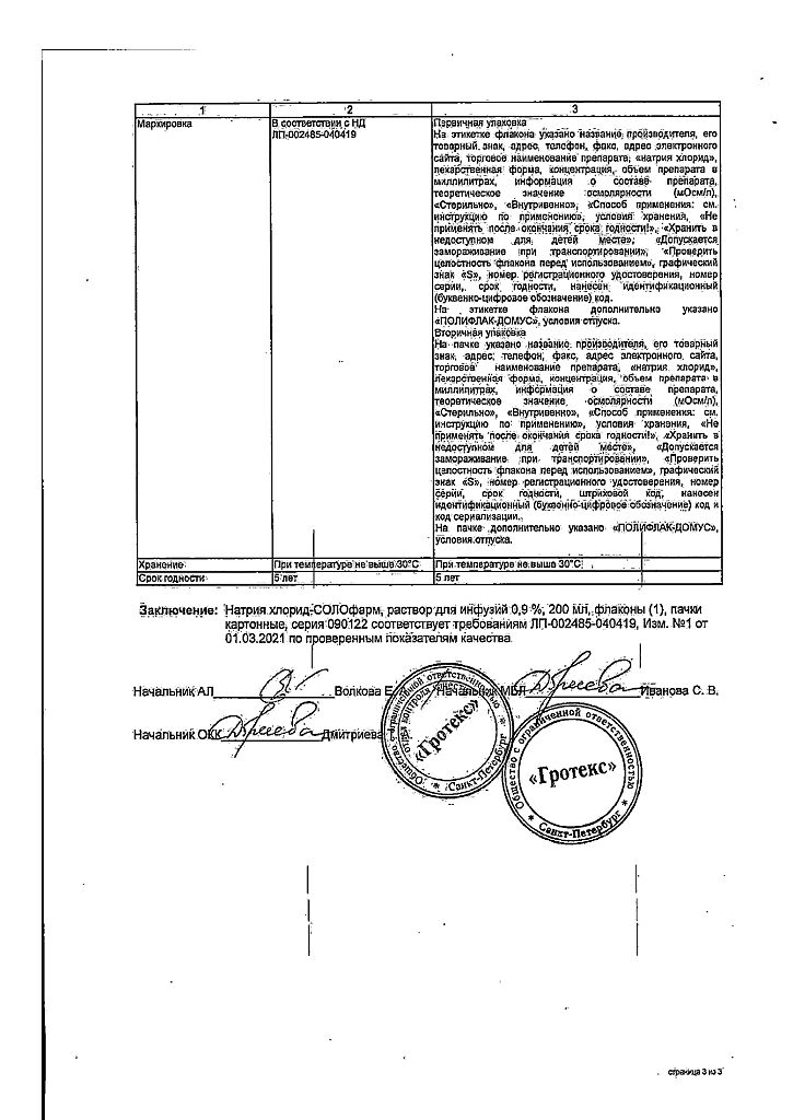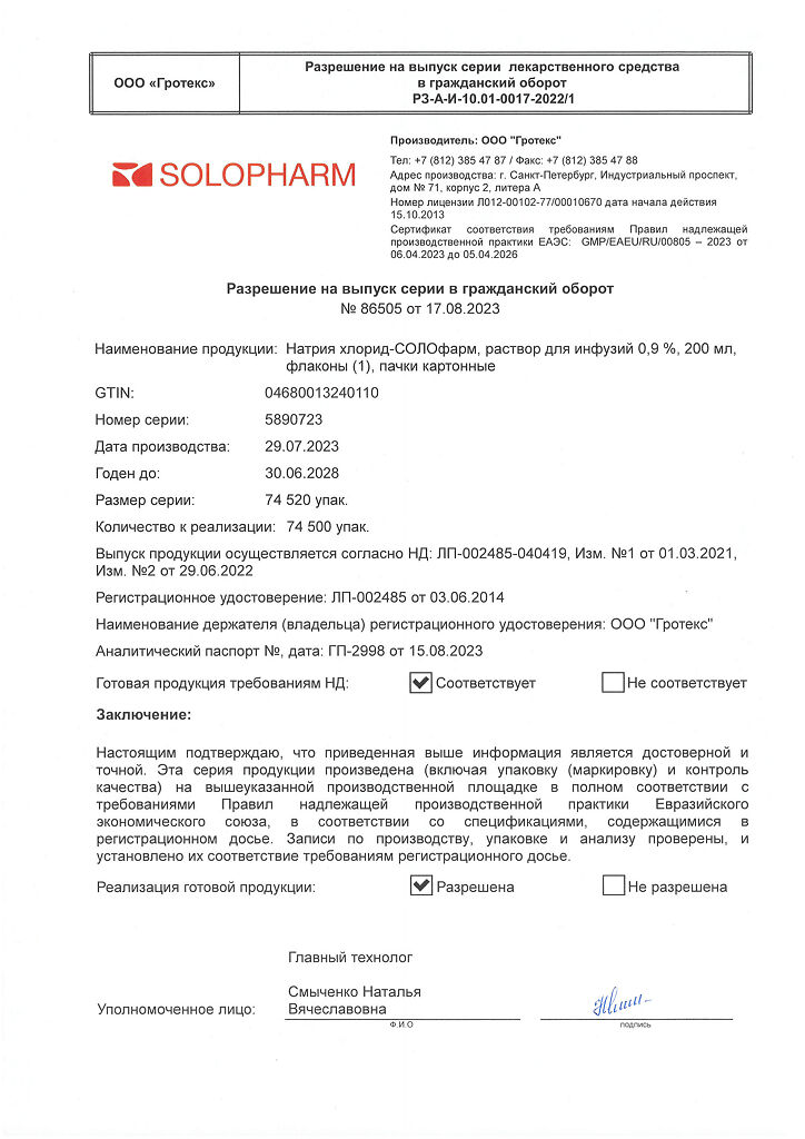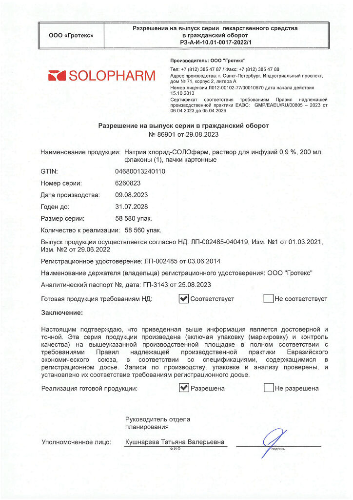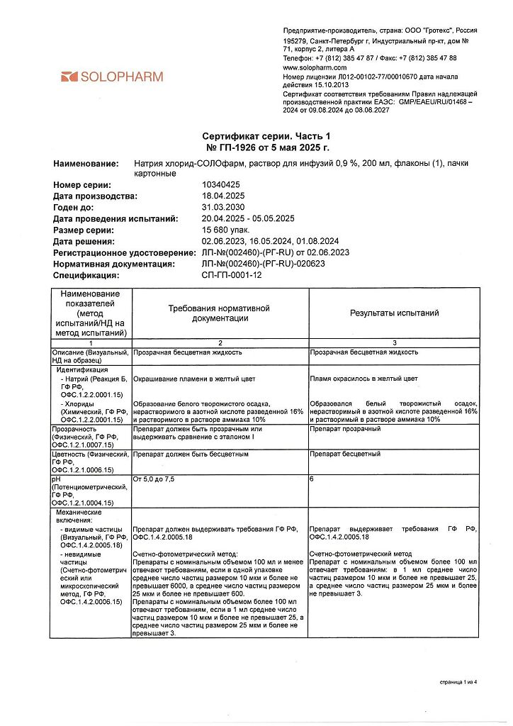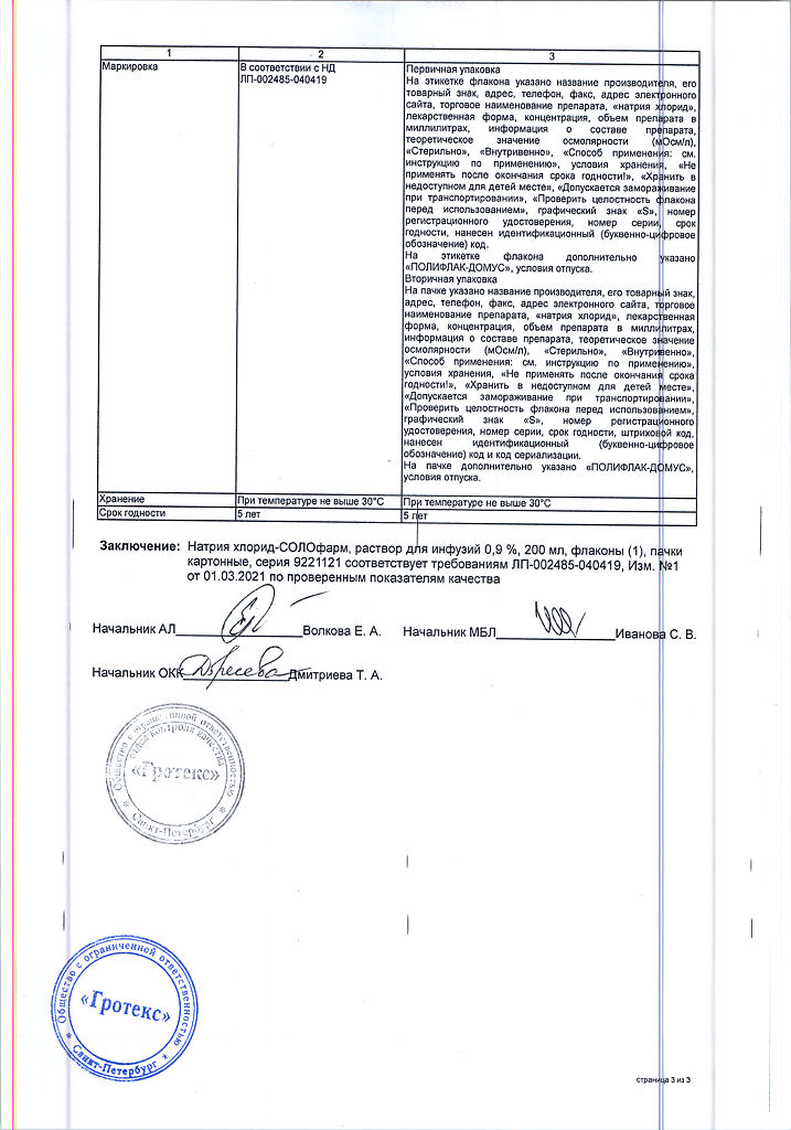 Натрия хлорид-СОЛОфарм Домус раствор для инфузий 0,9 % 200 мл фл 1 шт