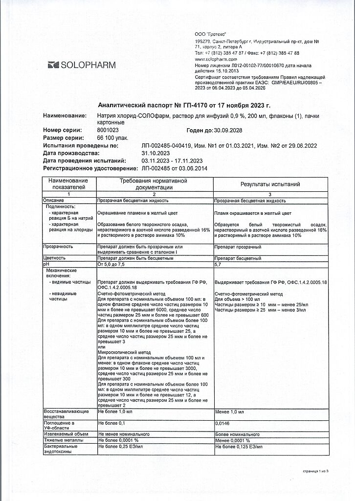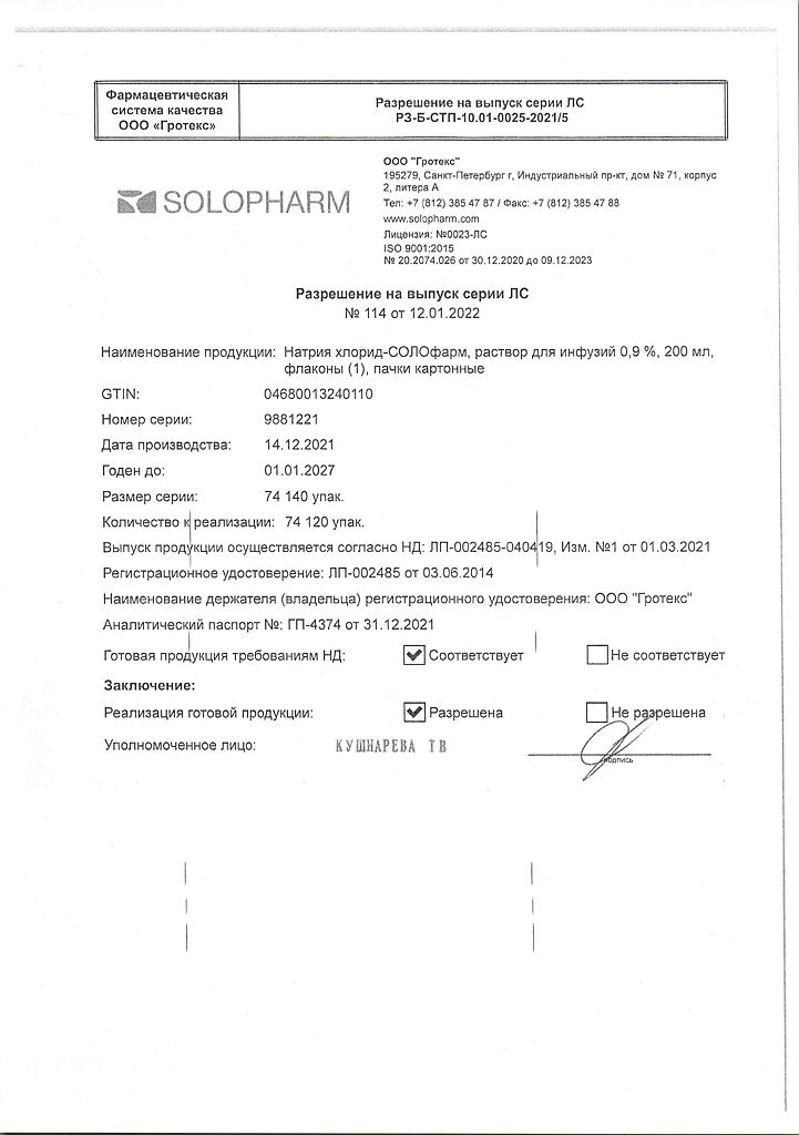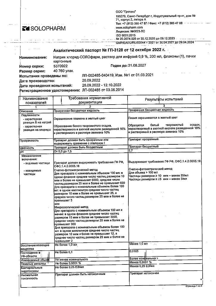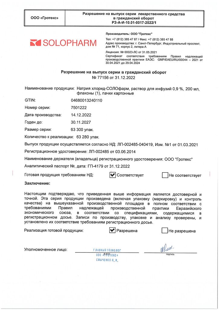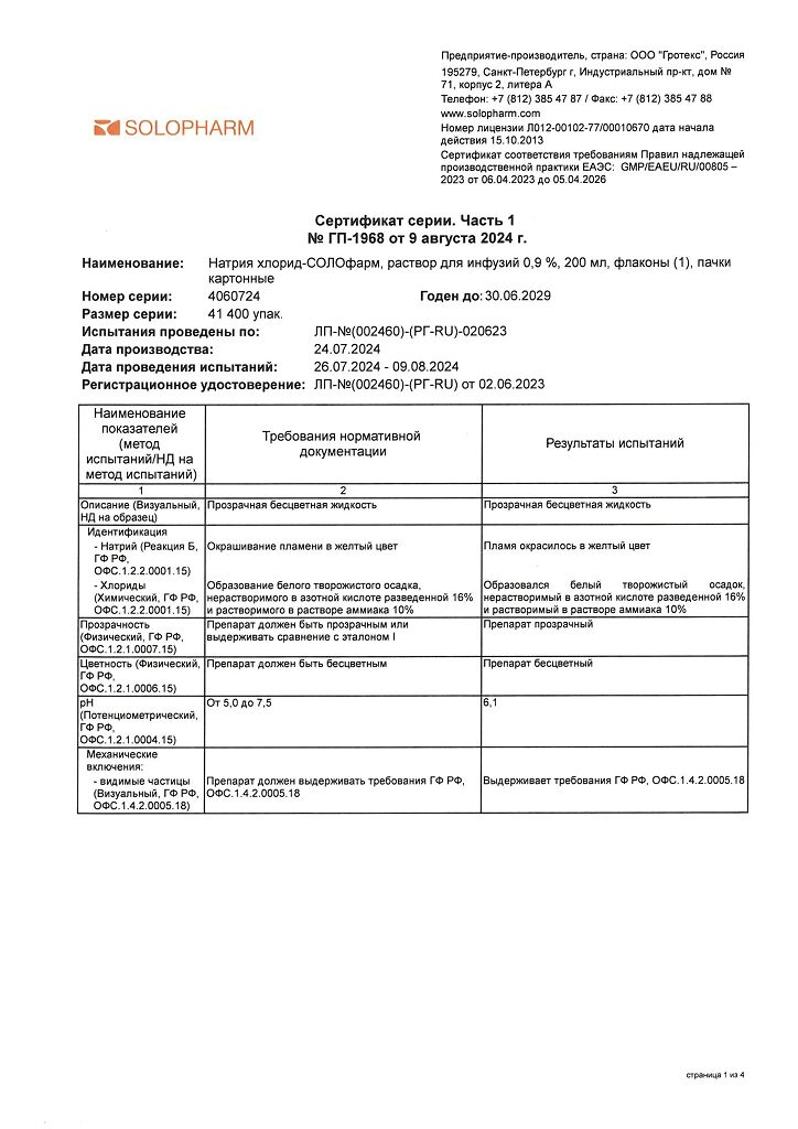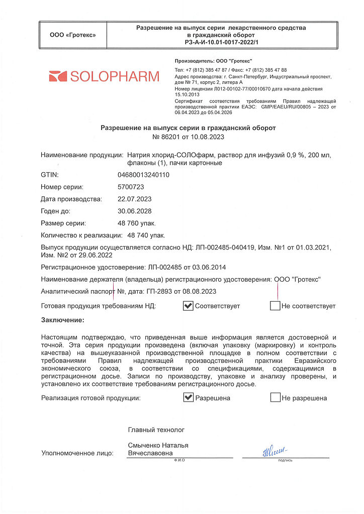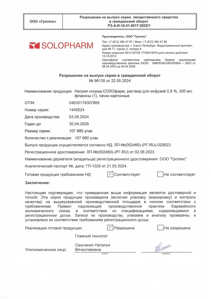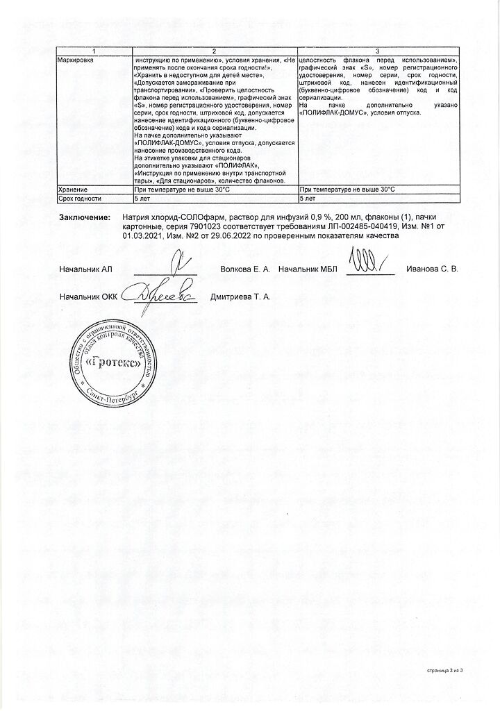 Натрия хлорид-СОЛОфарм Домус раствор для инфузий 0,9 % 200 мл фл 1 шт