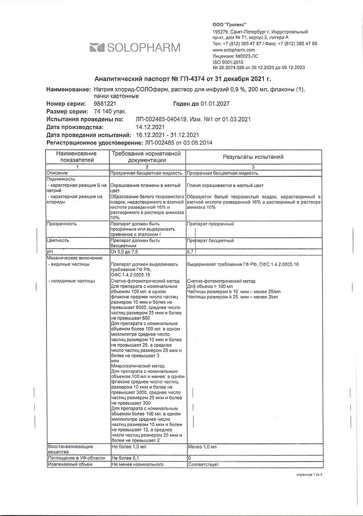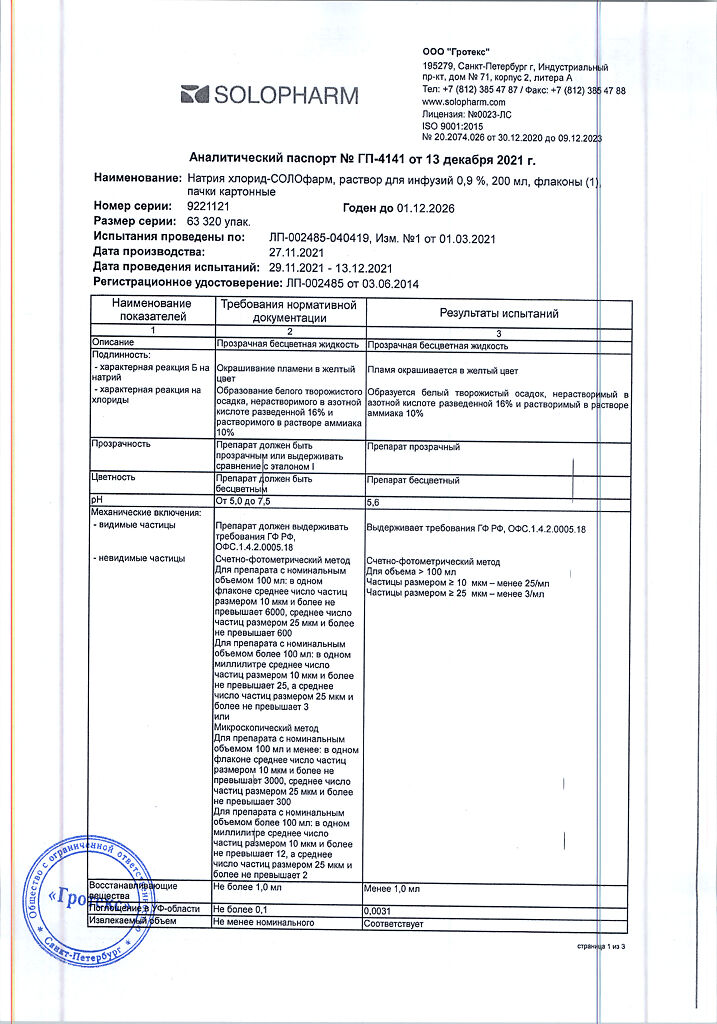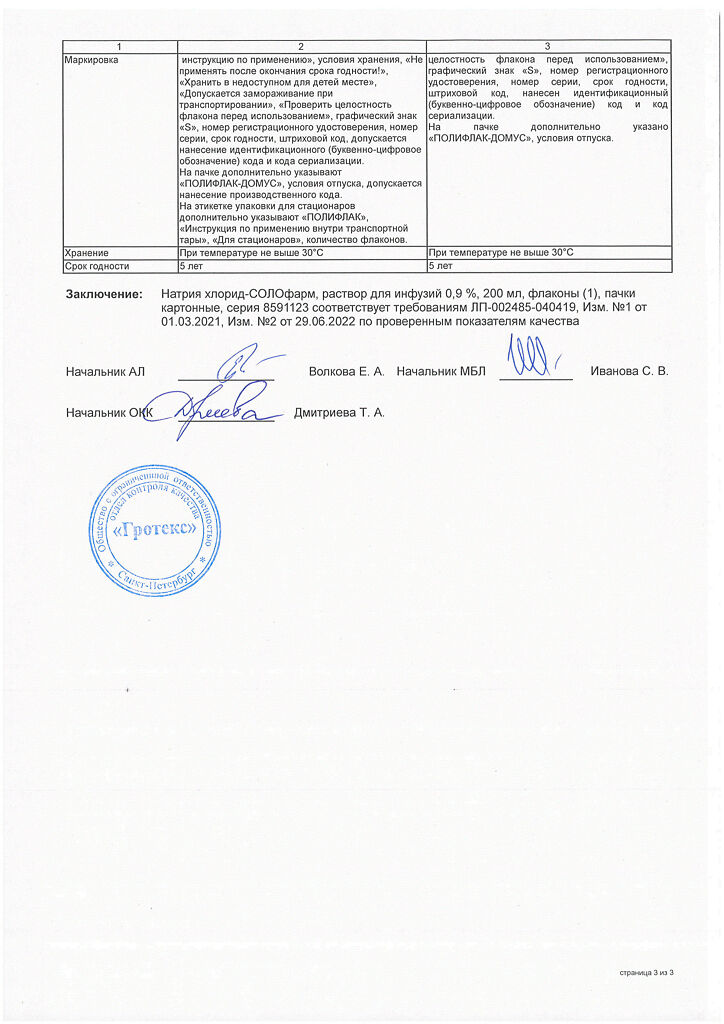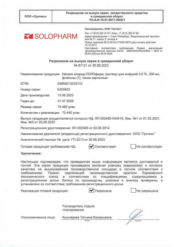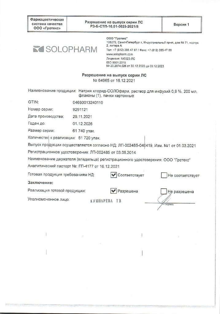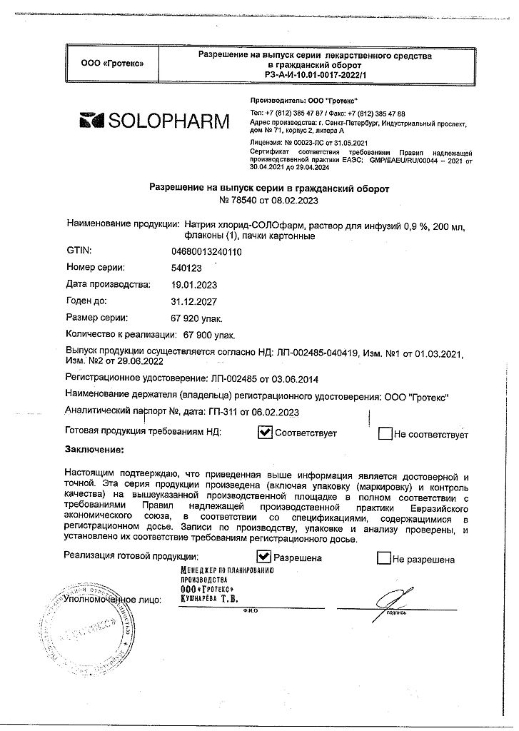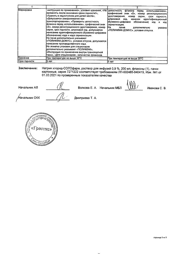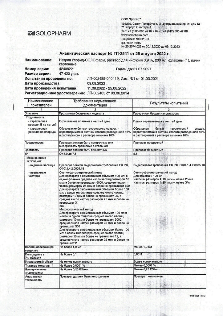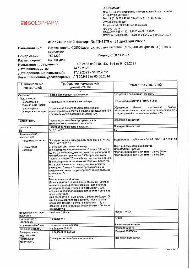 Натрия хлорид-СОЛОфарм Домус раствор для инфузий 0,9 % 200 мл фл 1 шт