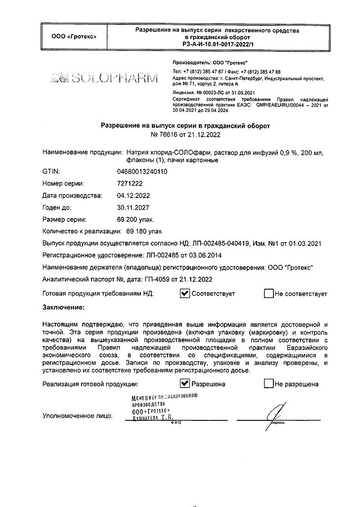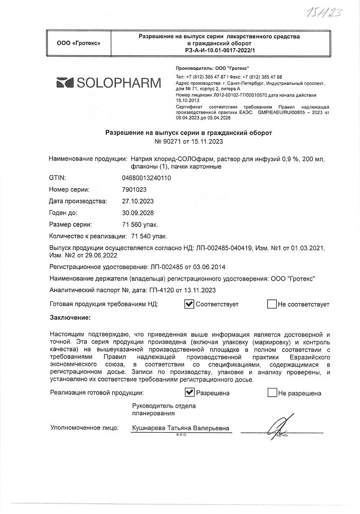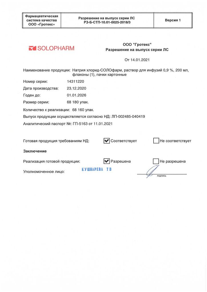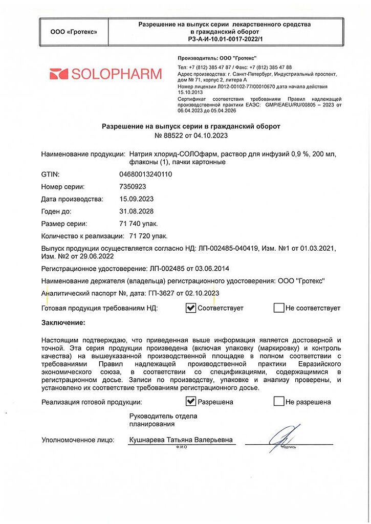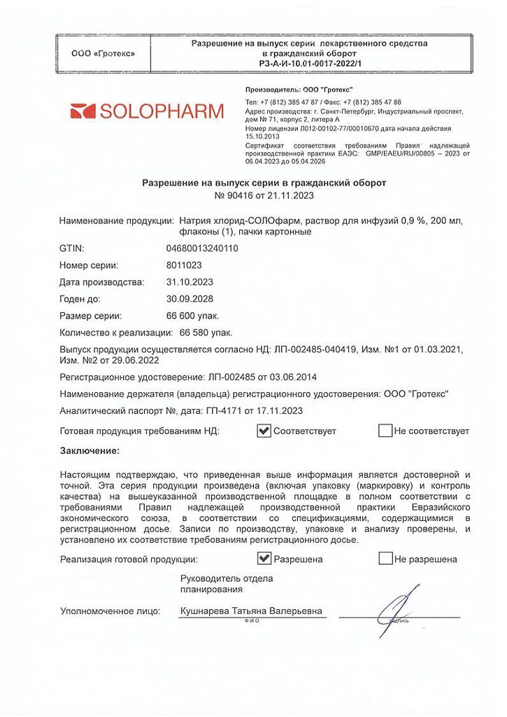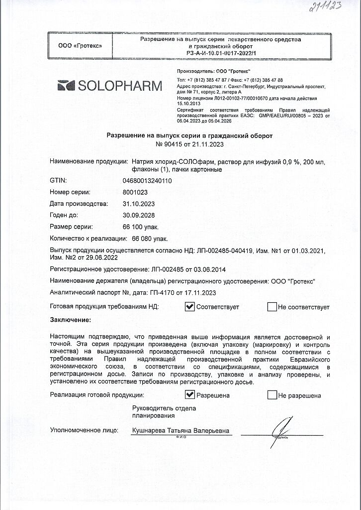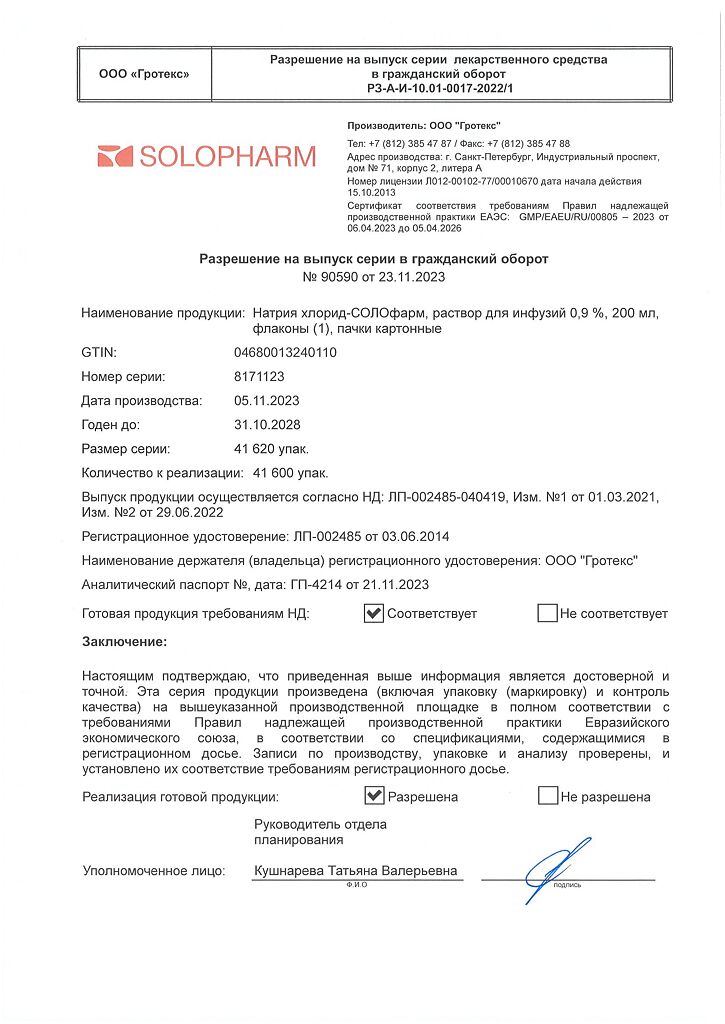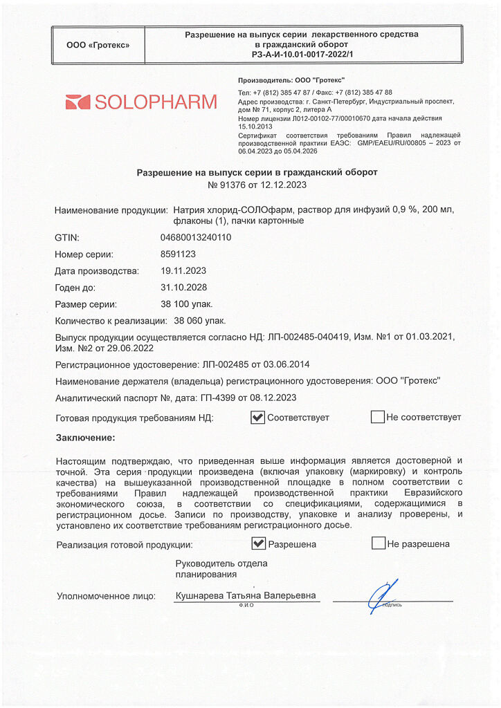 Натрия хлорид-СОЛОфарм Домус раствор для инфузий 0,9 % 200 мл фл 1 шт