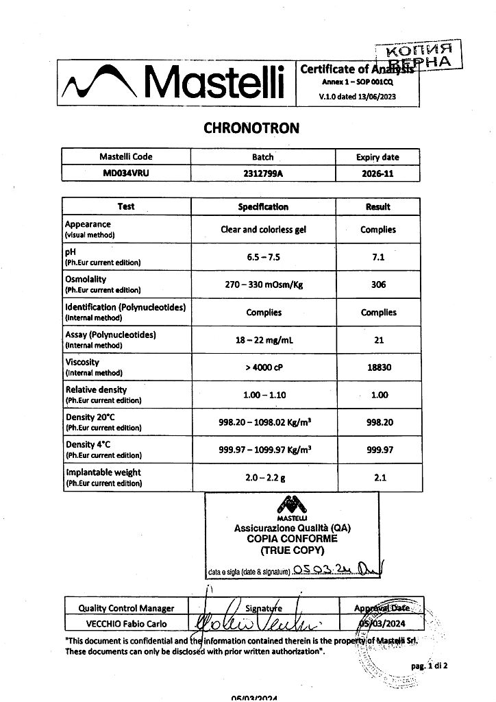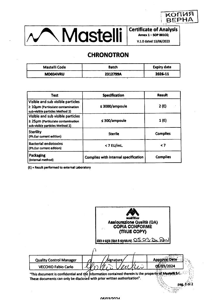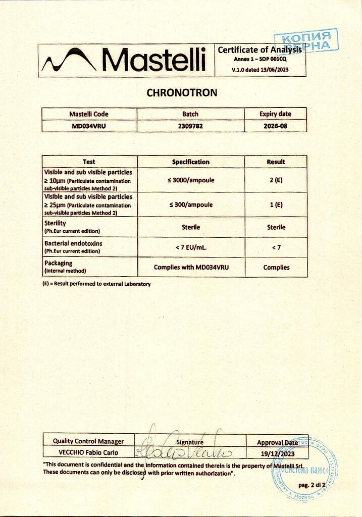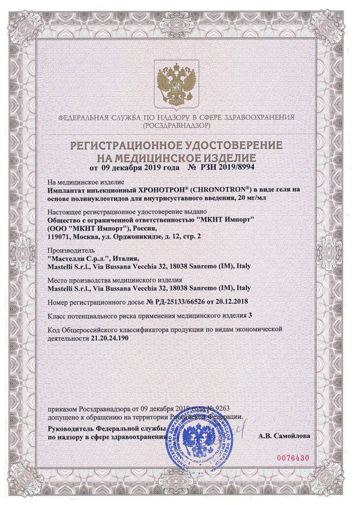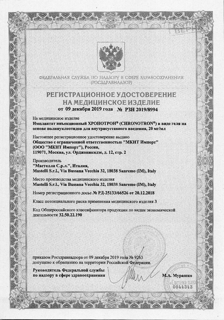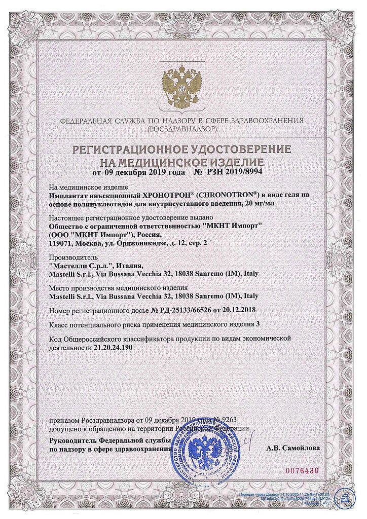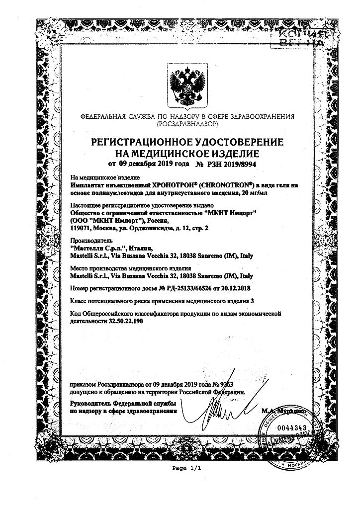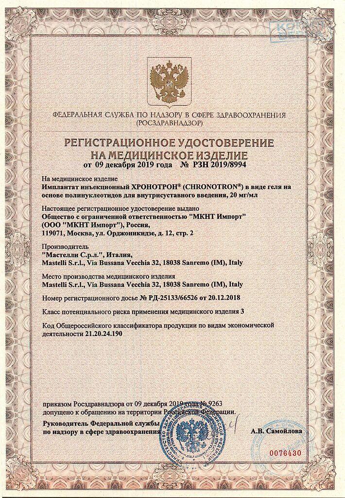 Документы Хронотрон имплантат иньекционный для в/суставного введения 20 мг/мл шприц 2 мл 1 шт