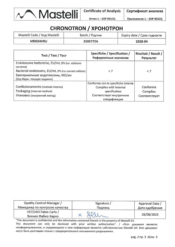Применение продукта Хронотрон® противопоказано пациентам с гиперчувствительностью к любому из компонентов продукта, или с указаниями в анамнезе на случаи аллергических реакций при применении продуктов, полученных из тканей рыб. Инъекции продукта не следует проводить в суставы с признаками инфекционного или выраженного воспалительного процесса, а также в случаях, когда у пациента наблюдается текущая инфекция, локализованная в непосредственной близости от места инъекции, чтобы не допустить развития бактериального артрита. Эффективность и безопасность продукта Хронотрон® не установлены у беременных женщин, у женщин, находящихся в периоде грудного вскармливания, а также у детей.