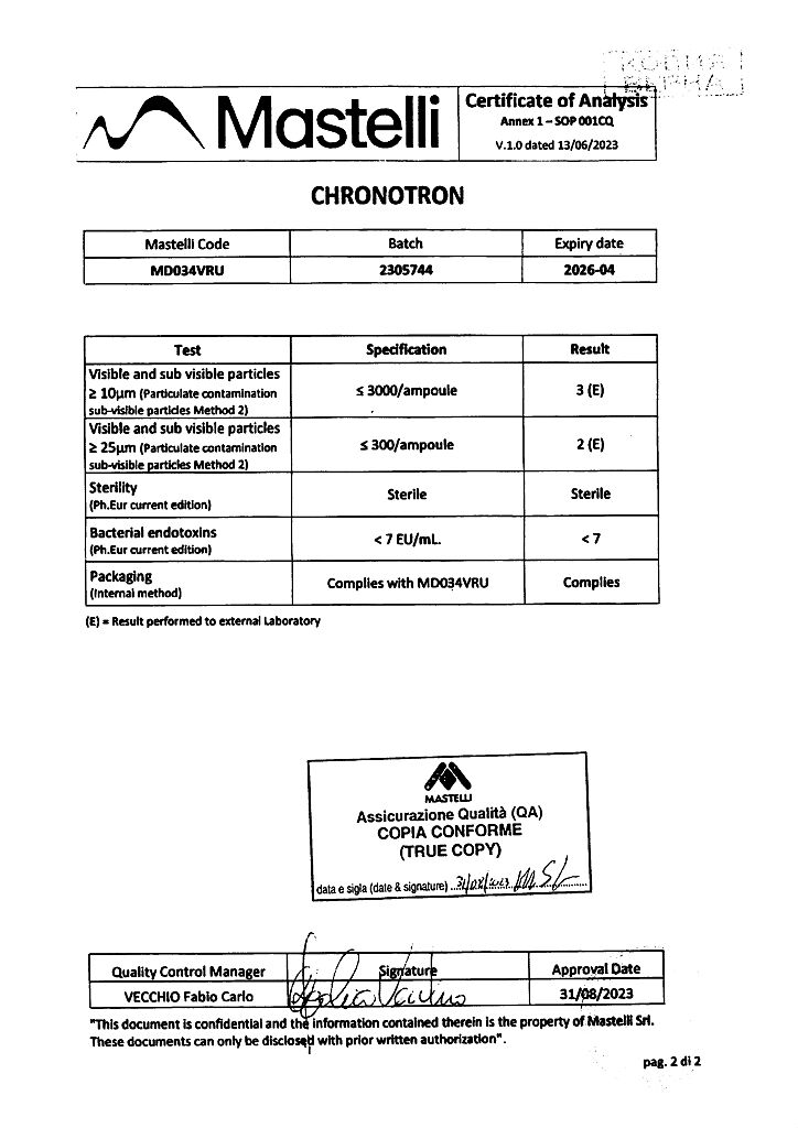 В ходе применения продукта Хронотрон® могут возникать некоторые нежелательные эффекты, связанные с практикой клинического применения внутрисуставных инъекций, в том числе локализованные боли, чувство жара, покраснение и отек. Лечение указанных симптомов может быть проведено посредством обеспечения покоя для сустава и прикладывания льда к суставу, купирование этих симптомов, как правило, наступает в течение непродолжительного периода времени. В случае сохранения симптомов следует обратиться к врачу. Врачи должны уведомить пациентов о необходимости сообщать им о любых нежелательных явлениях, которые могут развиться после лечения.