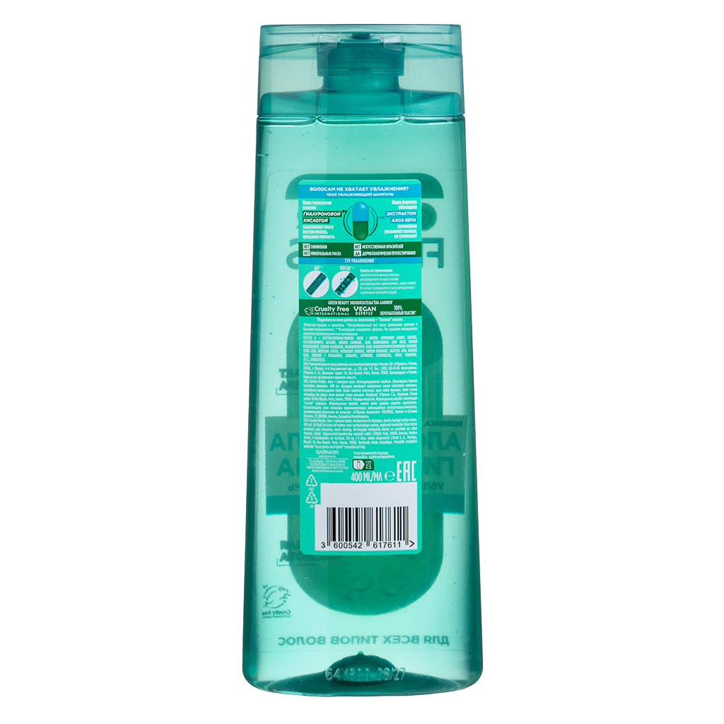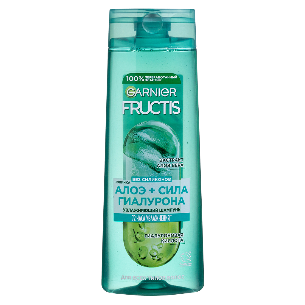 Шампунь от Garnier Fructis — «Алоэ + Сила гиалурона». В составе шампуня экстракт алоэ, известный своими увлажняющими свойствами, и гиалуроновая кислота, способная удерживать молекулы воды в 100 раз больше собственного веса. Действуя совместно, они насыщают влагой каждый волосок, шампунь обеспечивает 72 часа непрерывного увлажнения*.