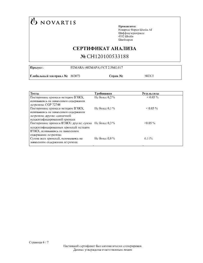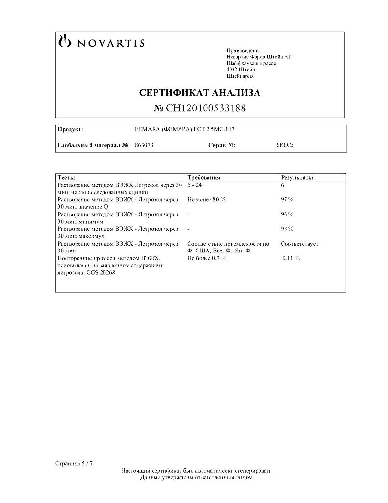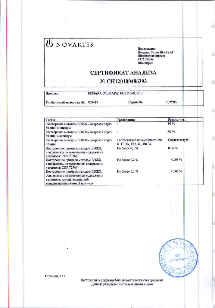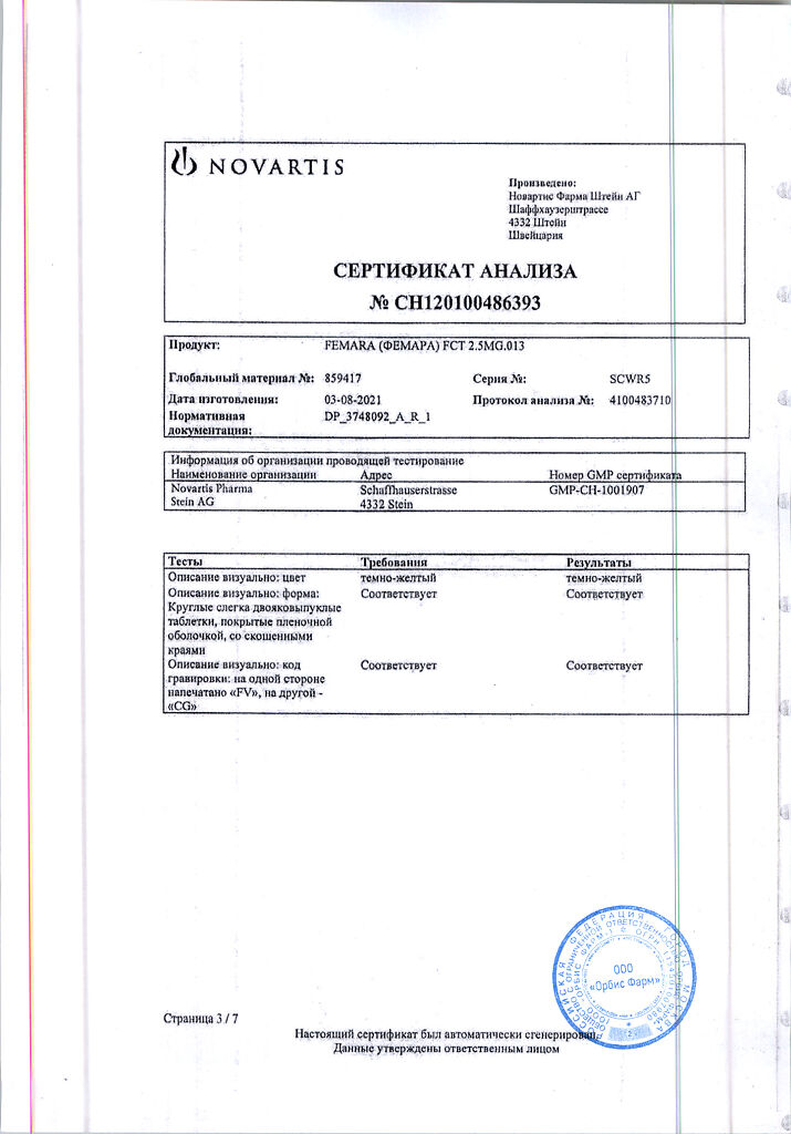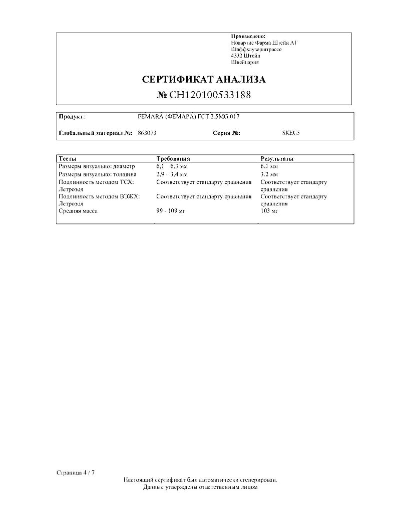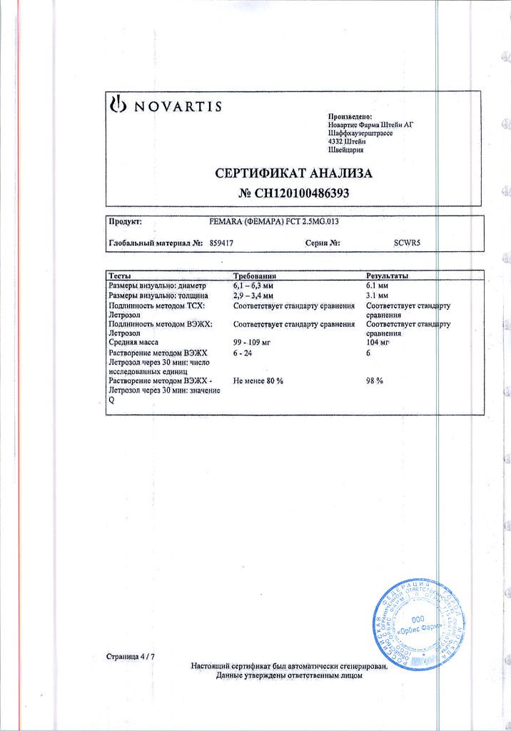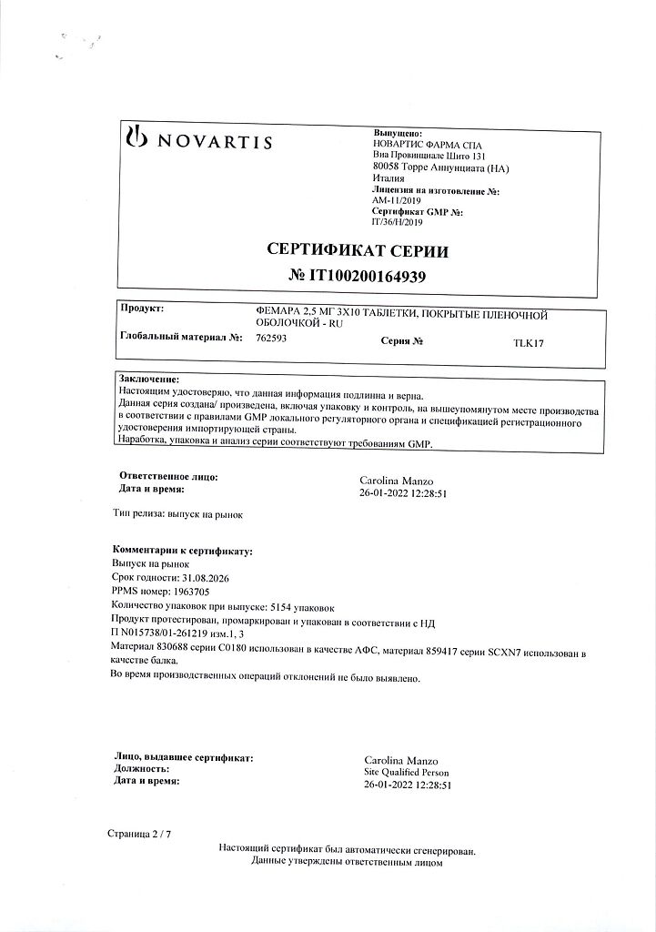 Для взрослых рекомендуемая доза препарата Фемара® составляет 2,5 мг 1 раз/сутки, ежедневно длительно.